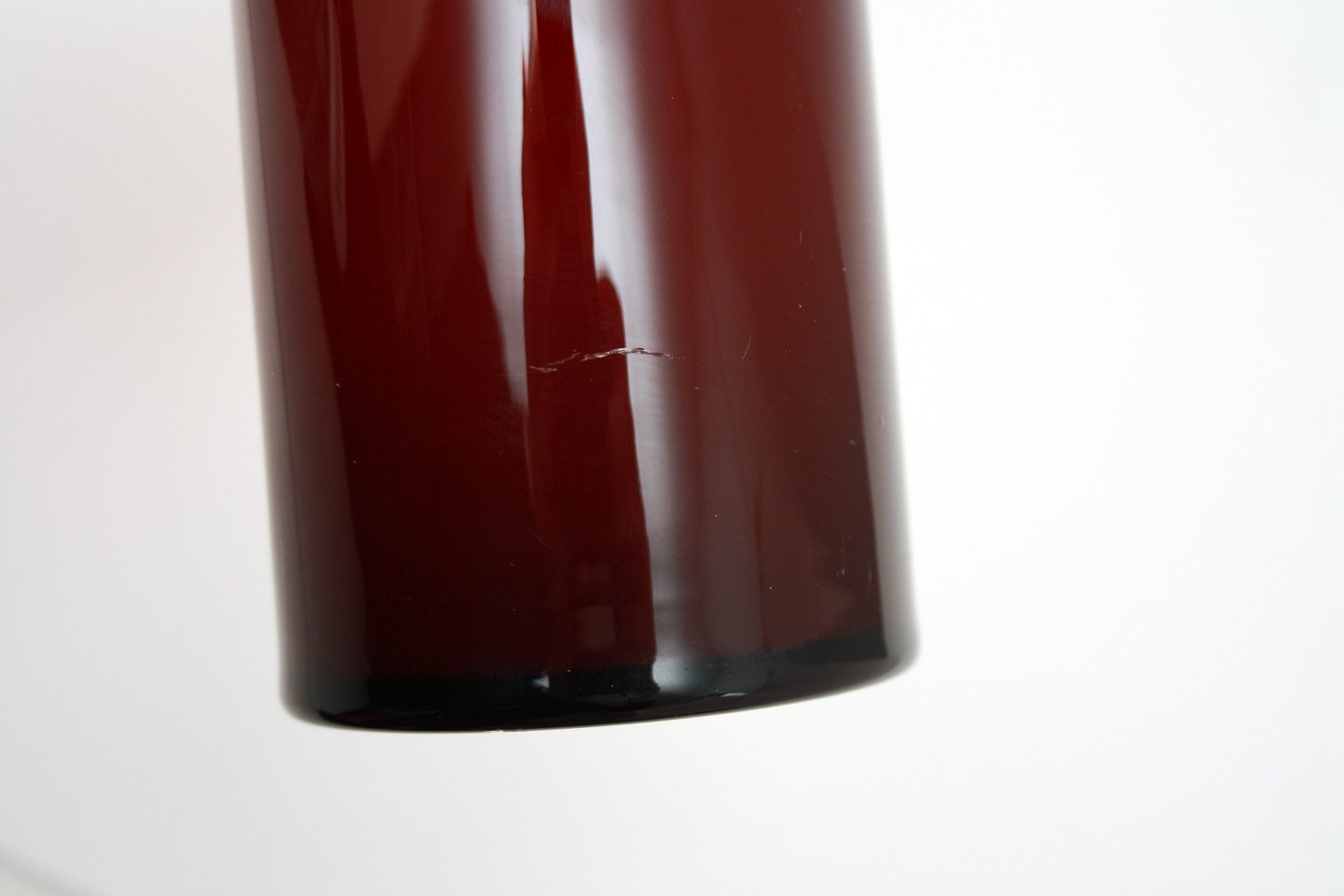 Rød cylinderformet vase hvid indvendig. Højde 24 cm. Diameter 7 cm. Fremstår med ridse, se ekstra foto. Pris: 250 kr.
