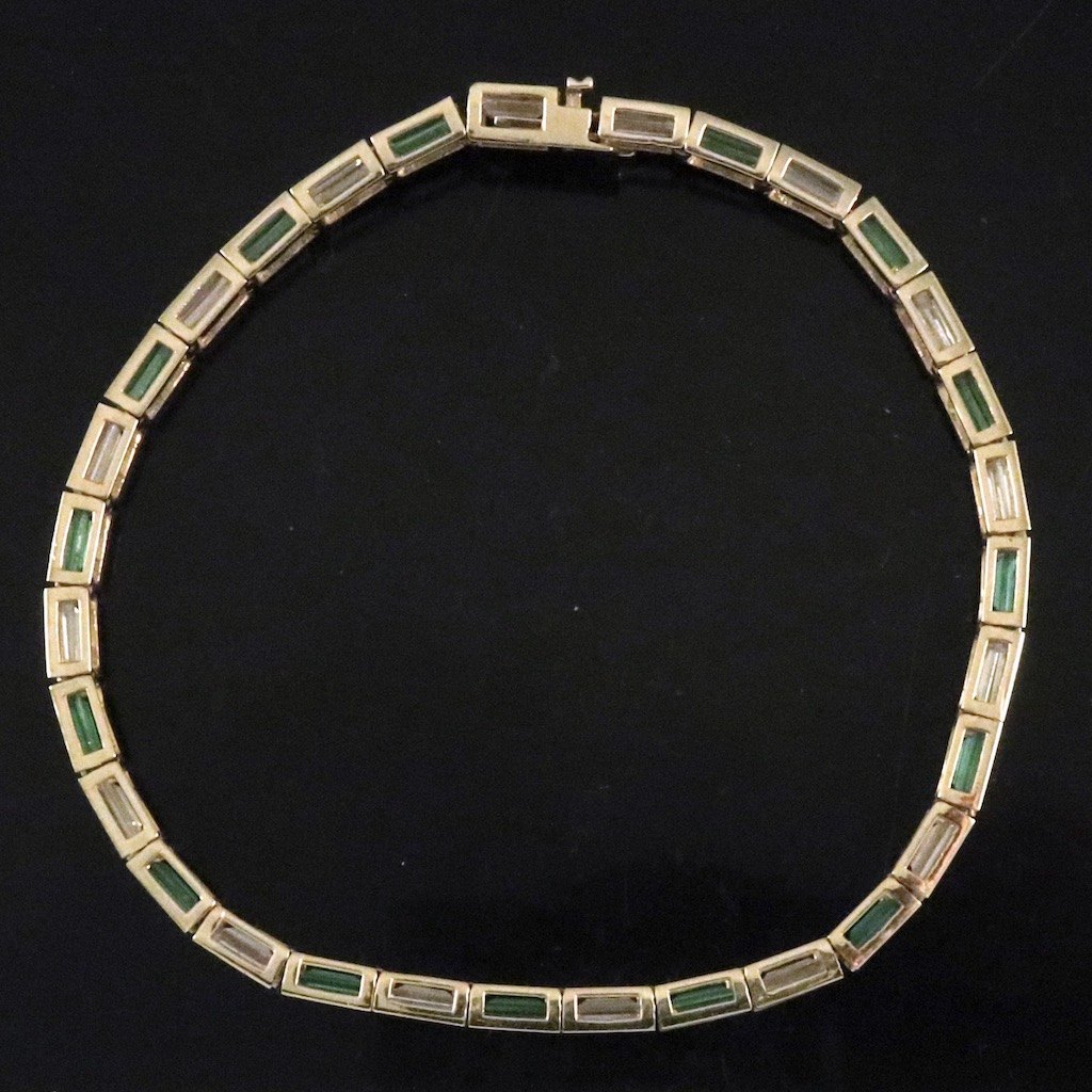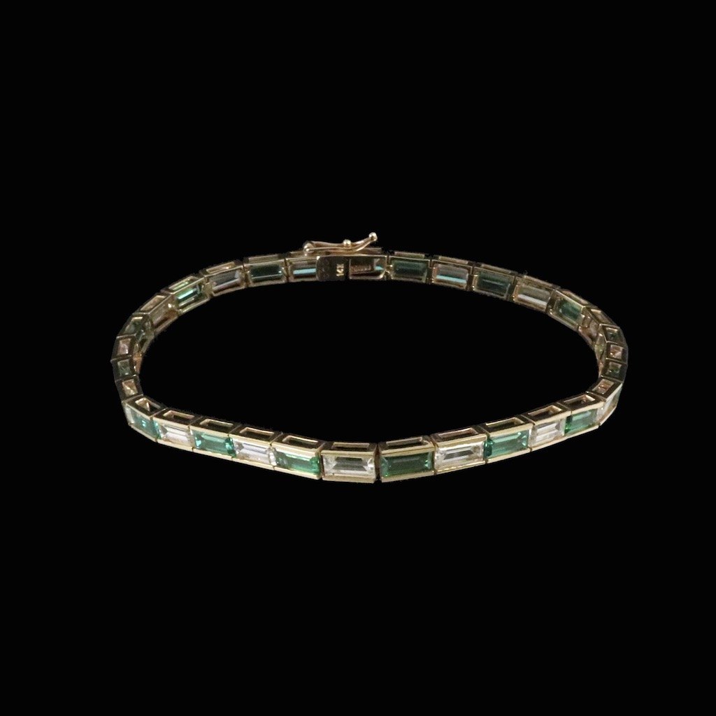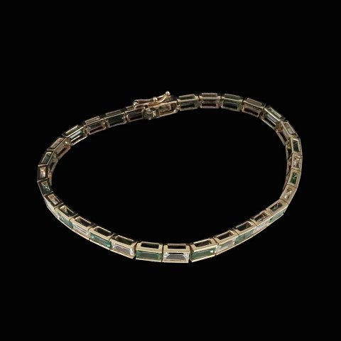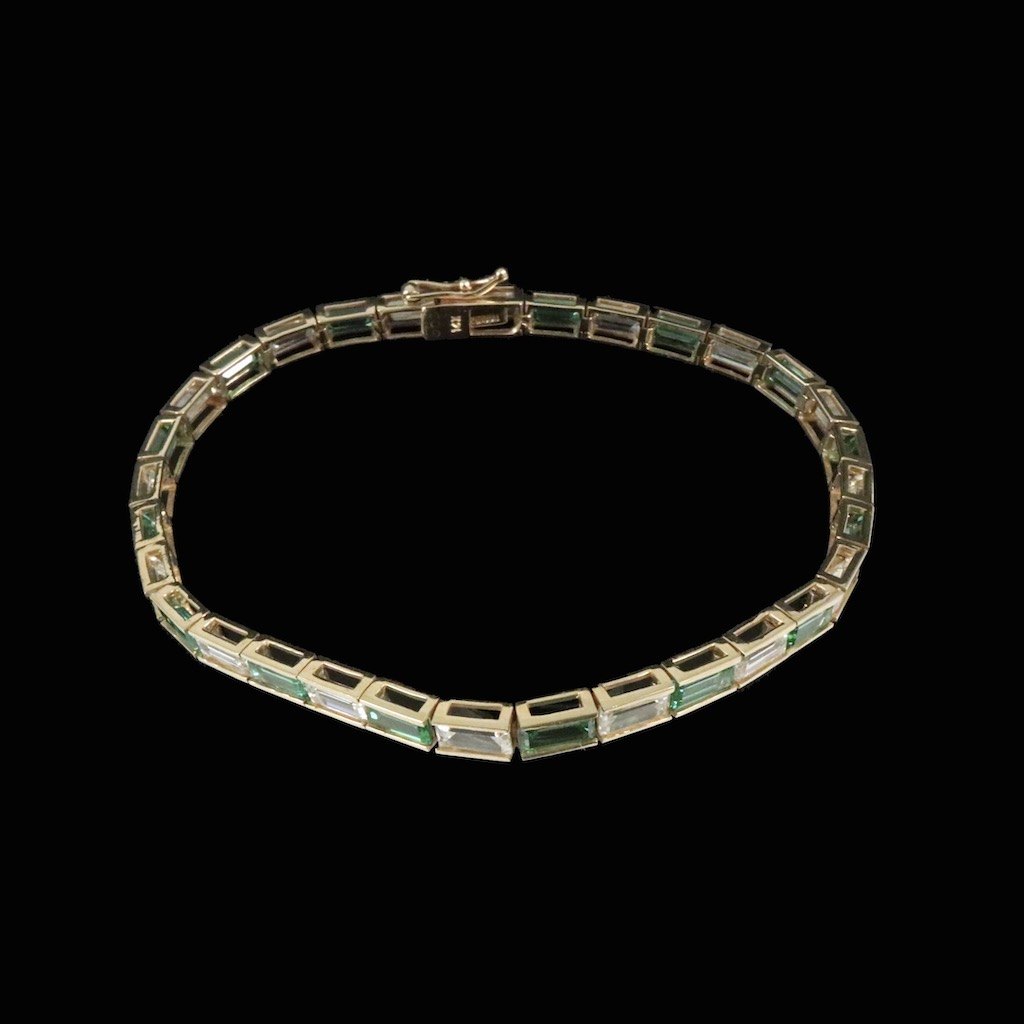 Armbånd i 14k guld med grøn sten og bjergkrystal.