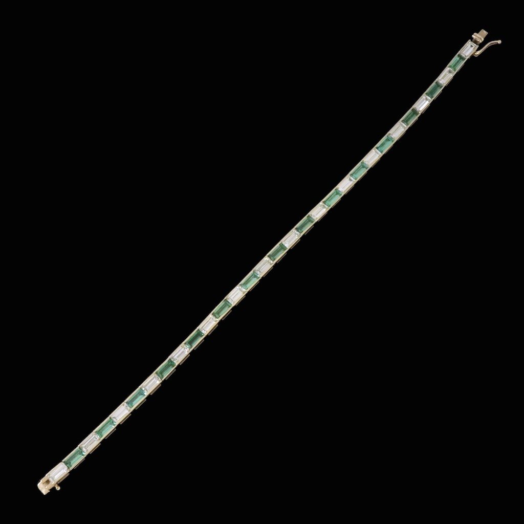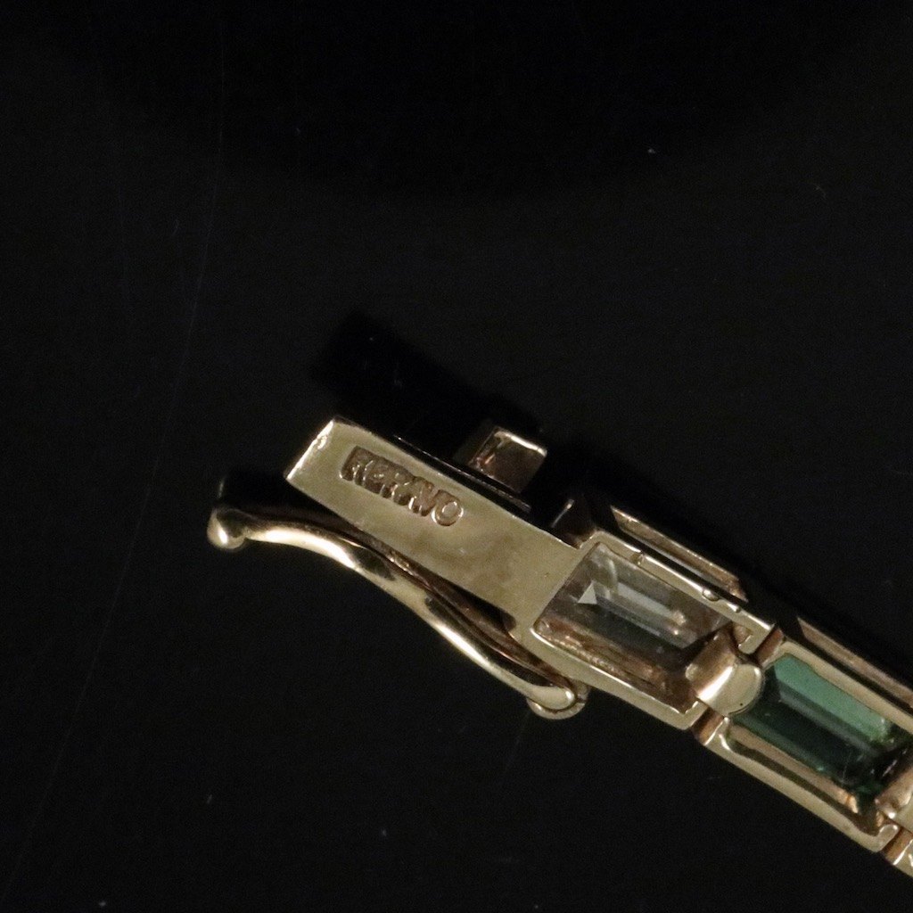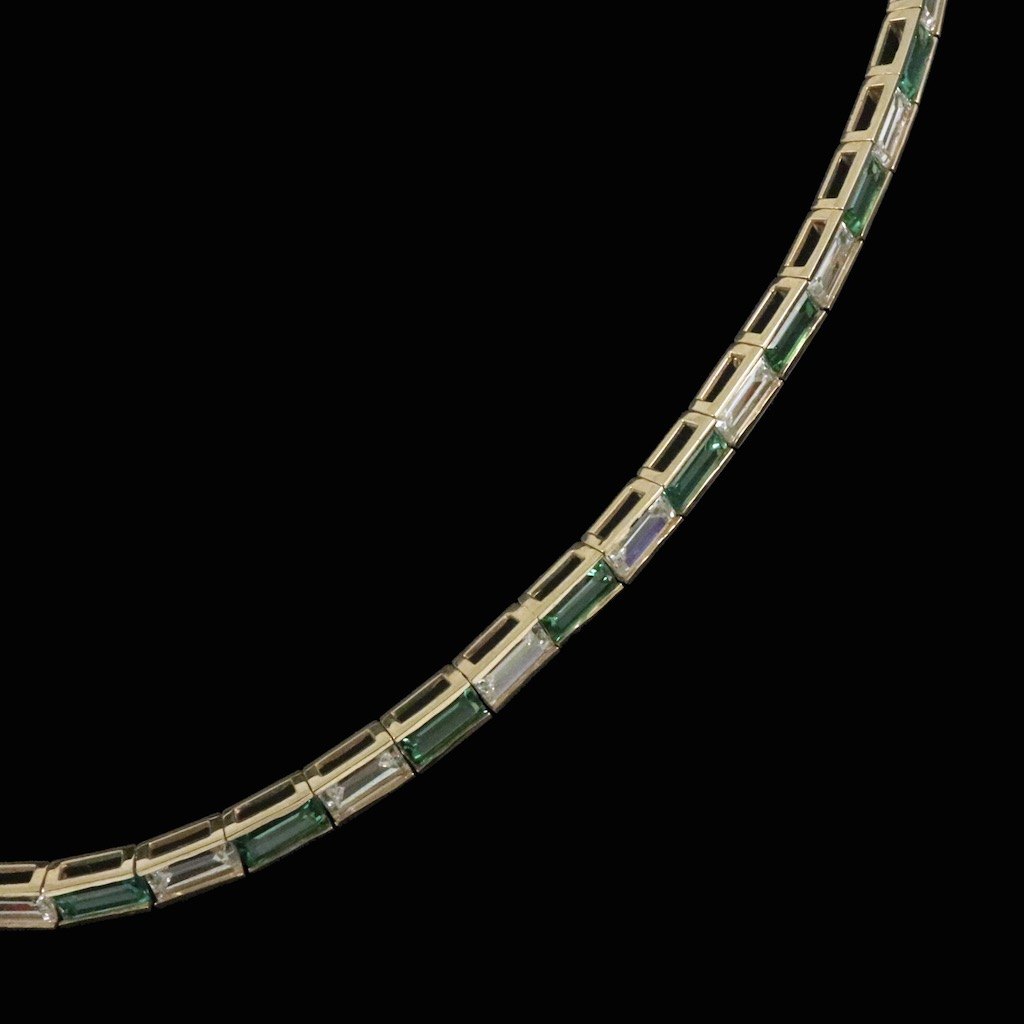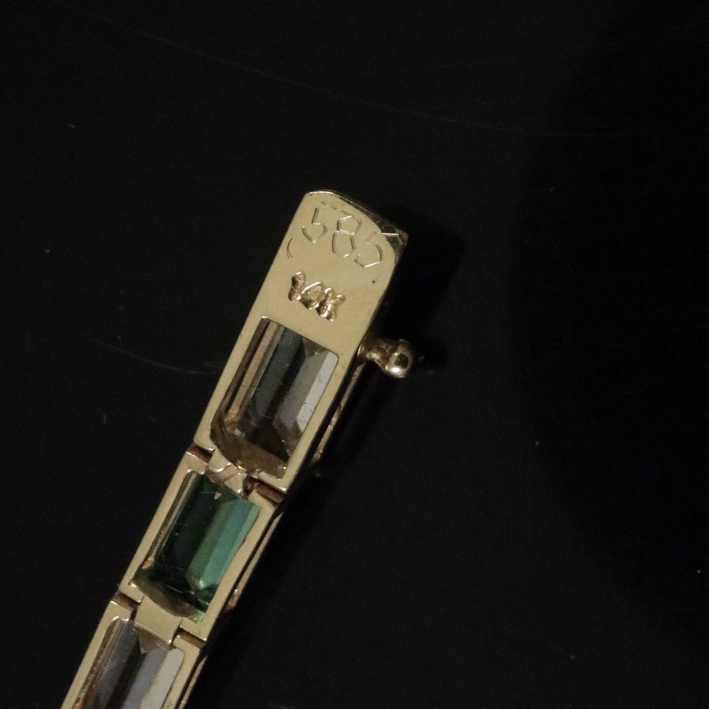 Armbånd i 14k guld med grøn sten og bjergkrystal.