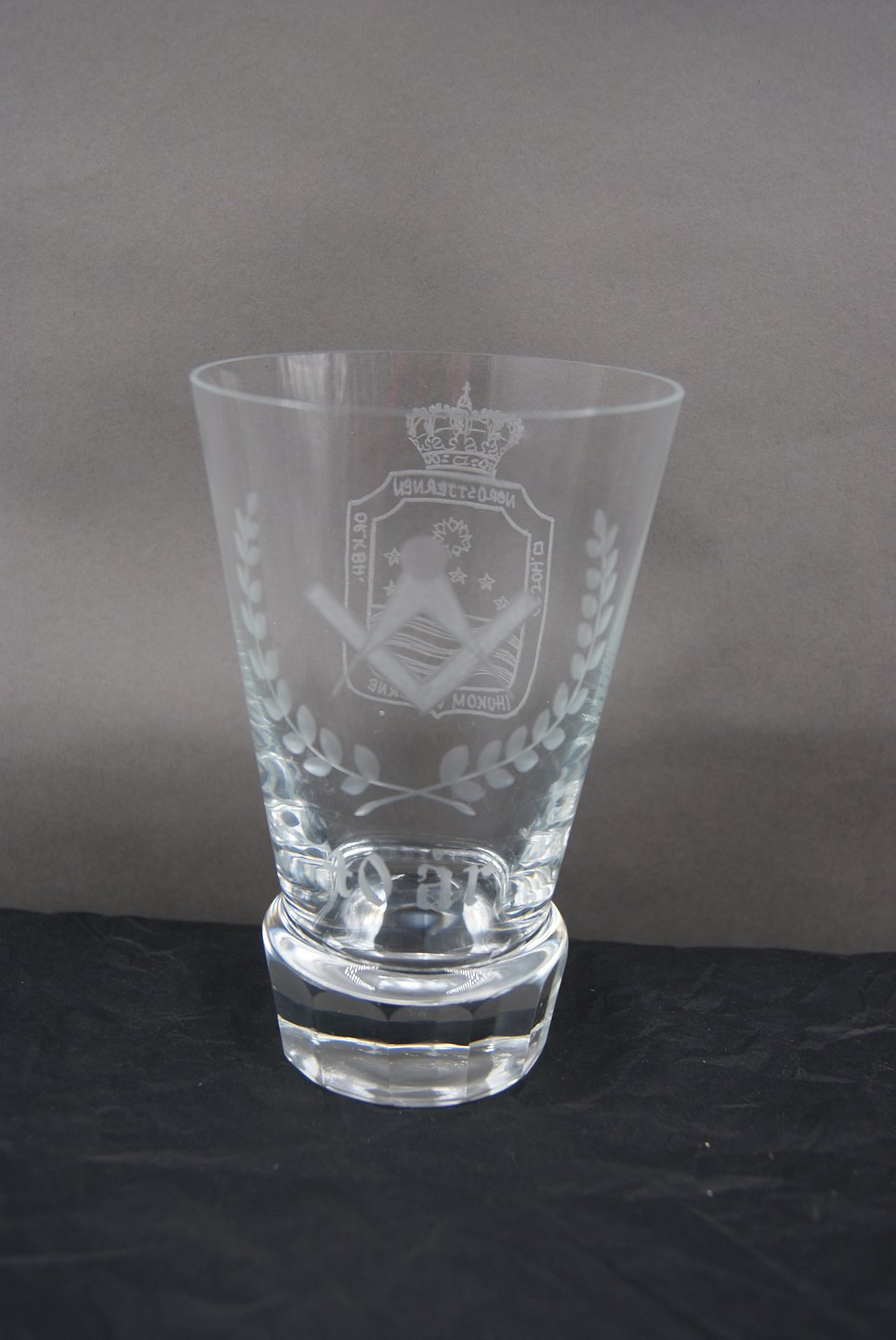 Frimurerglas til Syvstjernen i Aalborg, ølglas dekoreret med slebne symboler, på kantsleben fod