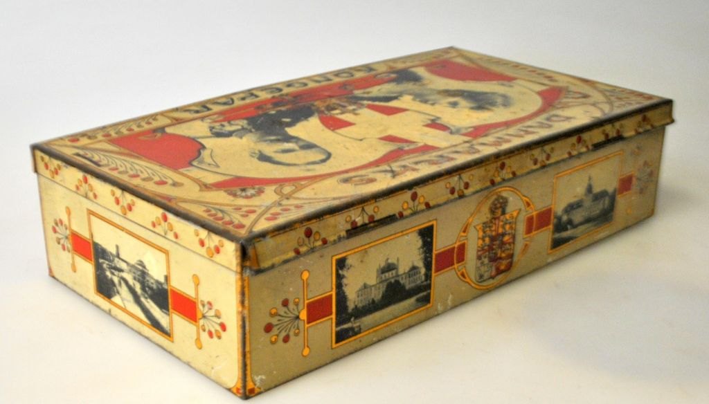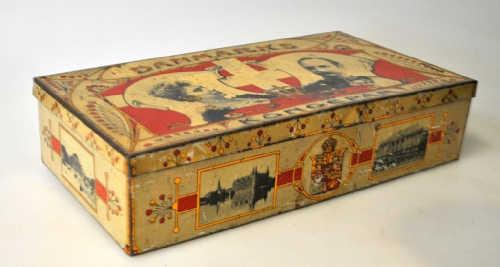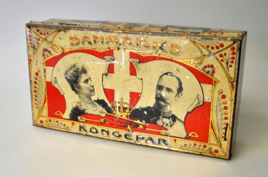 Tin box, tobacco tin, decorated with Denmark's royal couple - Frederik VIII and Queen Louise. Frederik VIII was king between 1906 - 1912. The sides are decorated with Danish buildings and castles. 21 x 11 x 4.8 cm.
