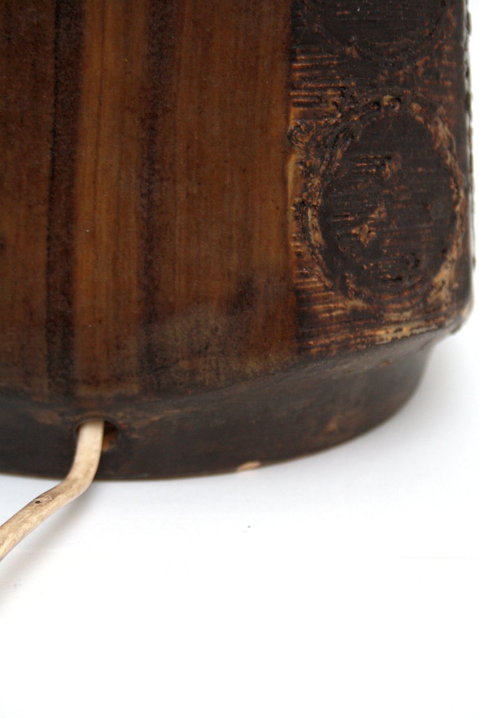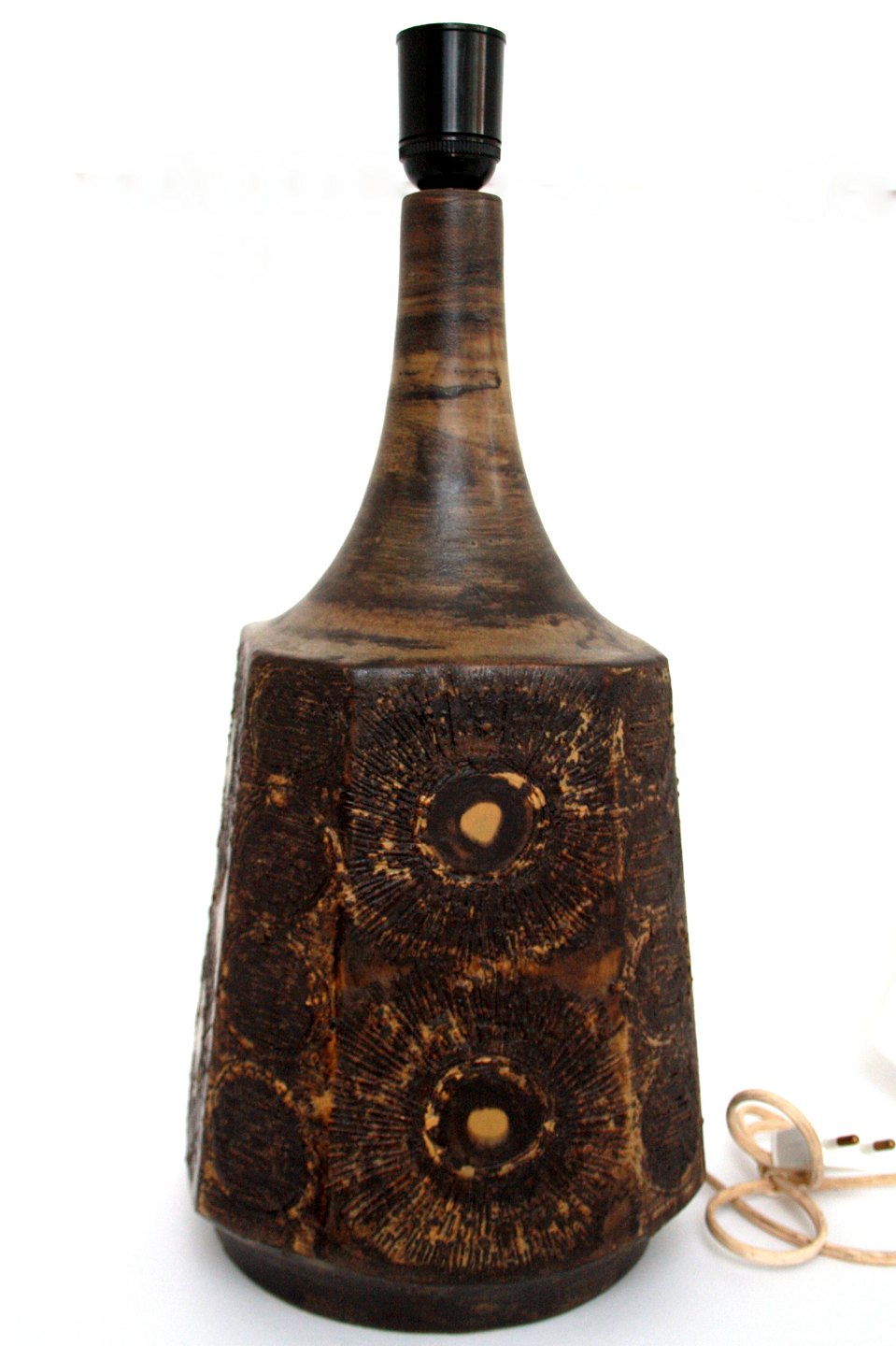 Bjørn Keramik, Bordlampe i brun glasur med blomst motiver. Højde excl. fatning 42 cm. Diameter bund 19,5 cm. Glasurafslag i bund se ekstra foto. Pris: 550 kr.