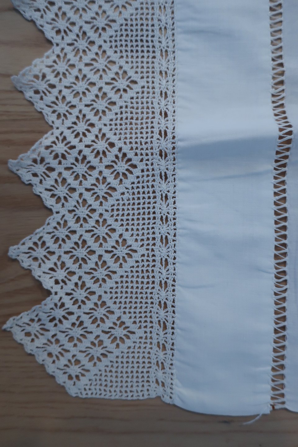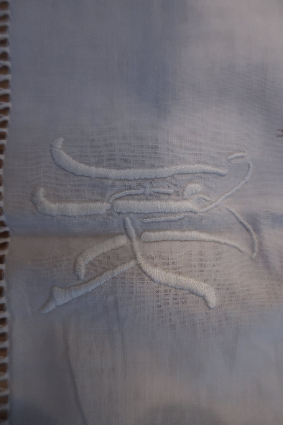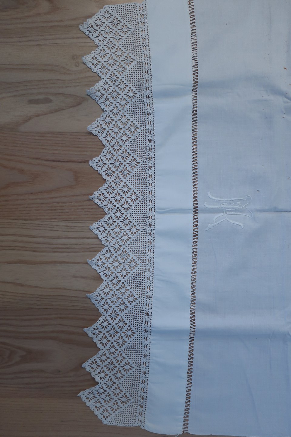 Smukt gammelt paradestykke med hvid håndhæklet bort og initialer