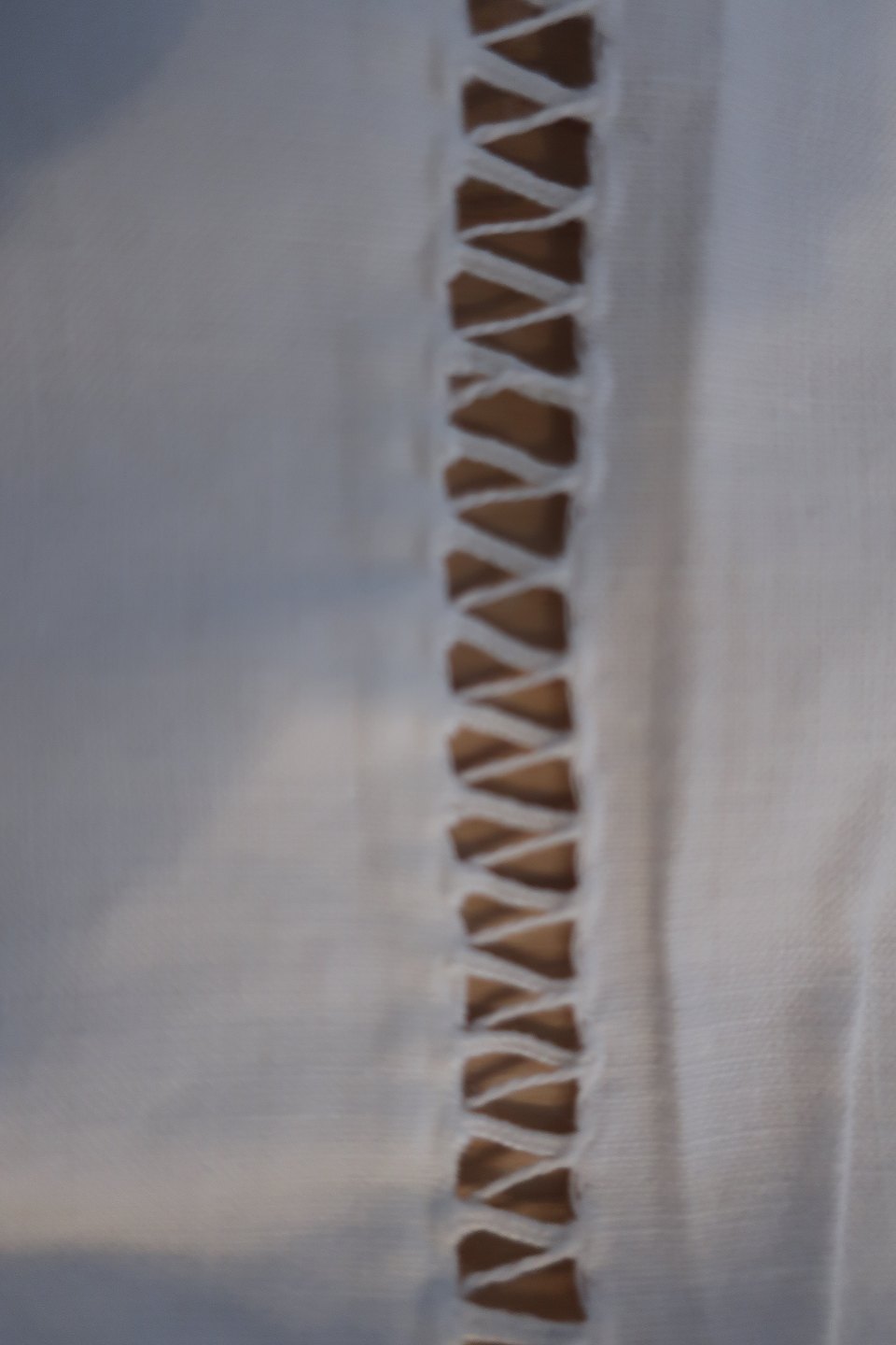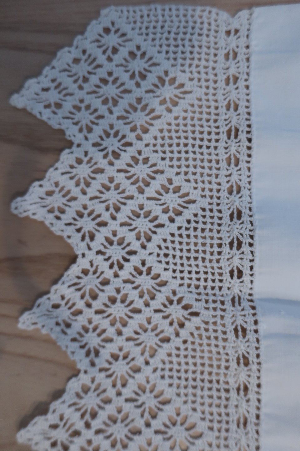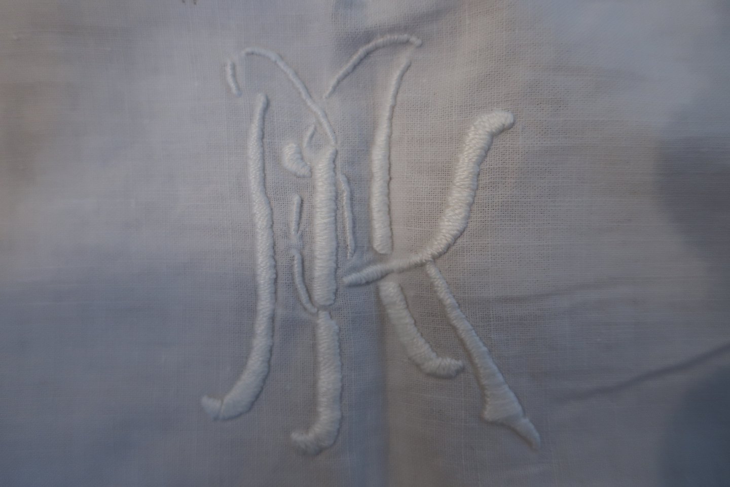 Smukt gammelt paradestykke med hvid håndhæklet bort og initialer