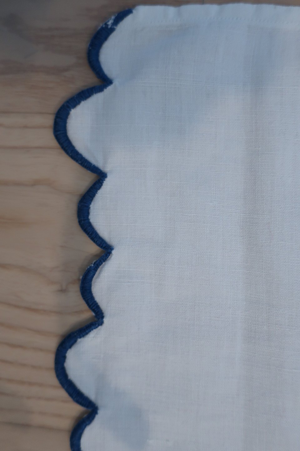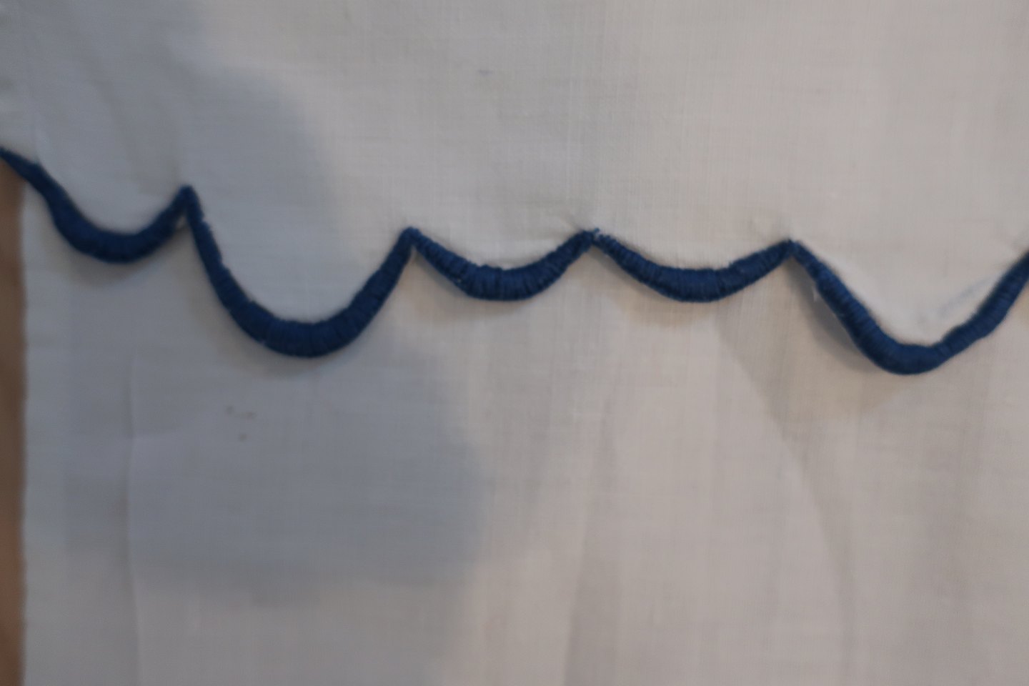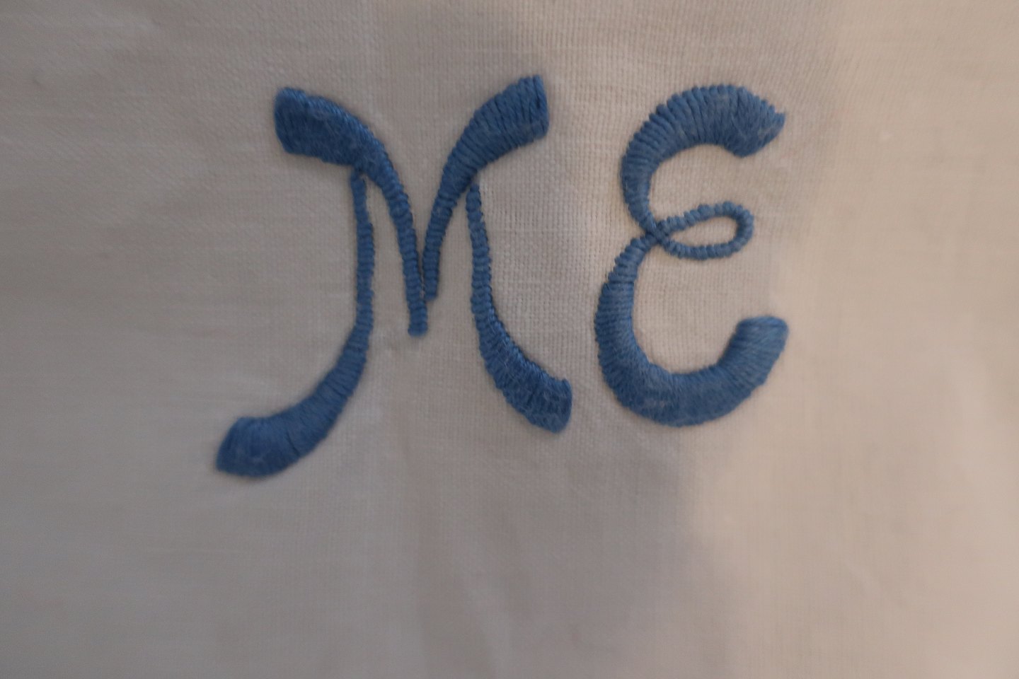 Smukt gammelt paradestykke med blåt håndbroderi og initialer