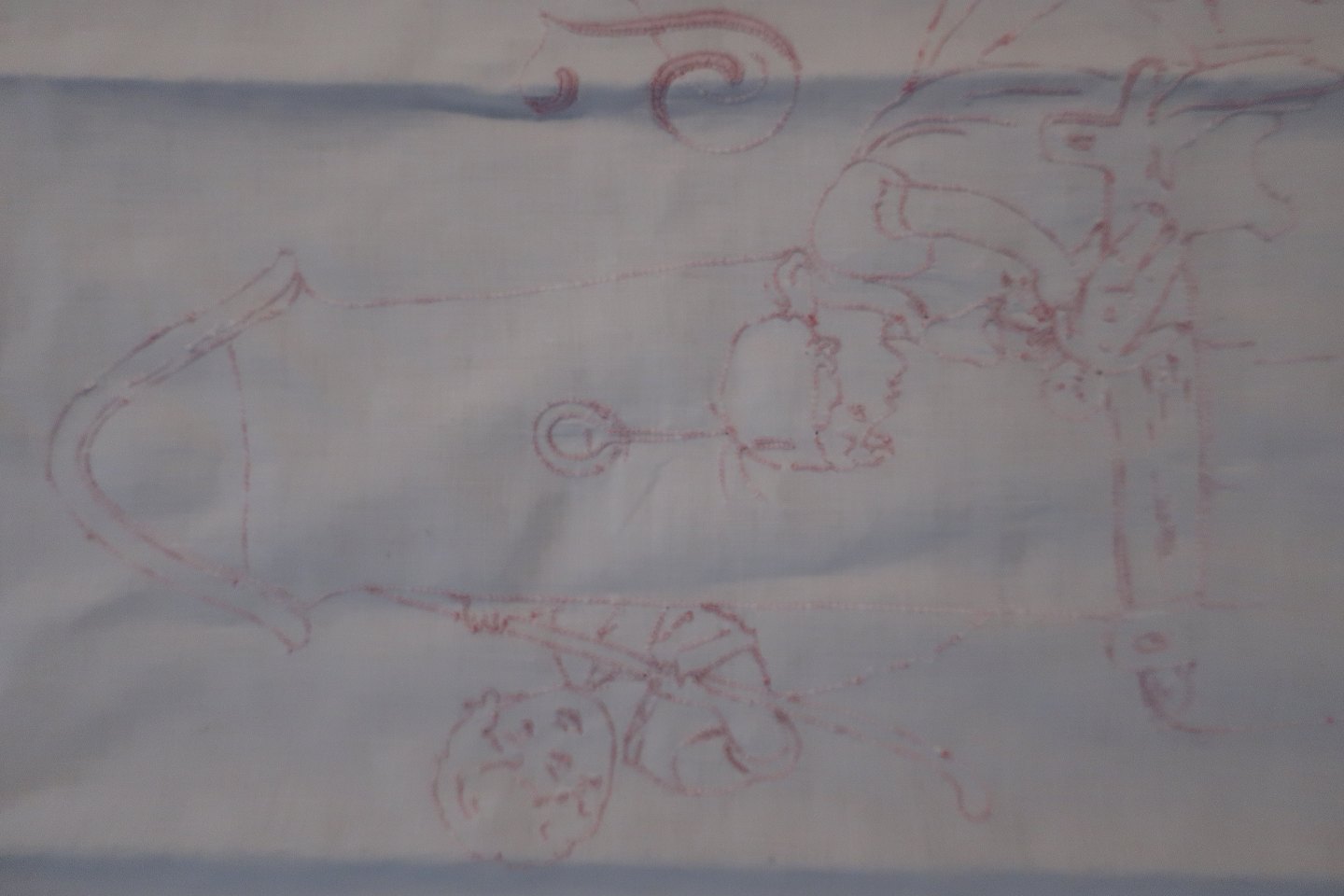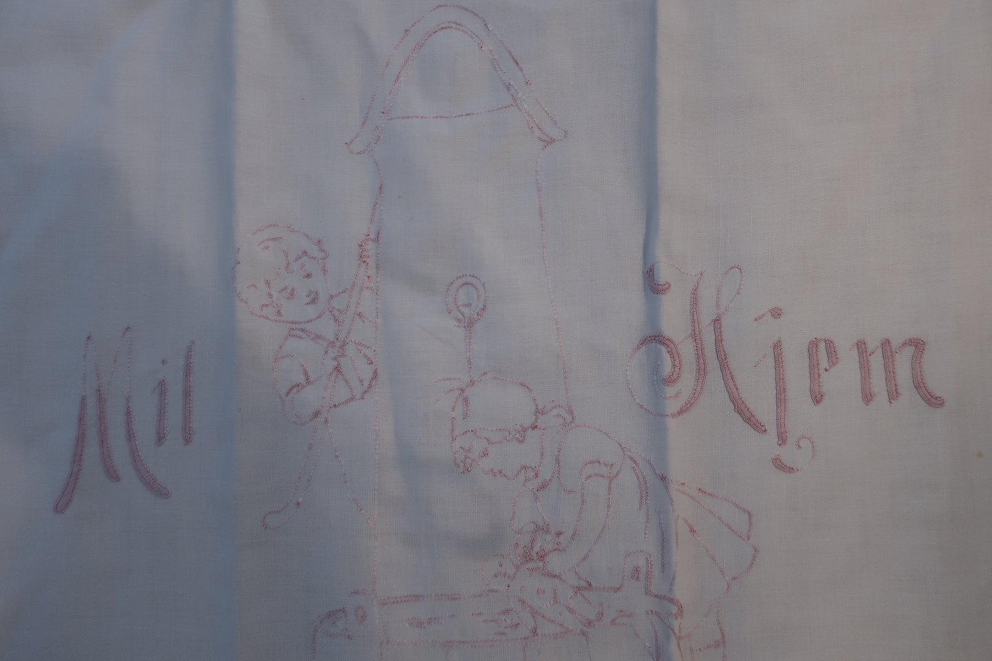 Smukt gammelt paradestykke med lyserødt håndbroderi