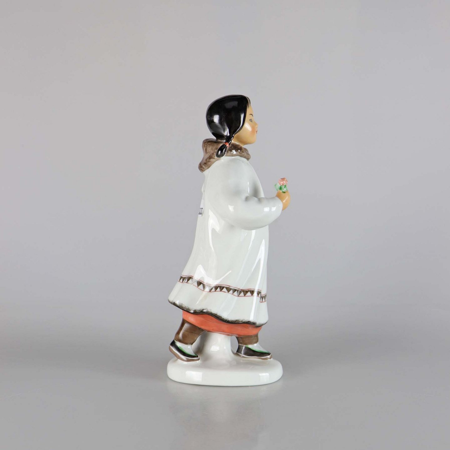 Russisk porcelænsfigur af en pige med blomst og bog