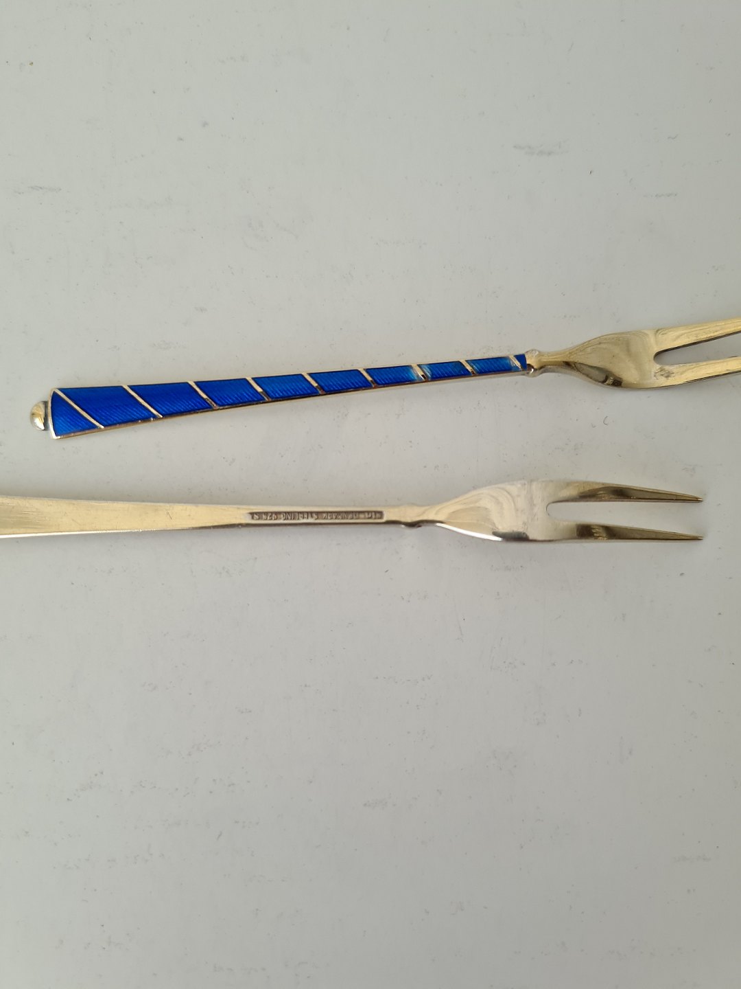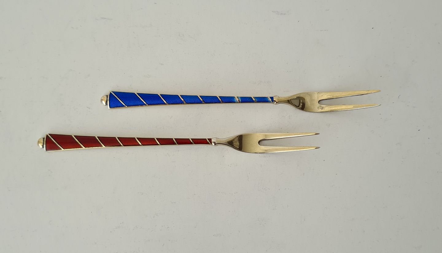 Lille pålægsgaffel - cocktail gaffel i forgyldt sterlingsølv og emalje