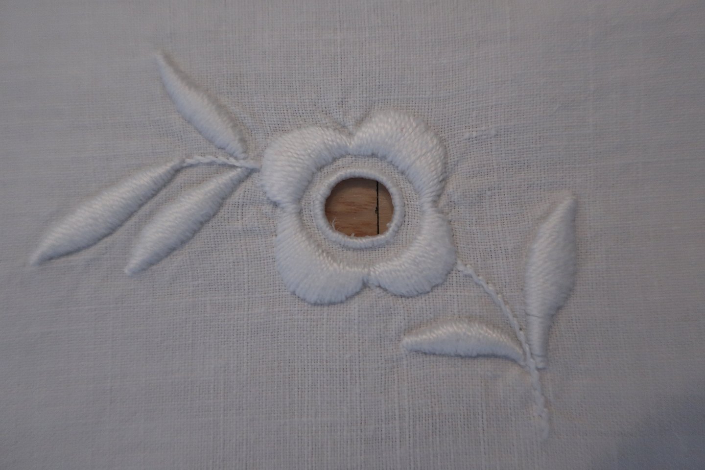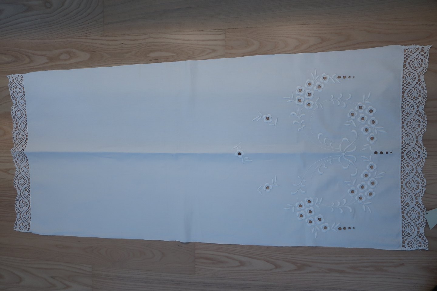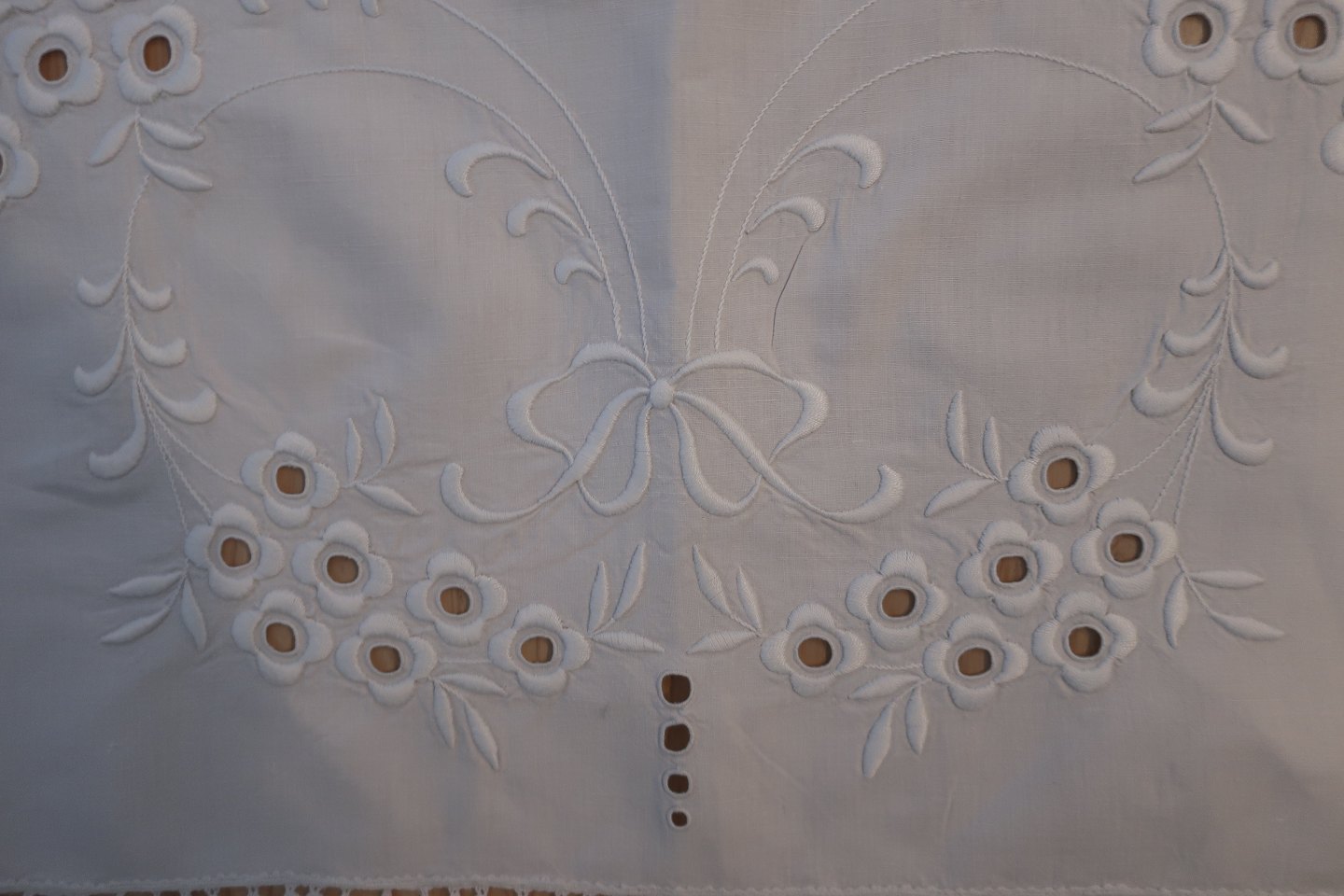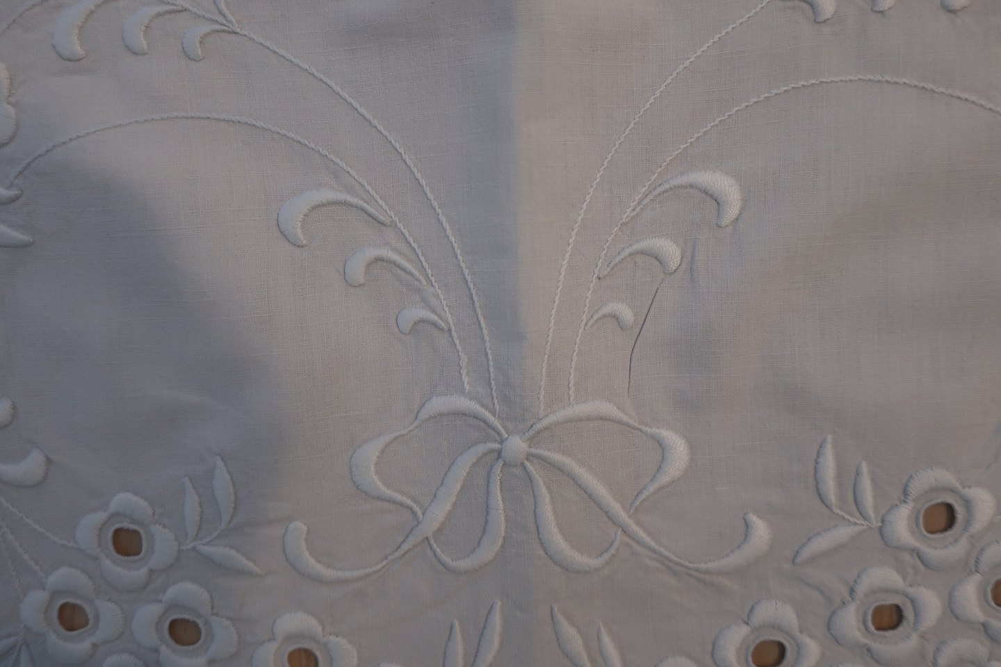 Smukt gammelt paradestykke med hvidt håndbroderi, hulmønster