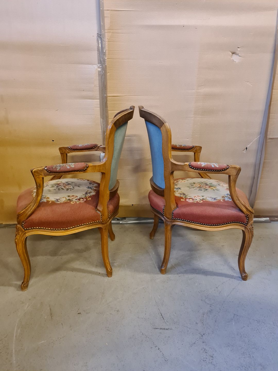 2 Stole i massivt bøgetræ med broderet betræk, fra 1950erne.
