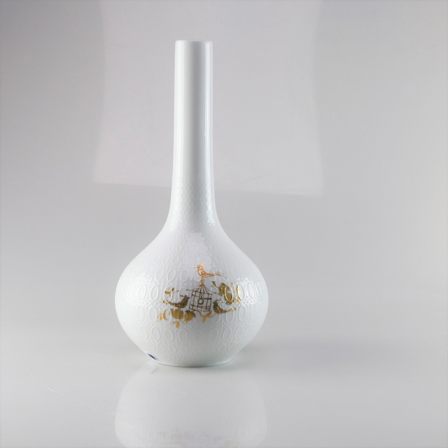 Hvid vase i porcelæn med motiver af fugle i guld