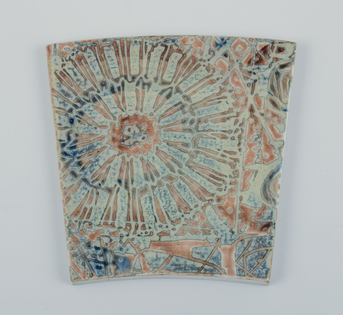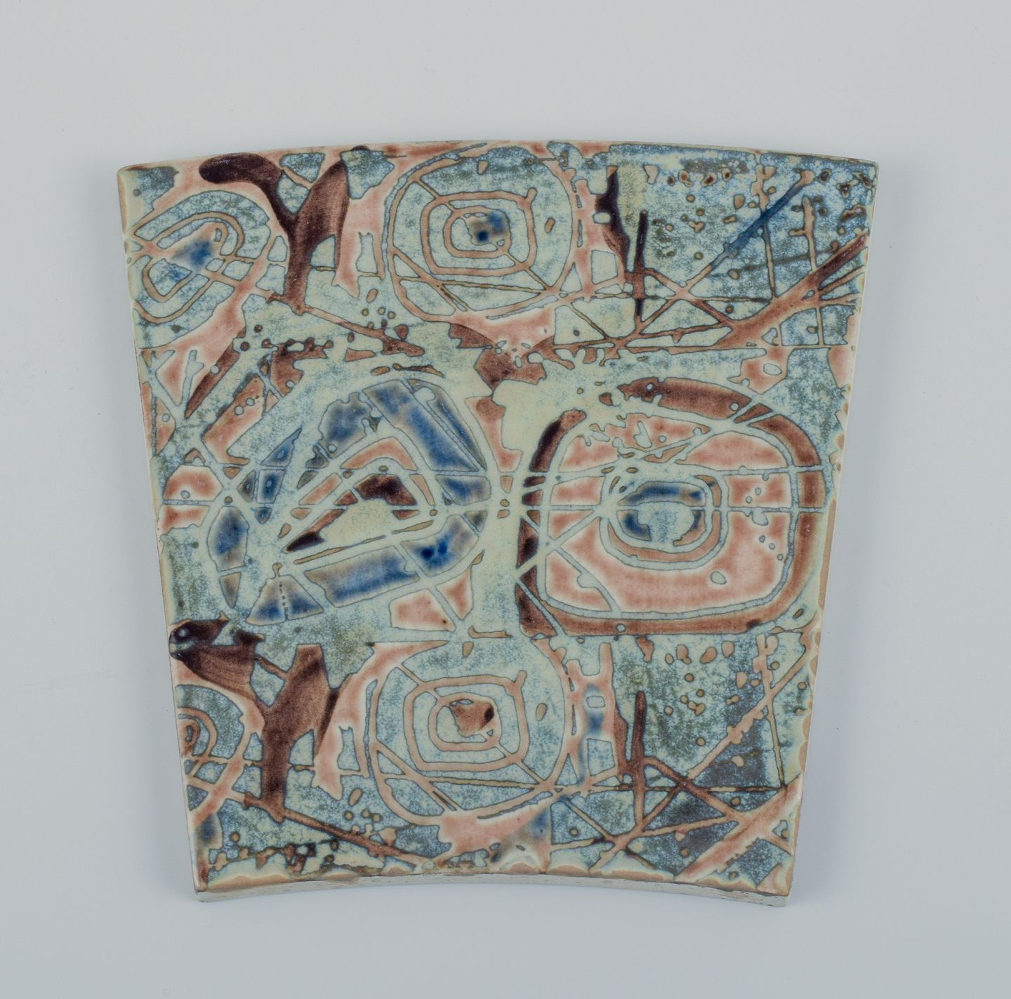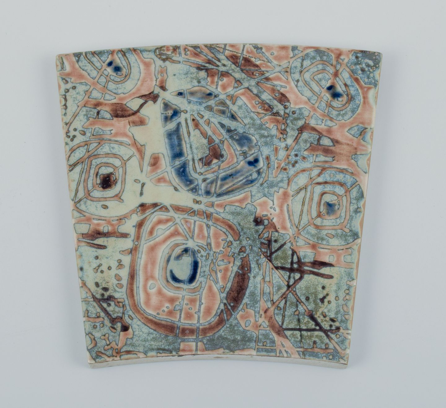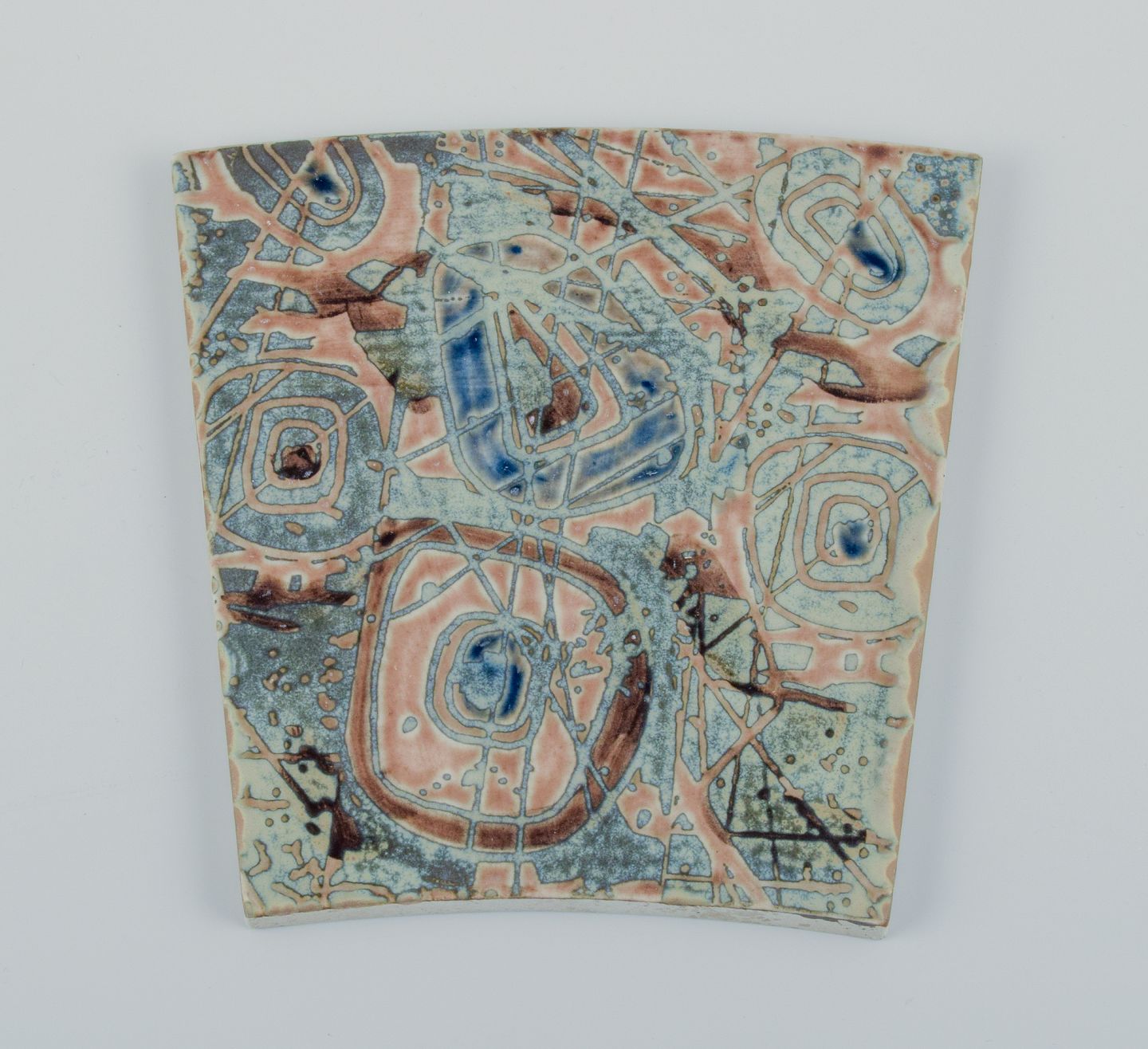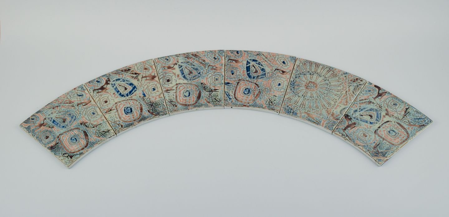 Royal Copenhagen, six Baca faience tiles with patterned glaze in brown, blue, green and sand colours.