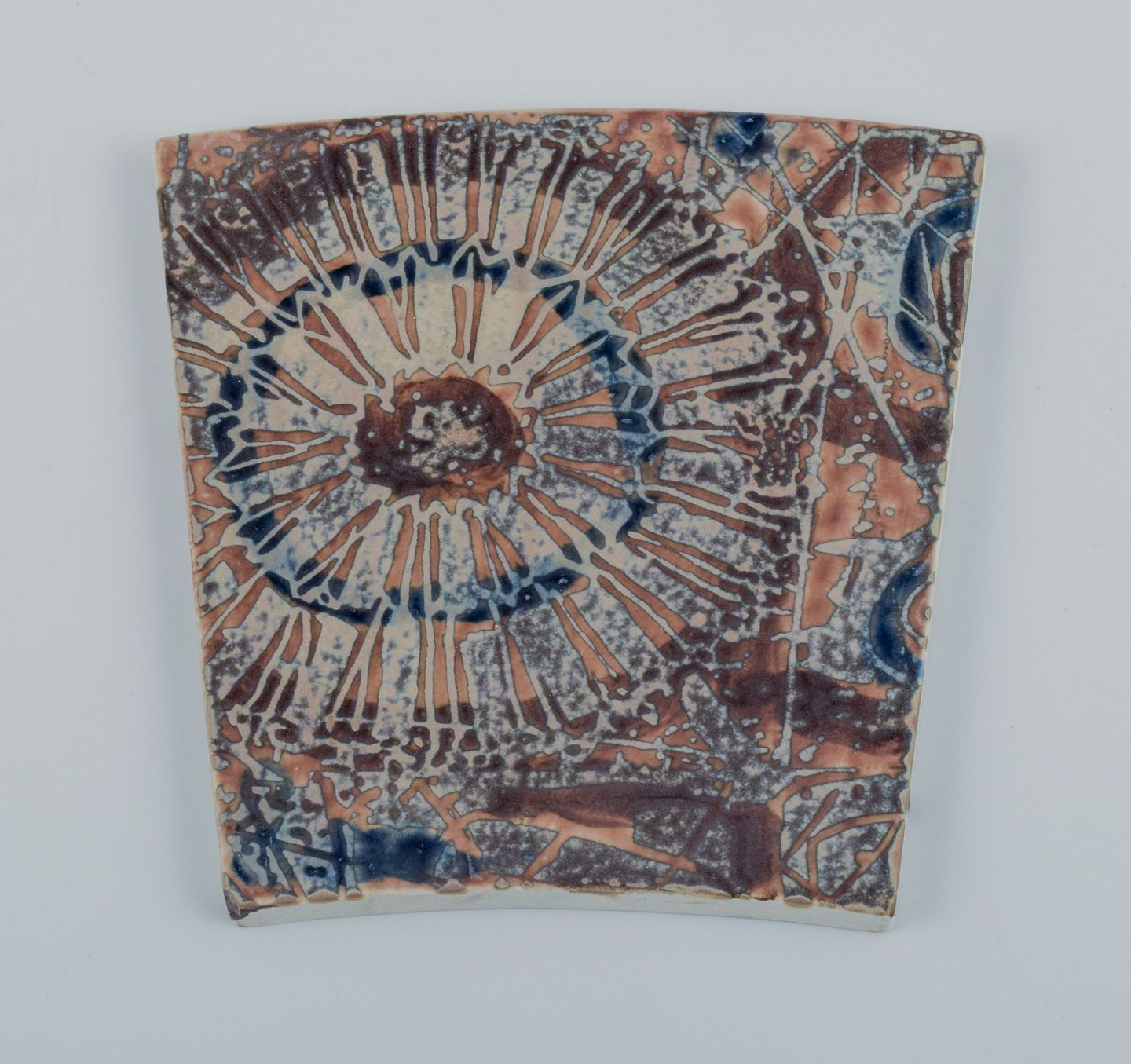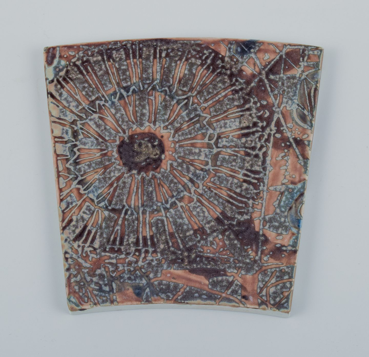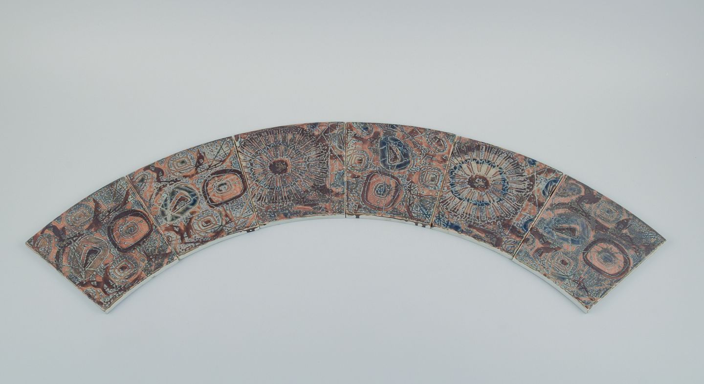 Royal Copenhagen, six Baca faience tiles with patterned glaze in brown, blue and green.