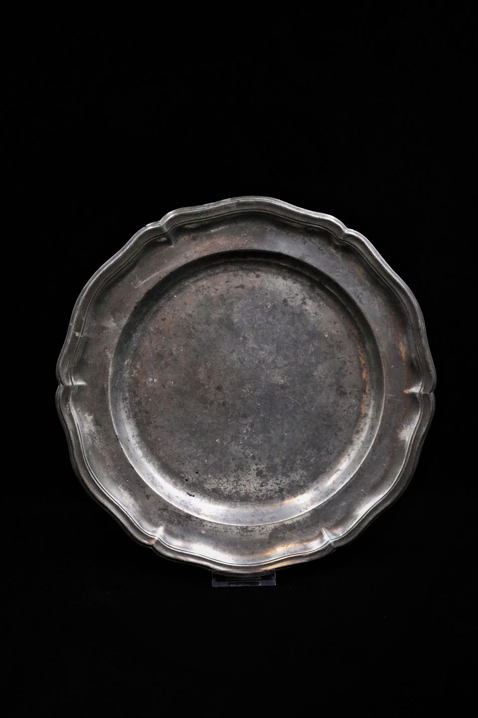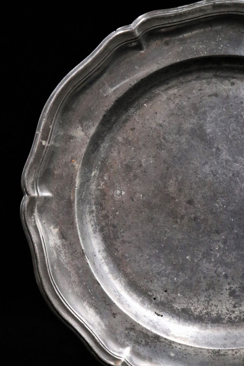 Dekorativt antikt 1700 tals tin fad med bølget kant og en rigtig fin patina.