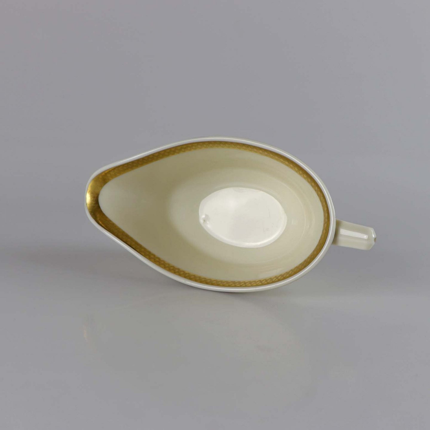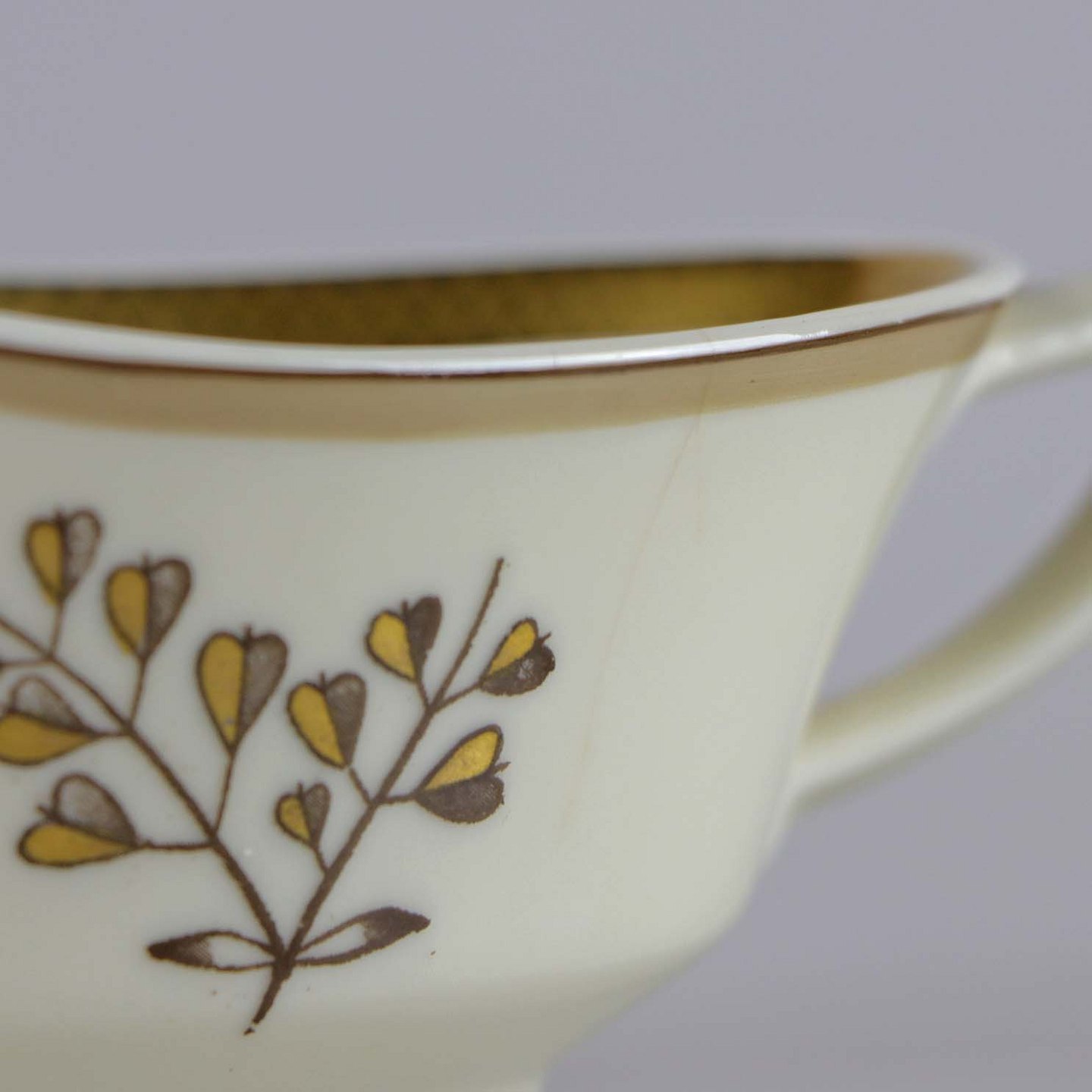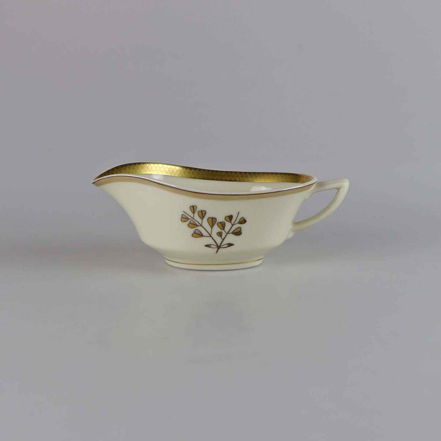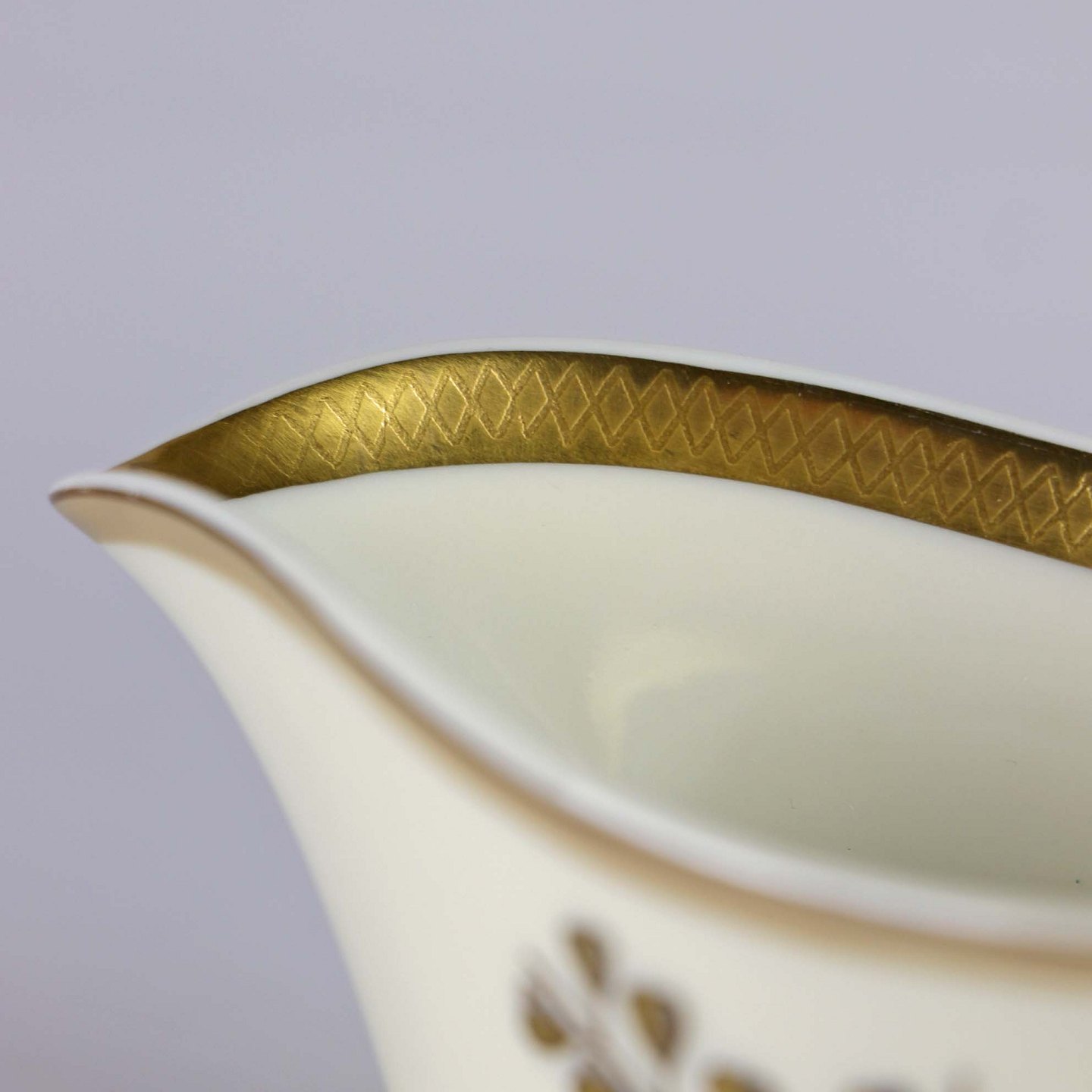Cremefarvet porcelæn med motiv af gylden kløverblomst og bred graveret guldkantkant.