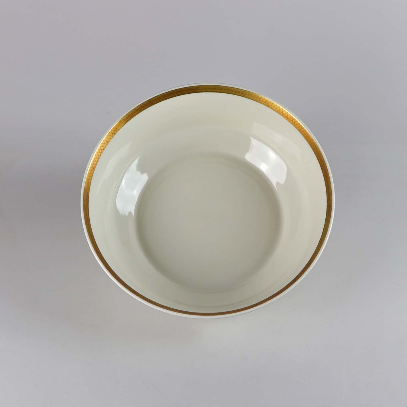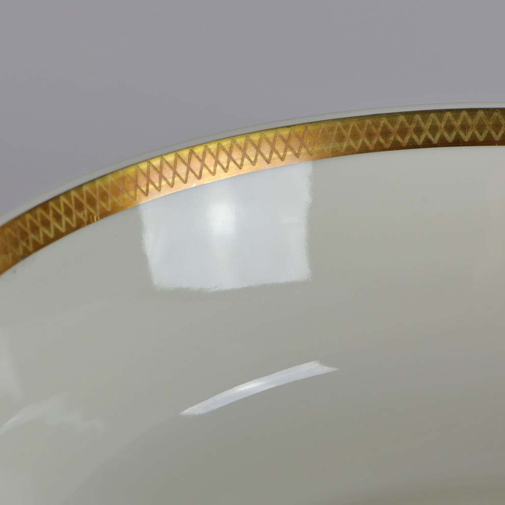 Cremefarvet porcelæn med motiv af gylden kløverblomst og bred graveret guldkantkant.