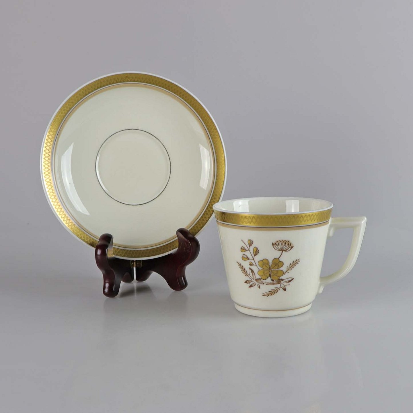 Cremefarvet porcelæn med motiv af gylden kløverblomst og bred graveret guldkantkant.
