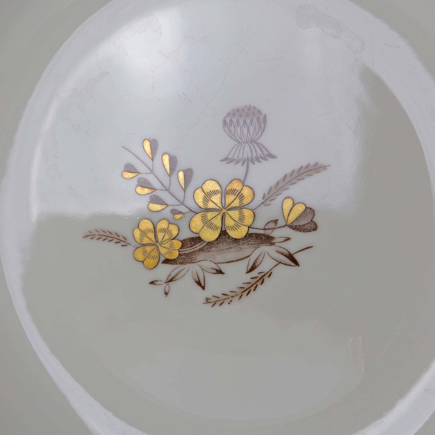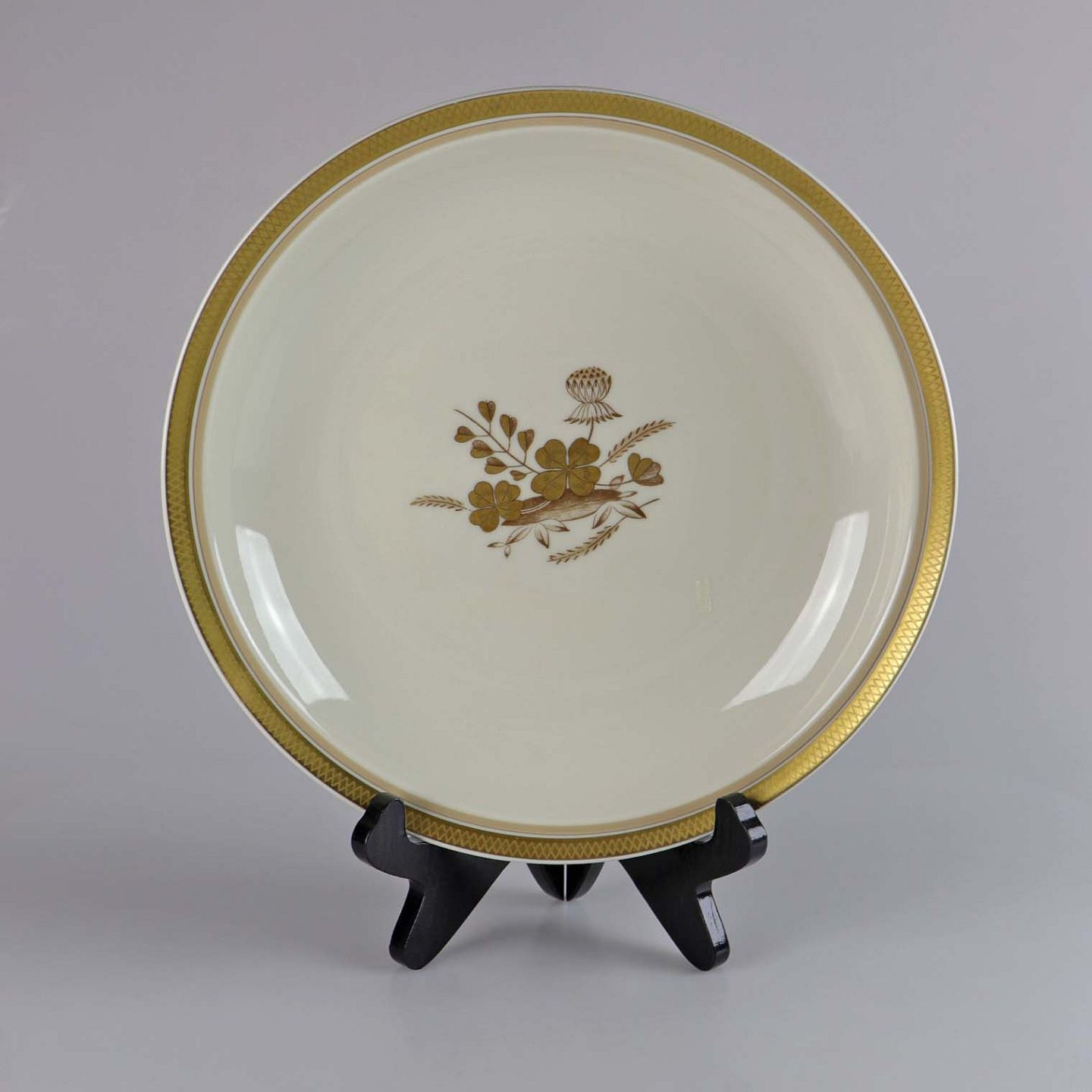 Cremefarvet porcelæn med motiv af gylden kløverblomst og bred graveret guldkantkant.