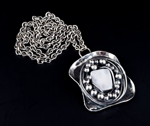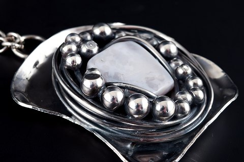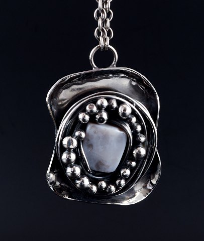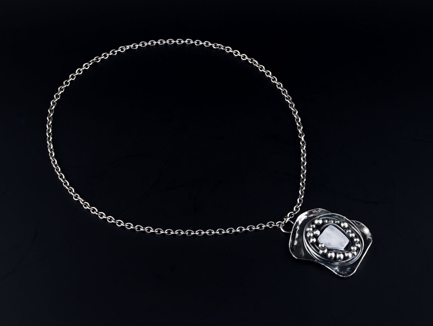Jacob Hull, dansk smykkekunstner. Halskæde med integreret vedhæng. Unikaarbejde, forsølvet metal prydet med sten.