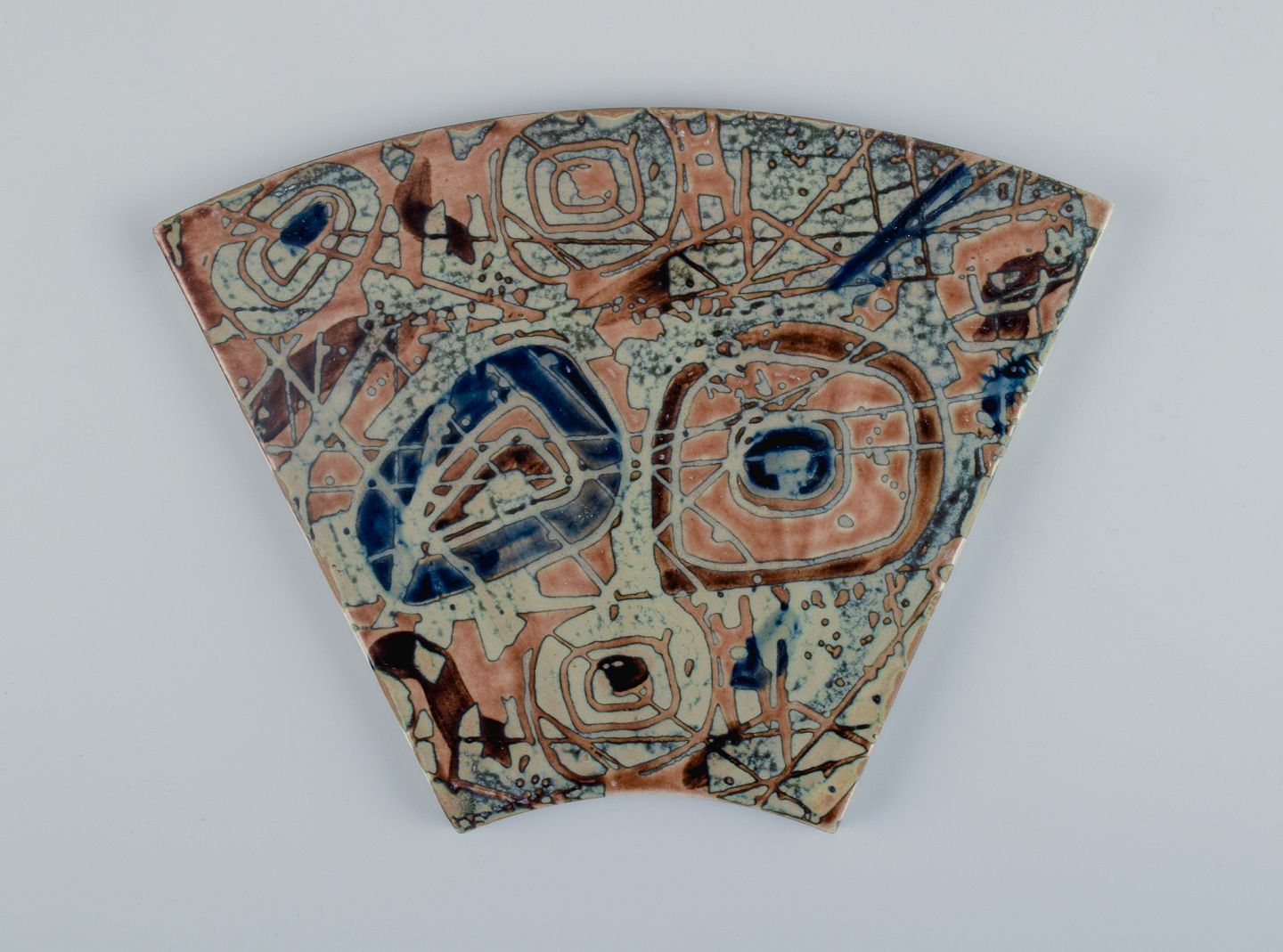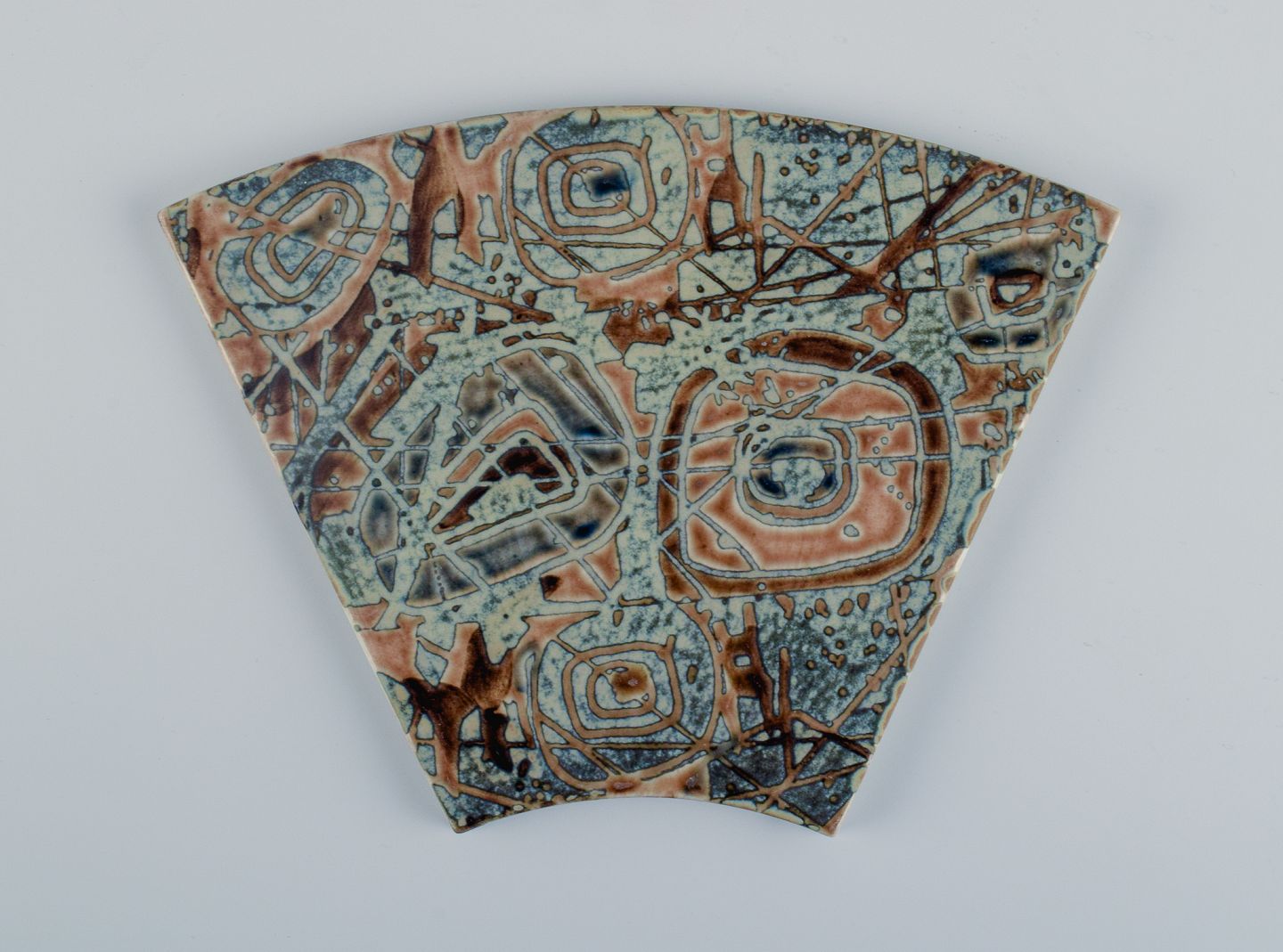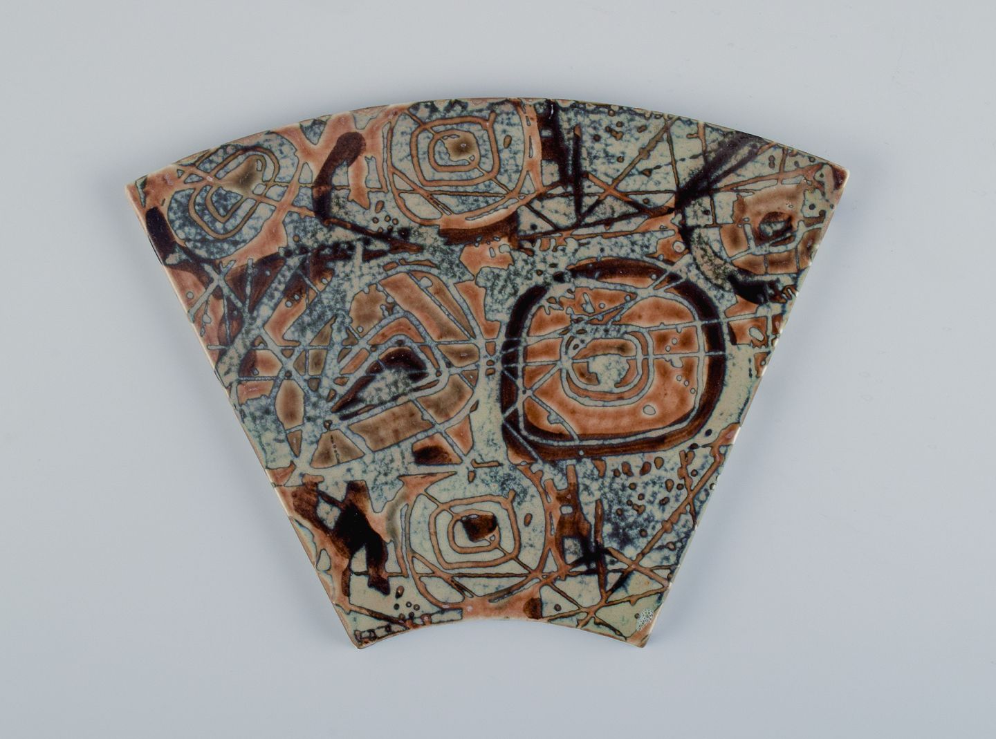 Royal Copenhagen, seks Baca fajancekakler med mønstret glasur i brun, blå, grøn og sandfarver.