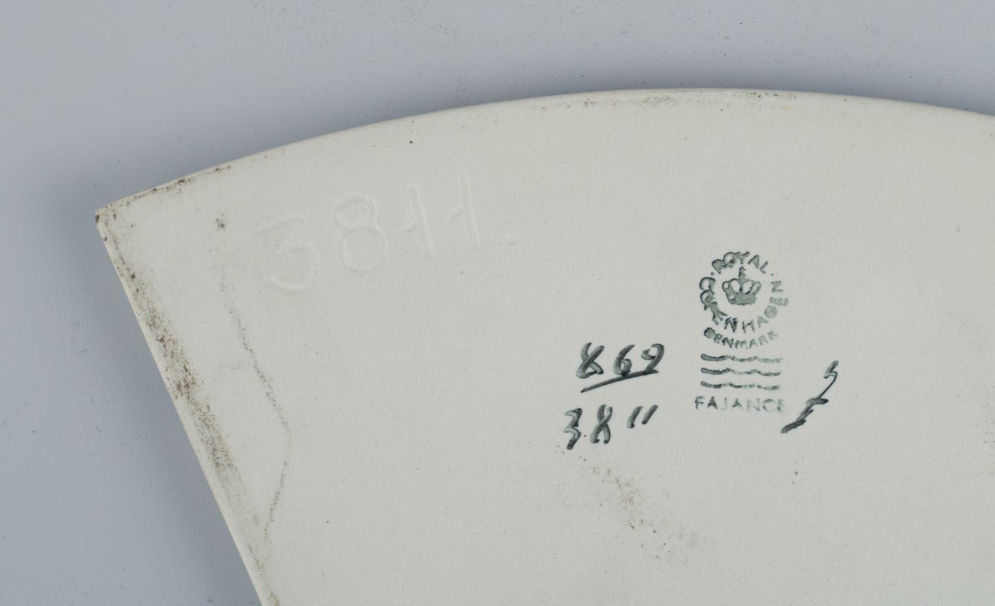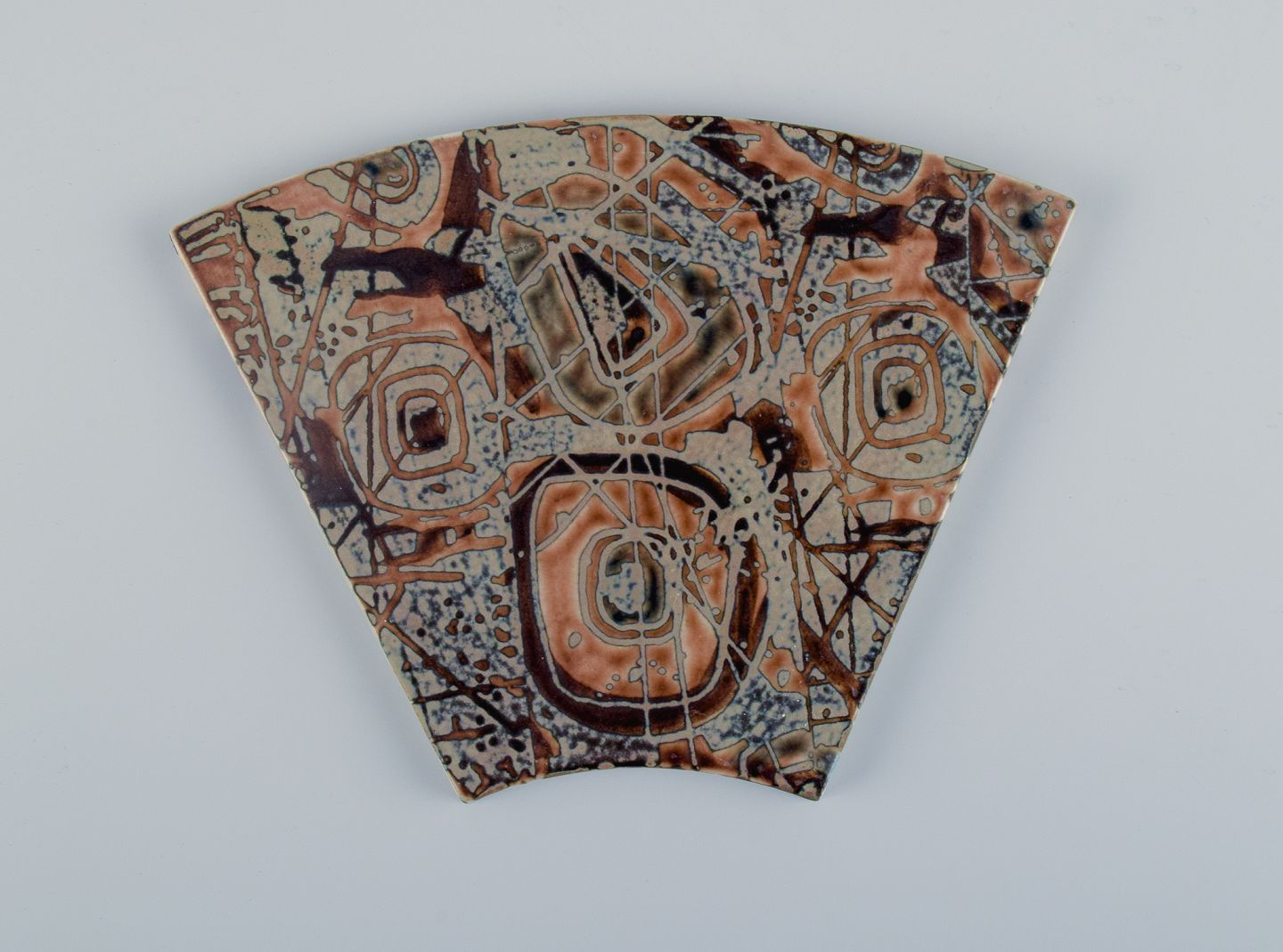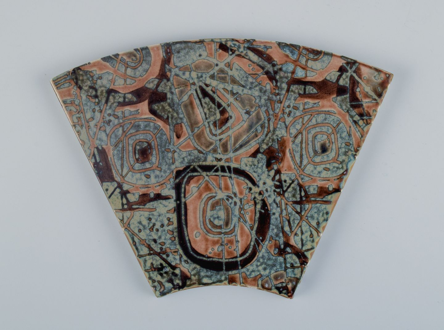Royal Copenhagen, seks Baca fajancekakler med mønstret glasur i brun, blå, grøn og sandfarver.
