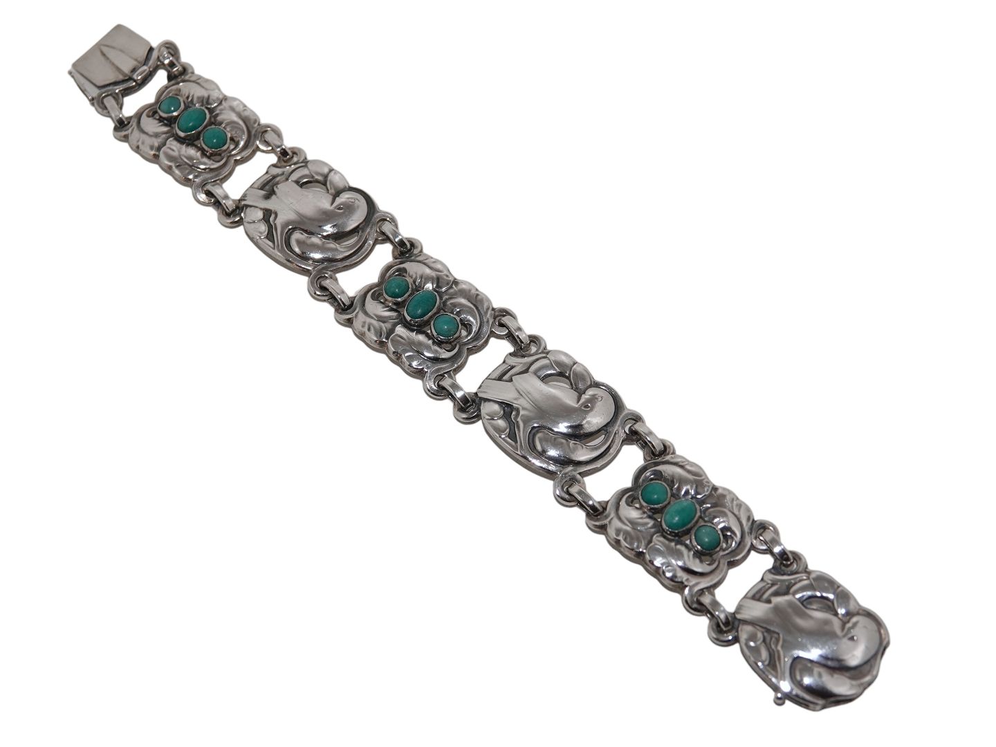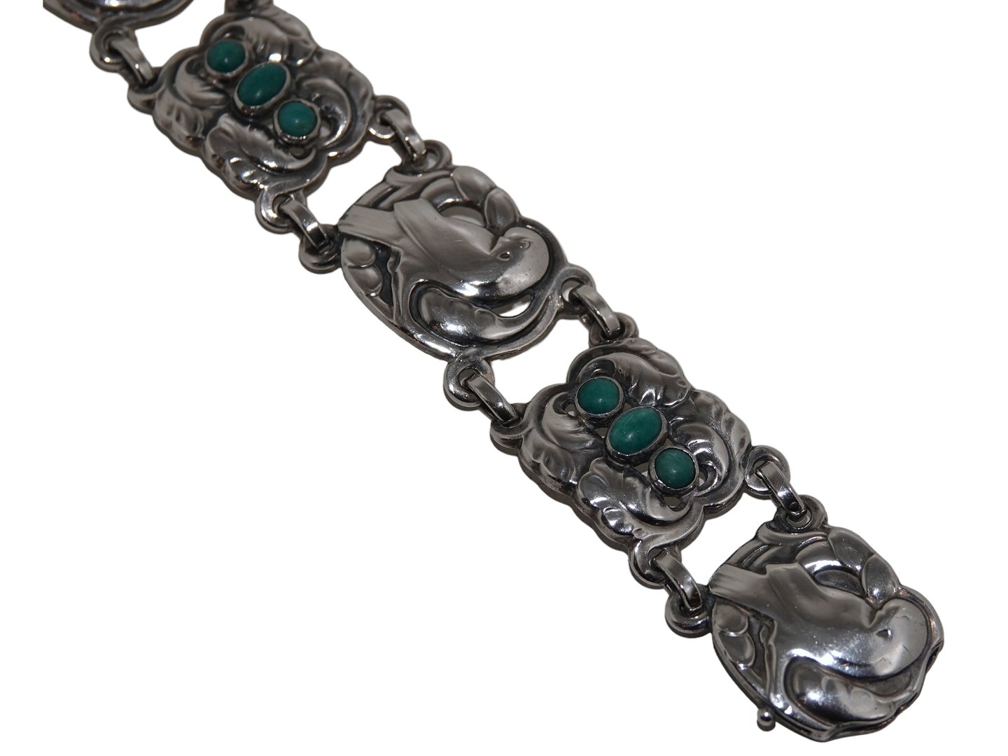 Georg Jensen sterling silver, bracelet with birds and green stones.