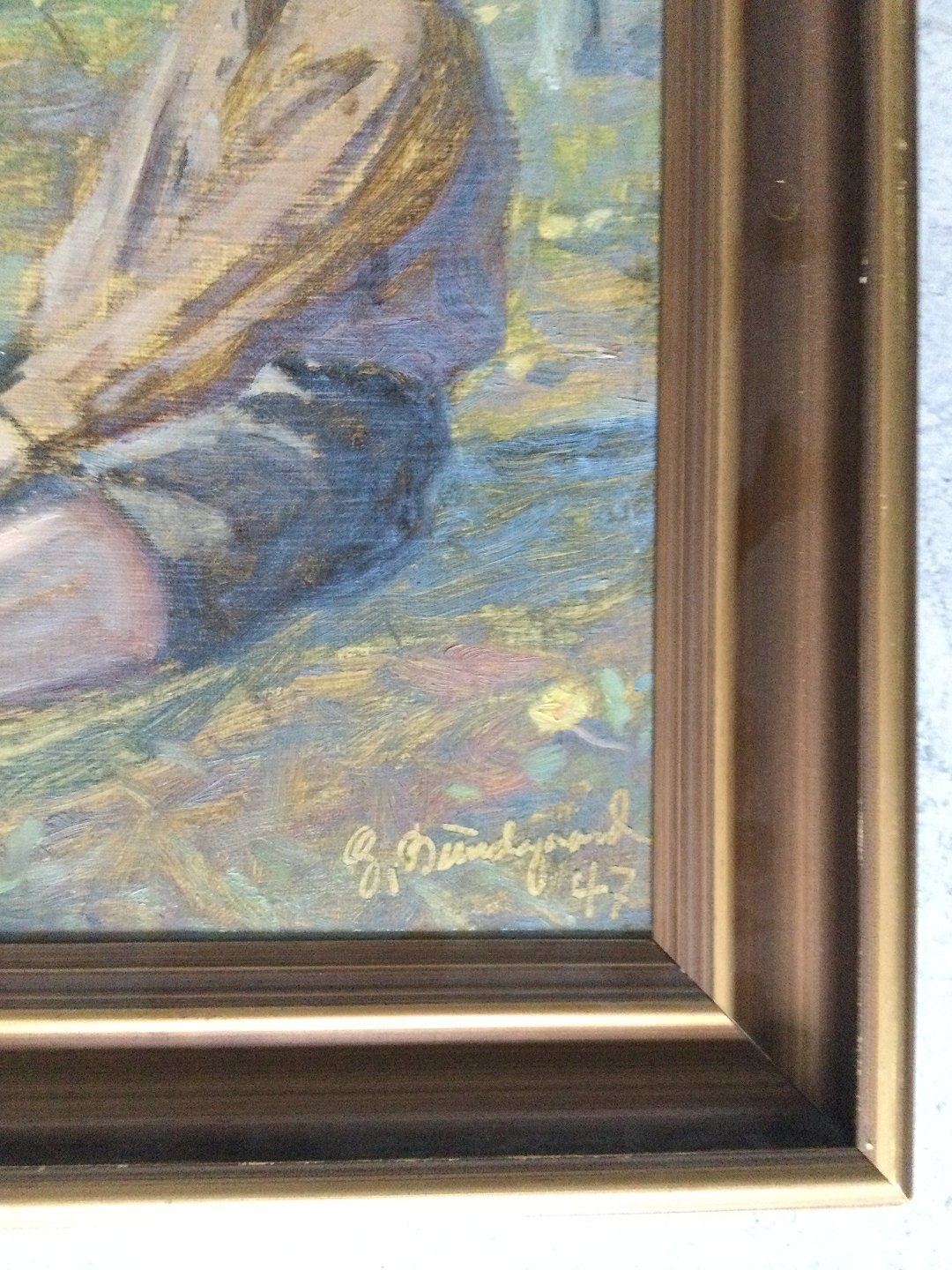 Maleri af Gunner Bundgaard - Siddende dreng i landskab ved gård 1947.