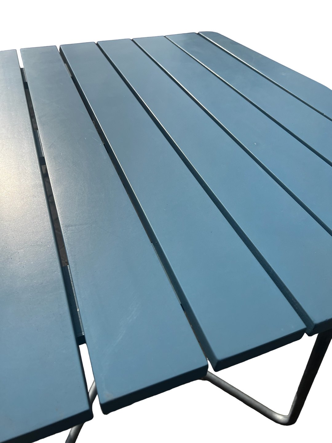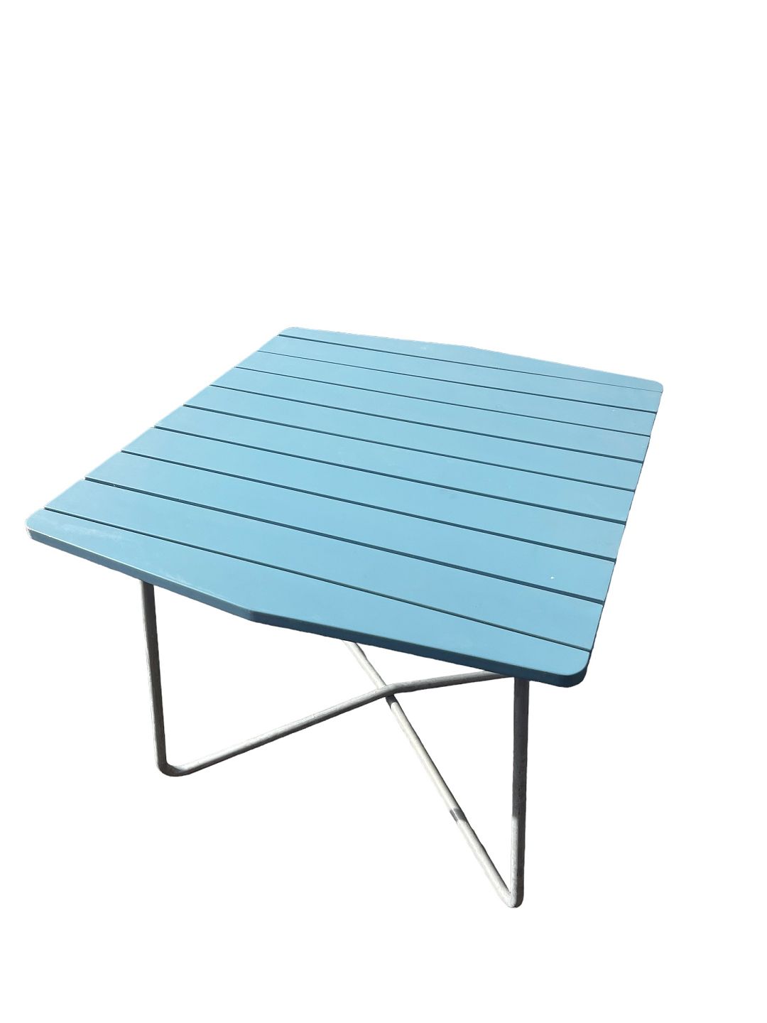Havebord med en lyseblå bordplade af svensk design i fin stand.