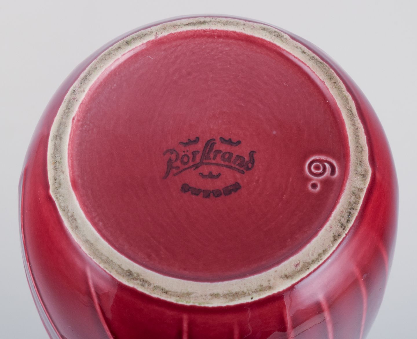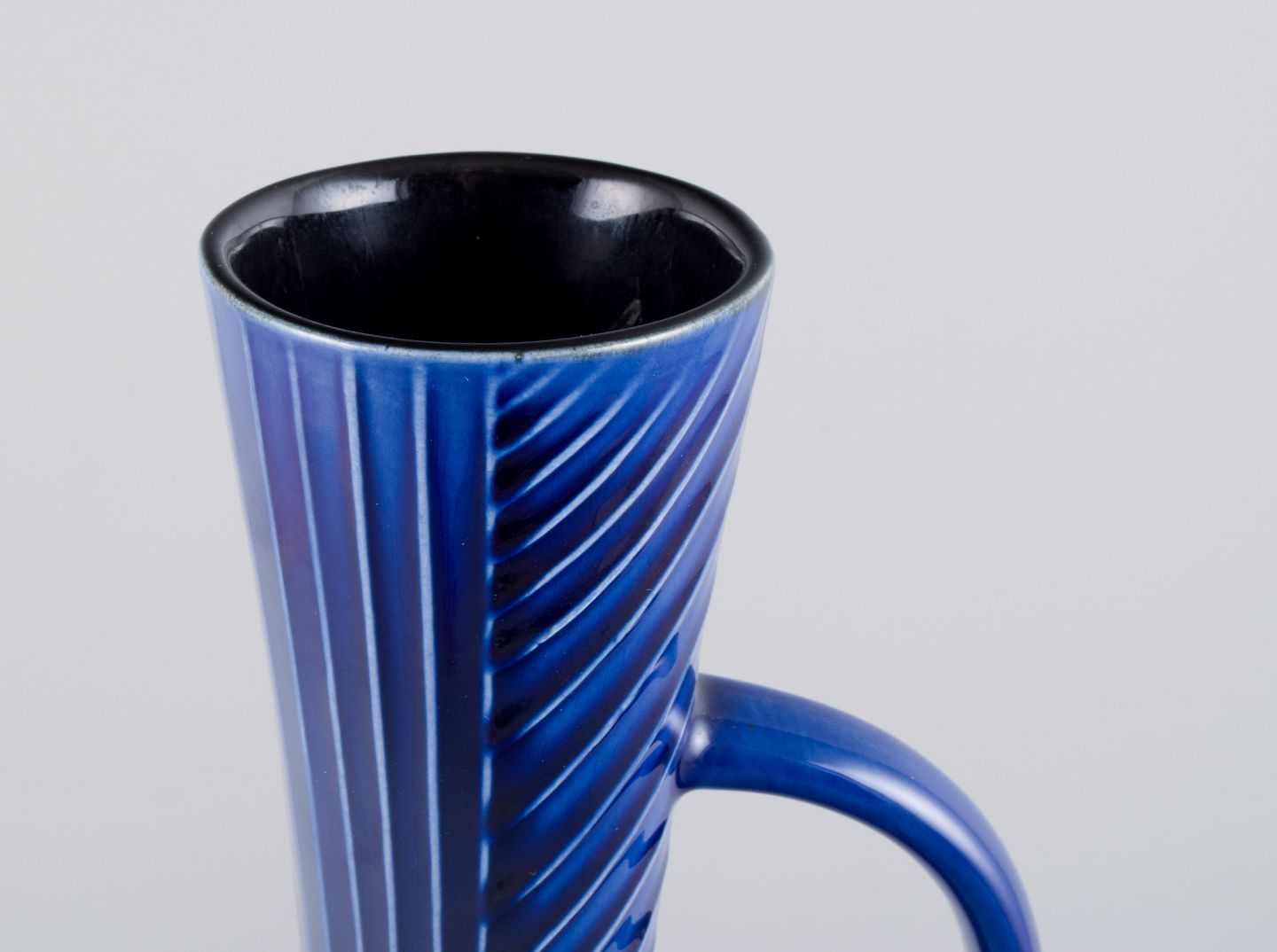Carl Harry Stålhane for Rörstrand, høj og slank keramikkande i blå og bordeauxfarvet toner.