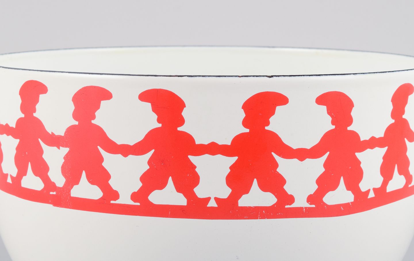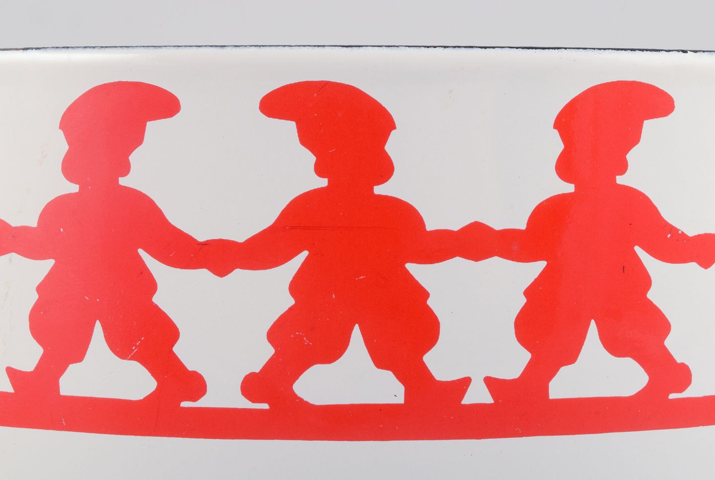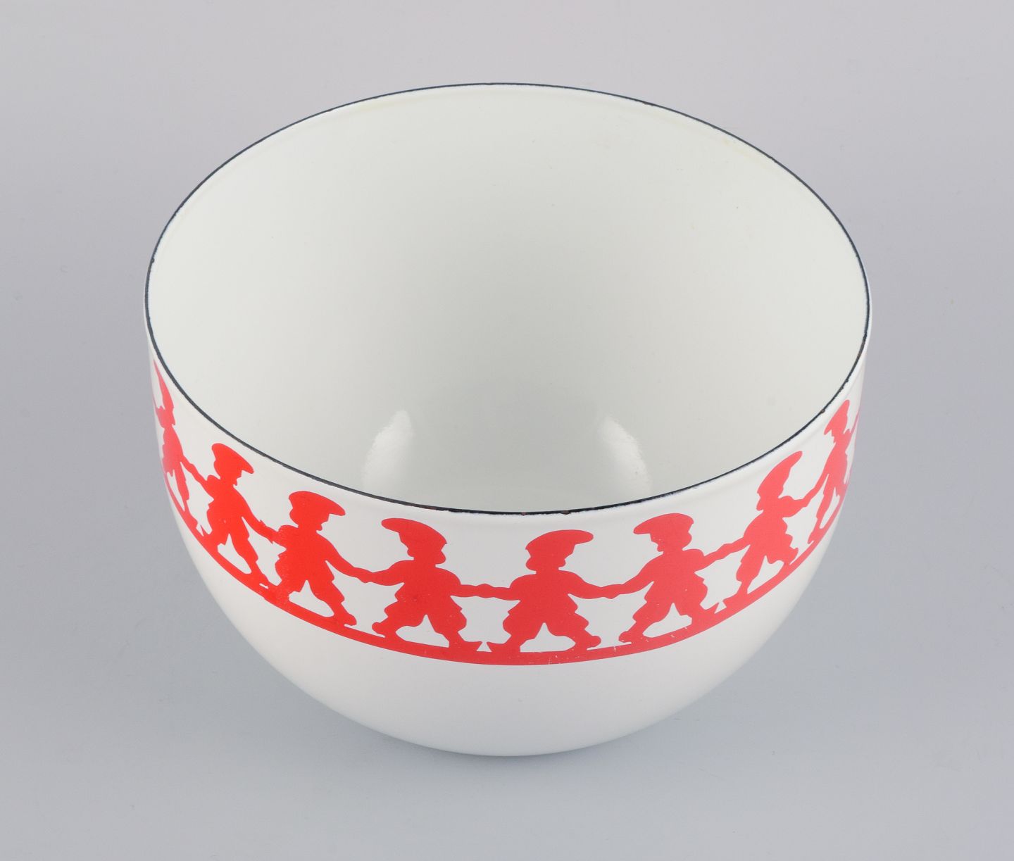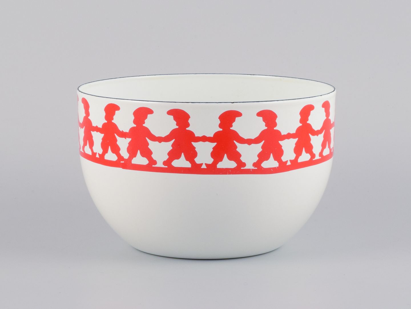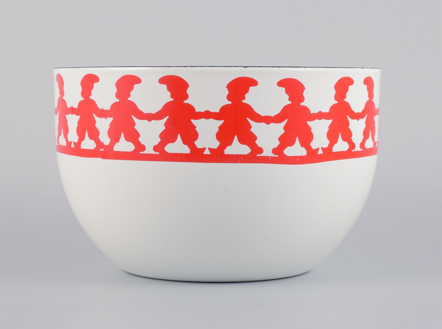 Kaj Franck, for Arabia, Finland, ”Tonttu” emaljeret metalskål, dekoreret med nisser i dans.
