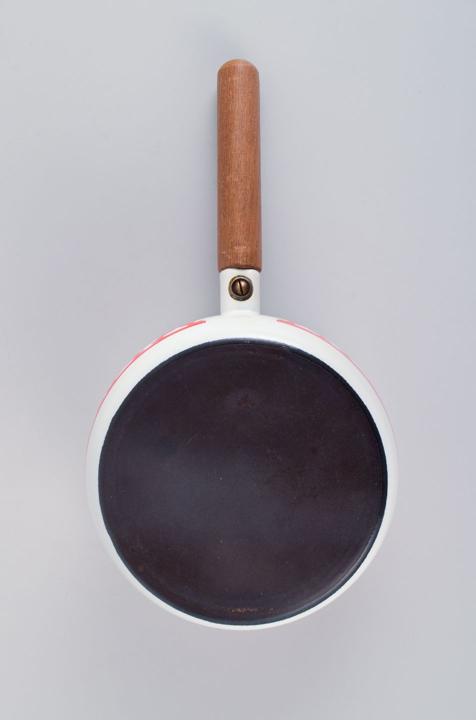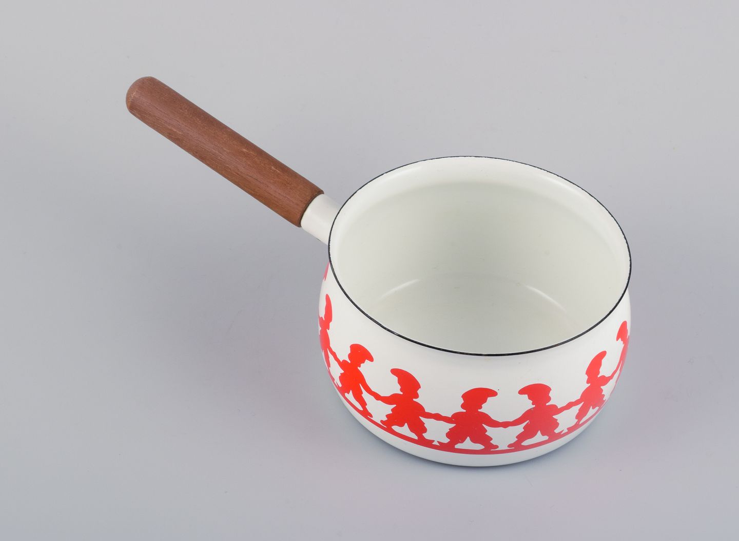 Kaj Franck, for Arabia, ”Tonttu” emaljeret metalkasserolle med træskaft, dekoreret med nisser i dans.
