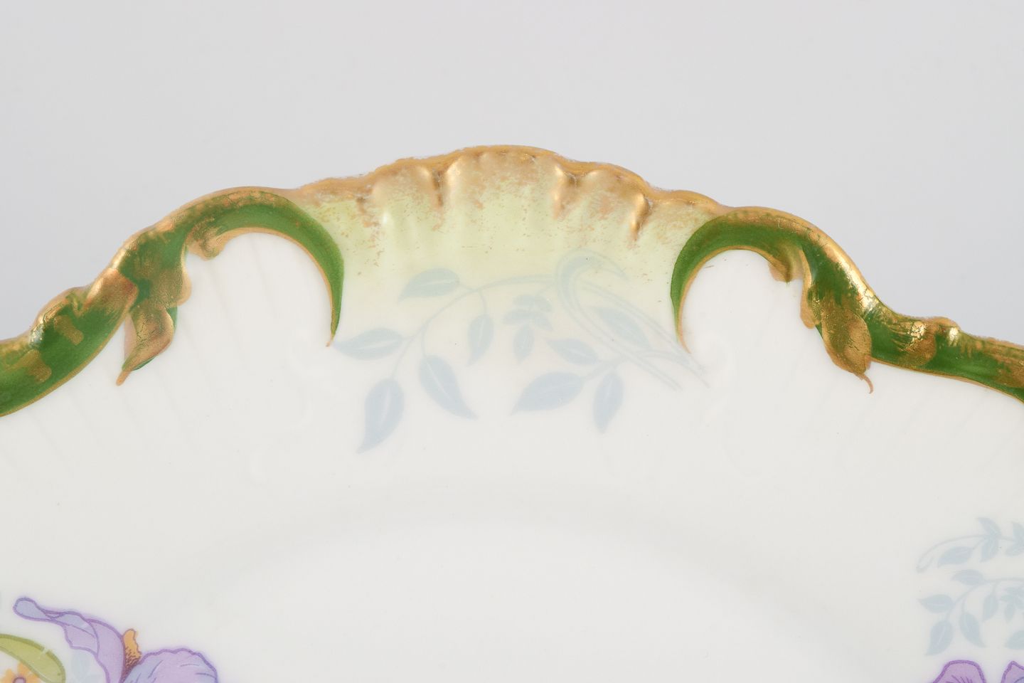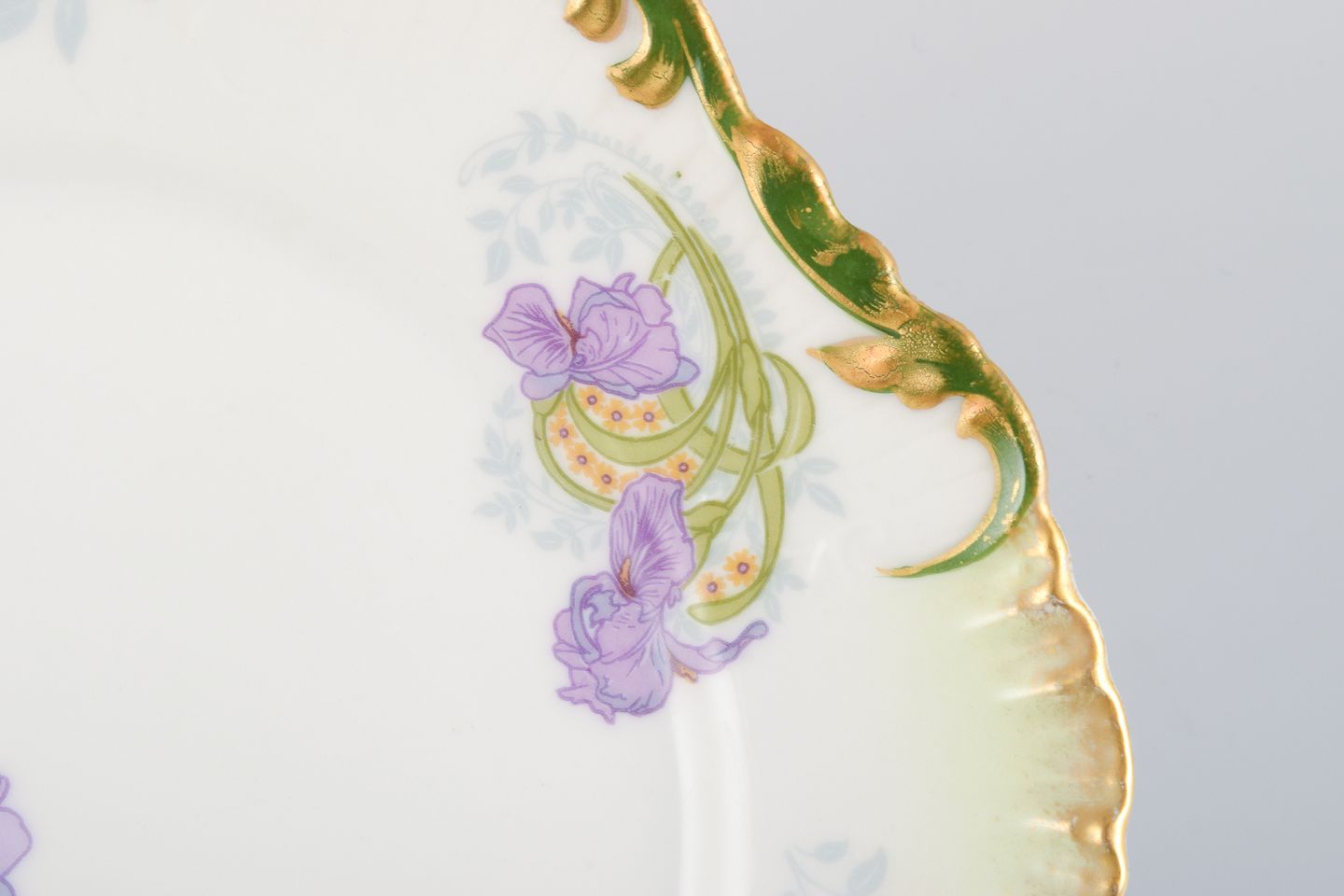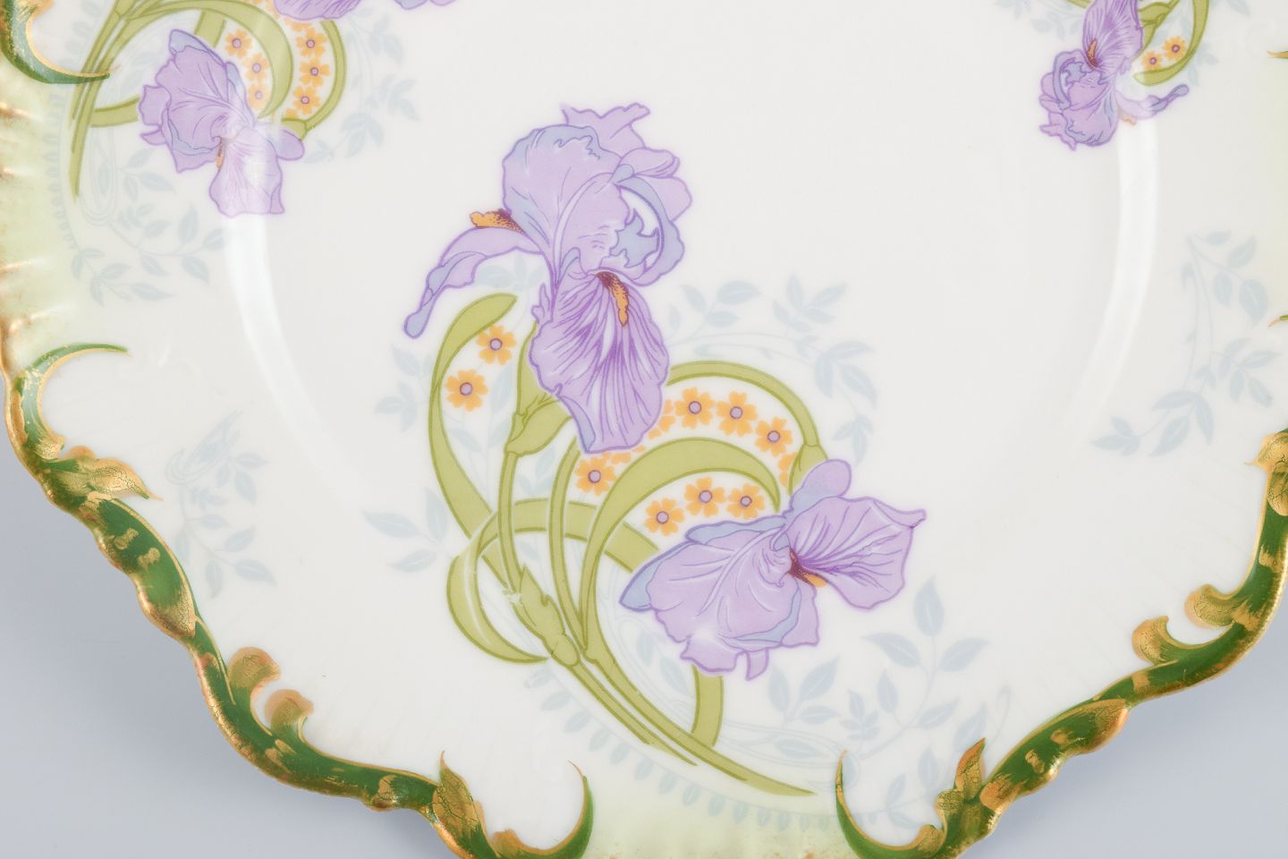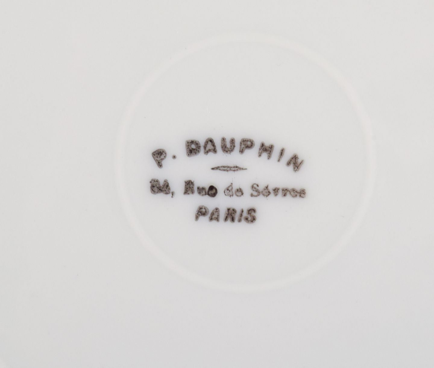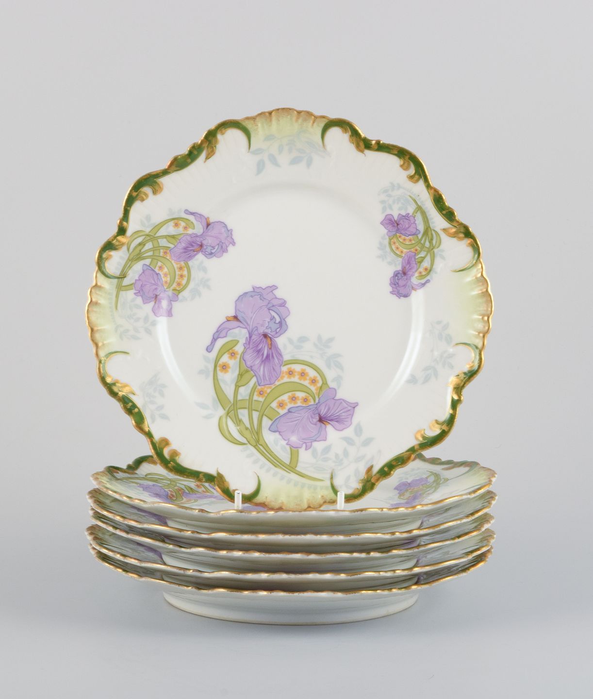 P. Dauphin, Paris, et sæt på seks skønvirke fajancetallerkner dekoreret med blomster og guldkant.