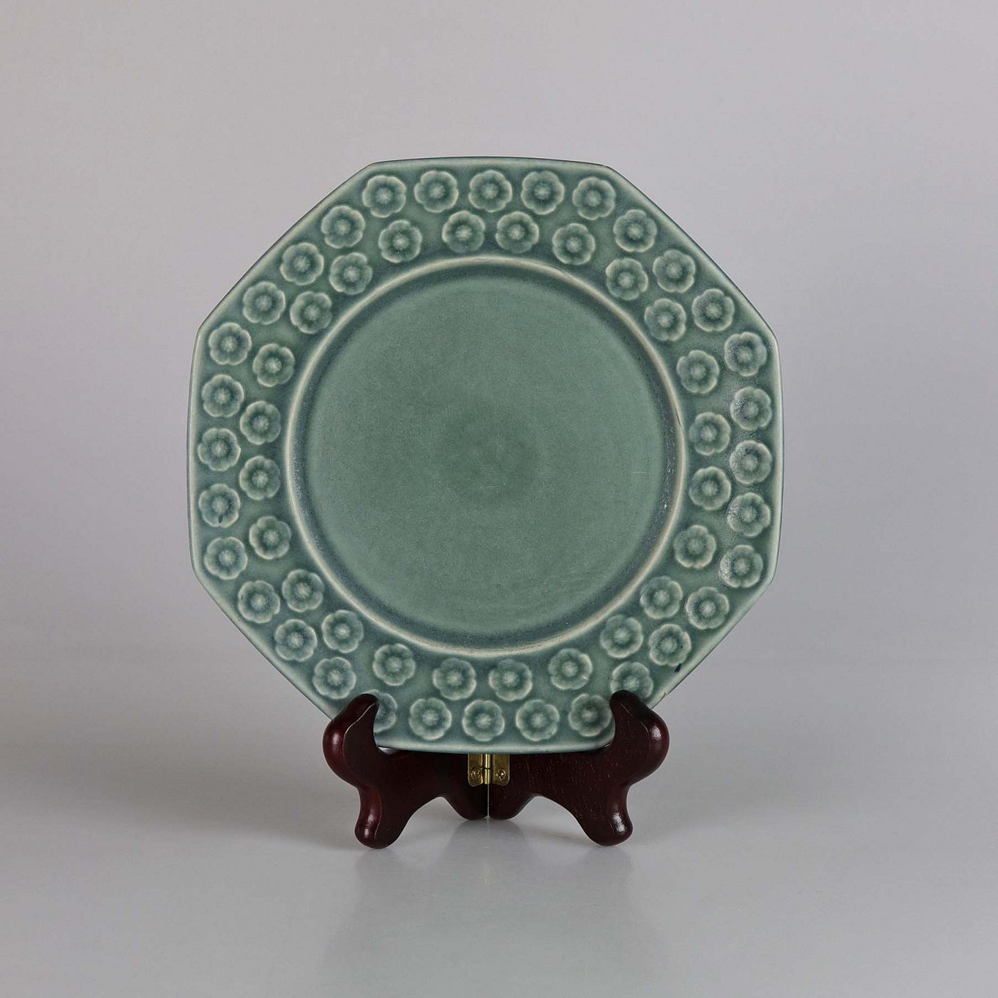 Ottekantet tallerken dekoreret med små blomster rundt i kanten