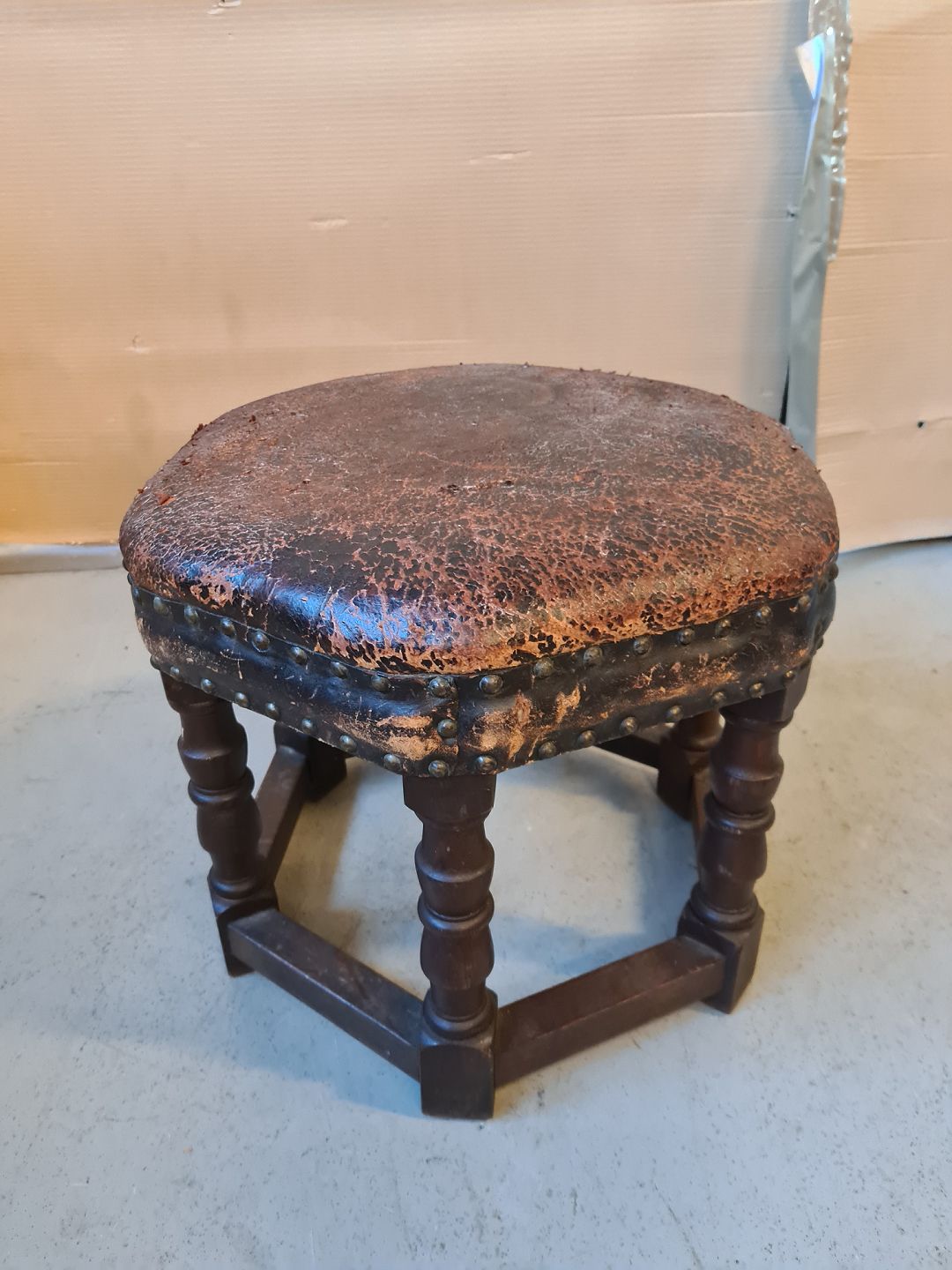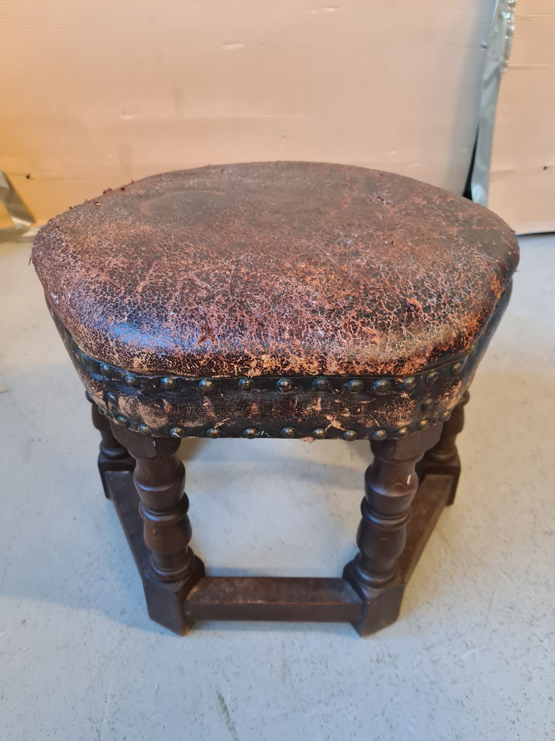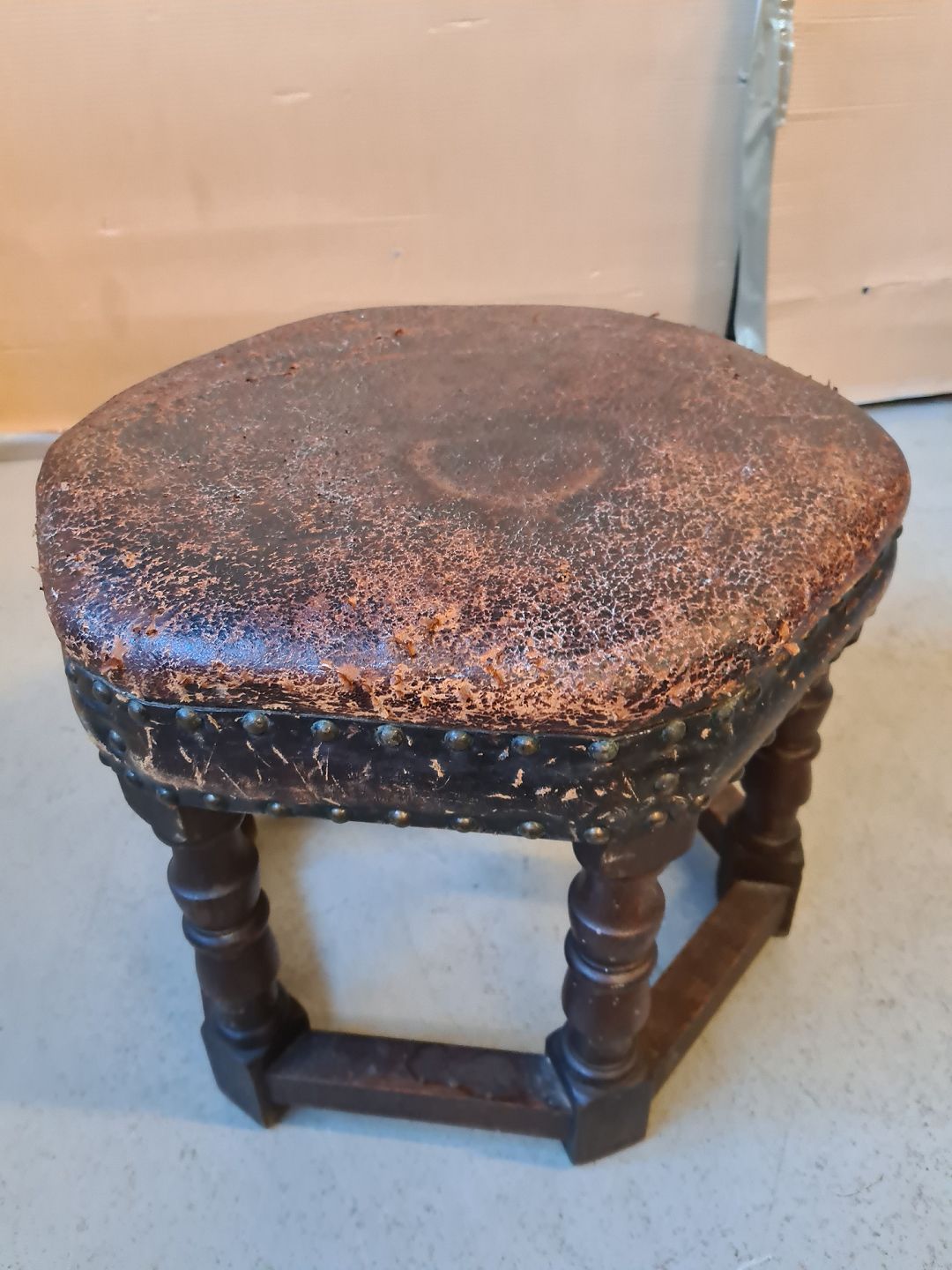 Skammel i egetræ med læder betræk, fra 1940erne.
