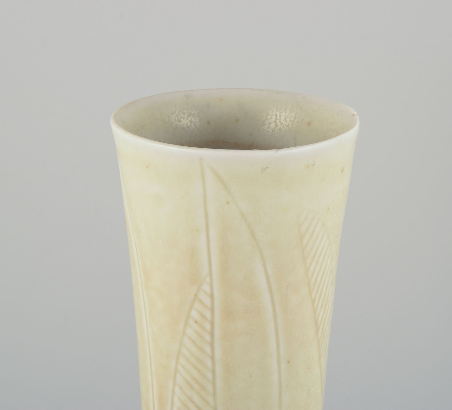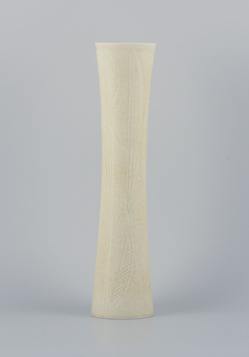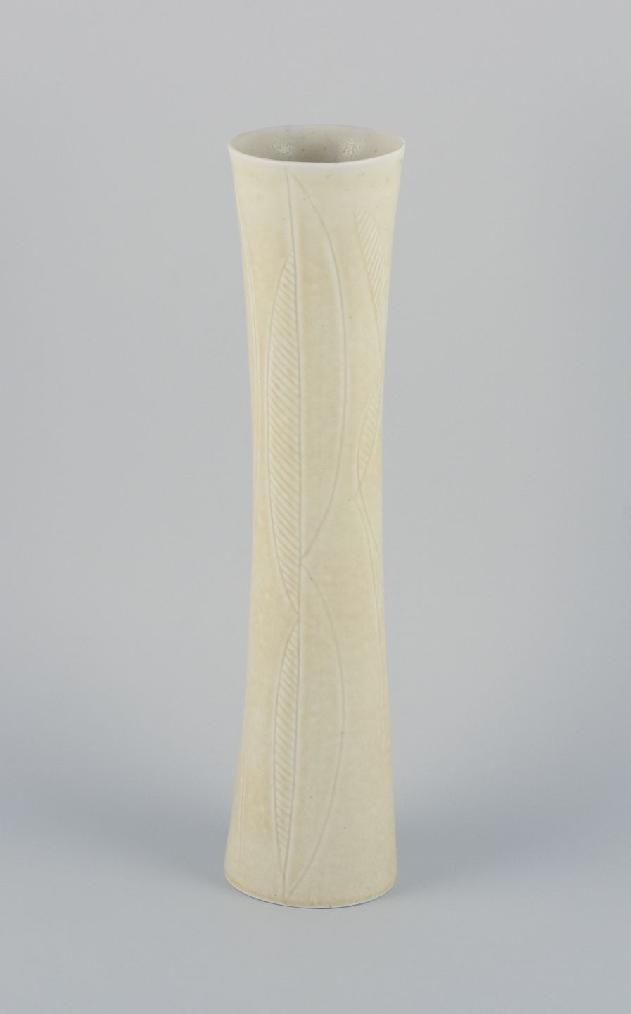 Carl Harry Stålhane for Rörstrand, høj og slank keramikvase. Dekoreret med geometrisk mønster. Cremefarvet glasur.