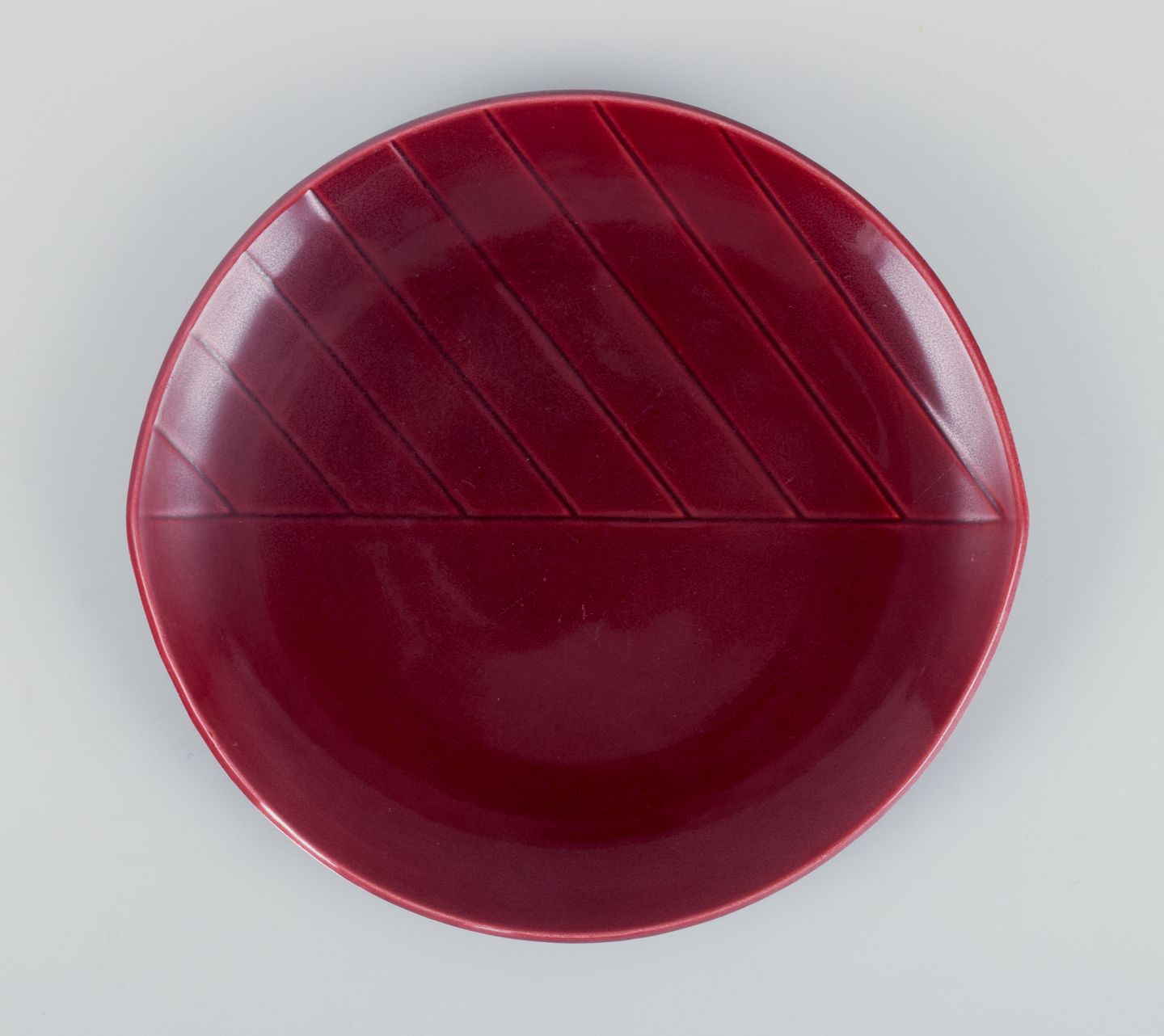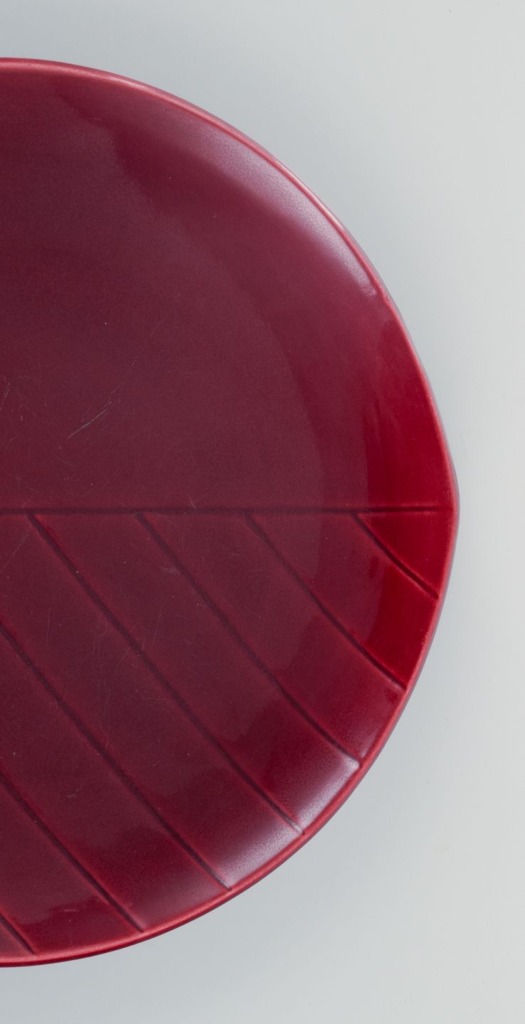 Carl Harry Stålhane for Rörstrand, Sweden, a set of four "California" ceramic plates, violet glaze. Stylish design.