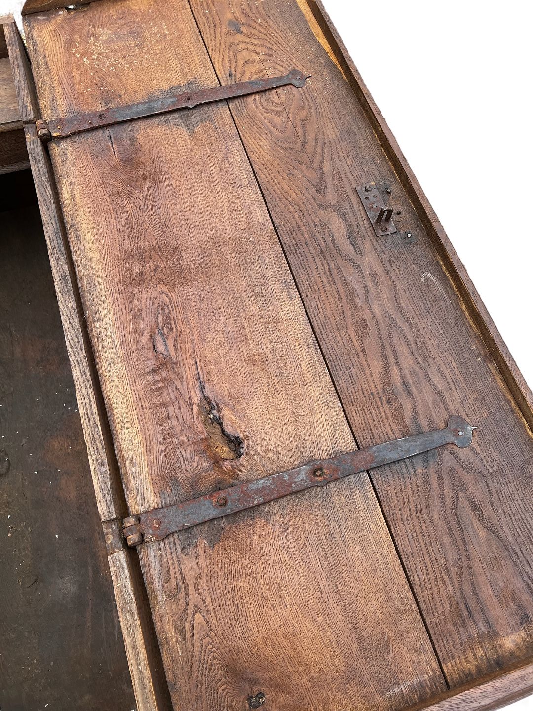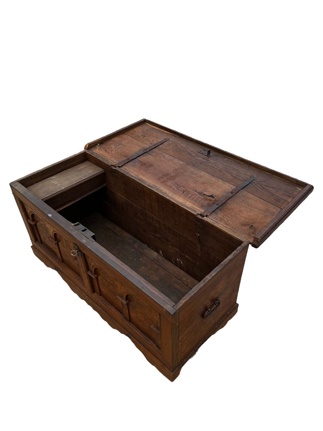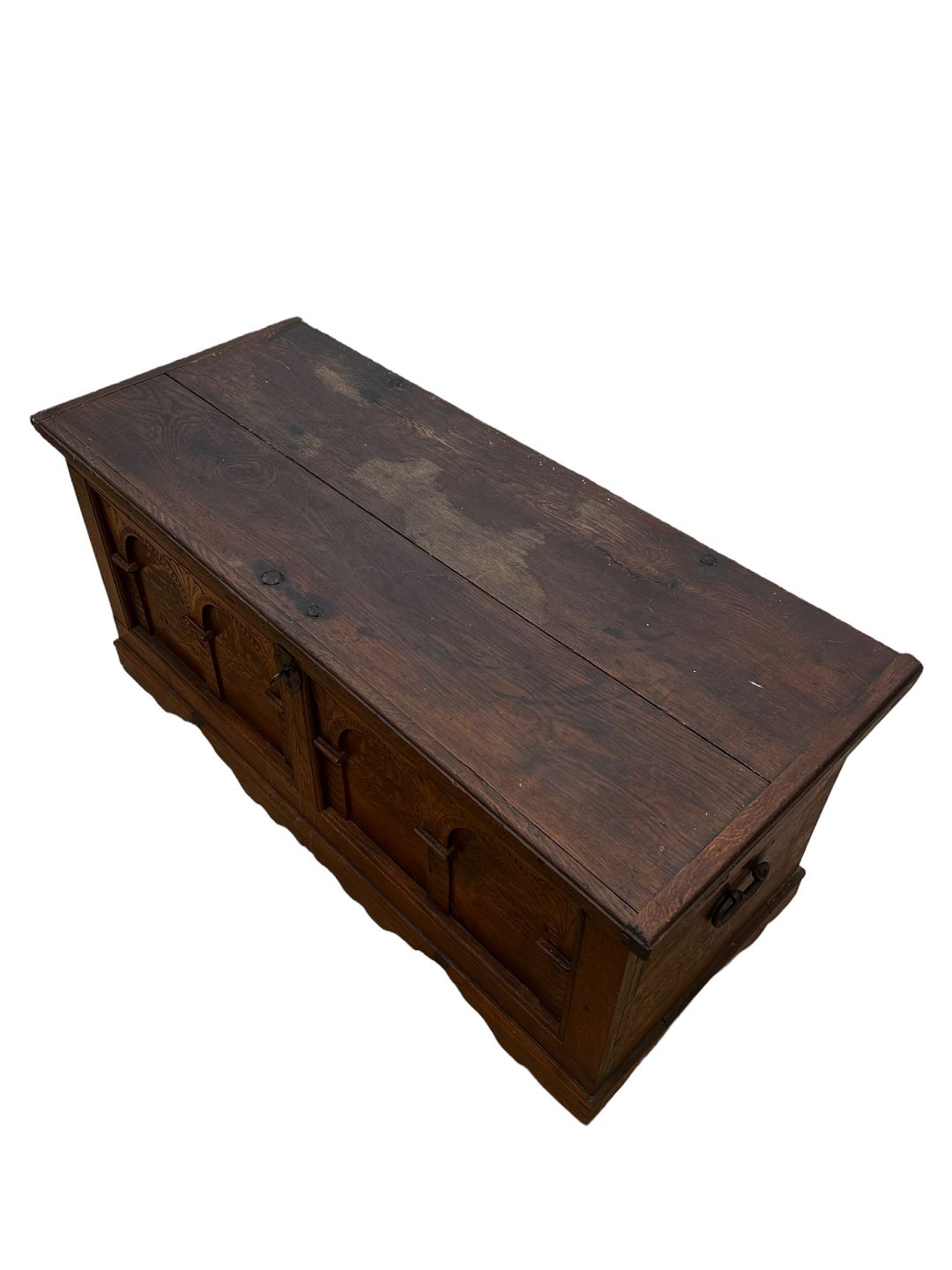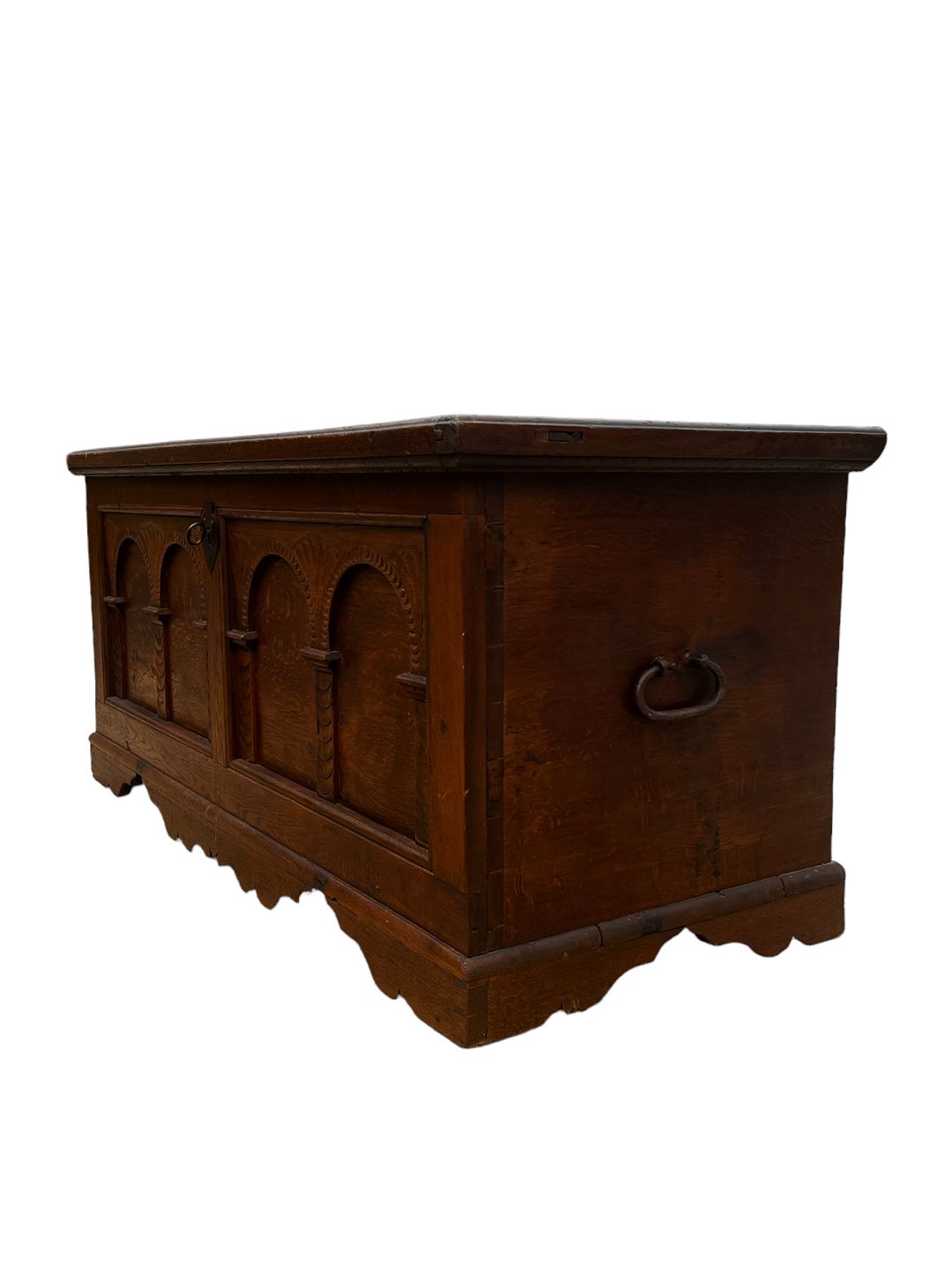Chest in oak with a flat lid, as well as 3 curved fronts and carvings from the 1760s.