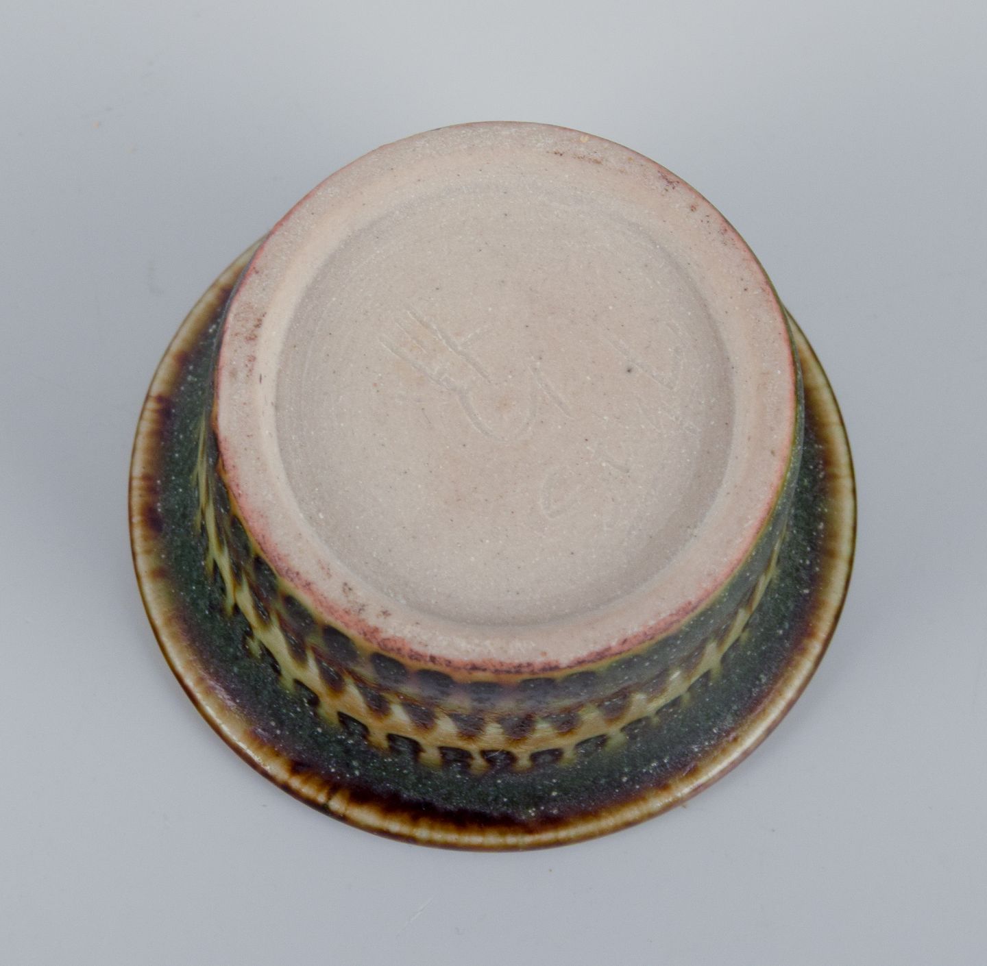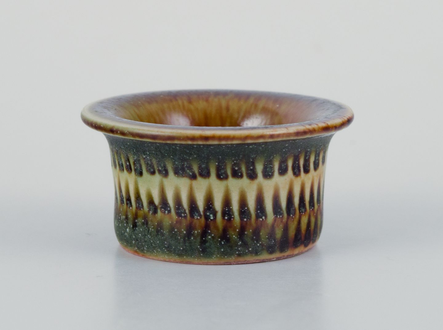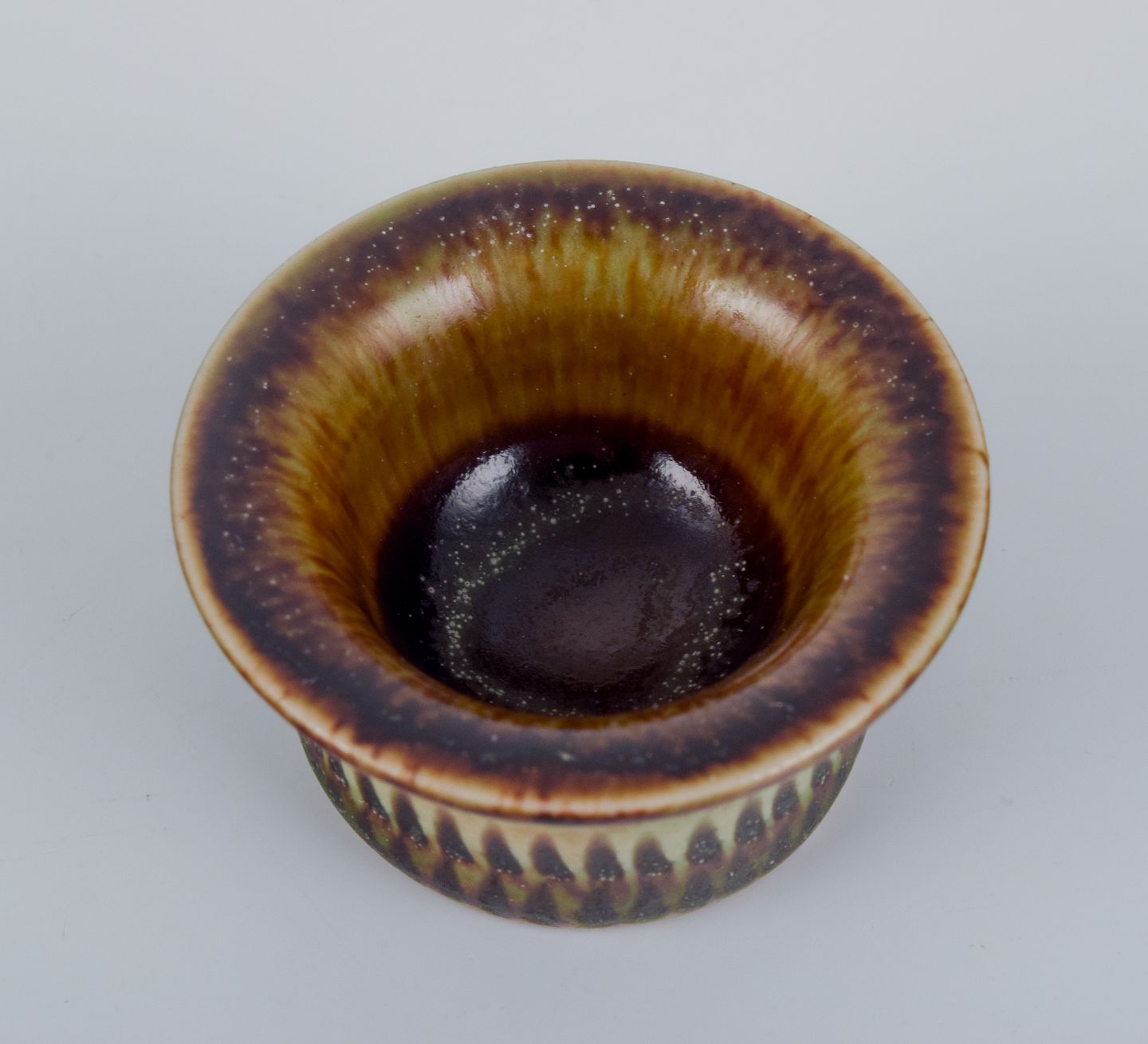 Stig Lindberg (1916-1982), Gustavsberg - Studio Hand, miniature skål med glasur i brune og grønne toner.