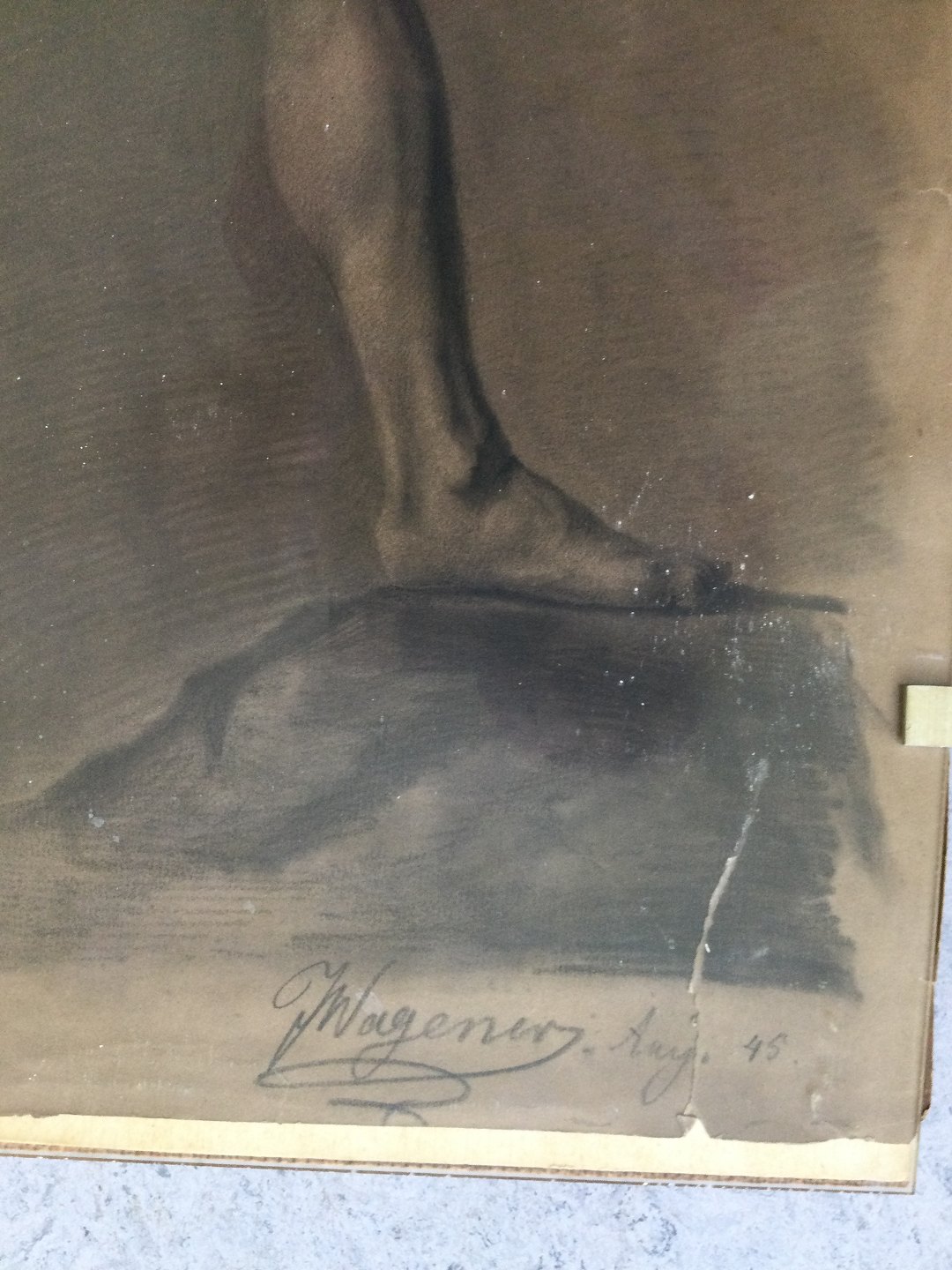 Text available in Danish: Tegning 1845 af J. Wagener - Akademitegning af nøgen mand.