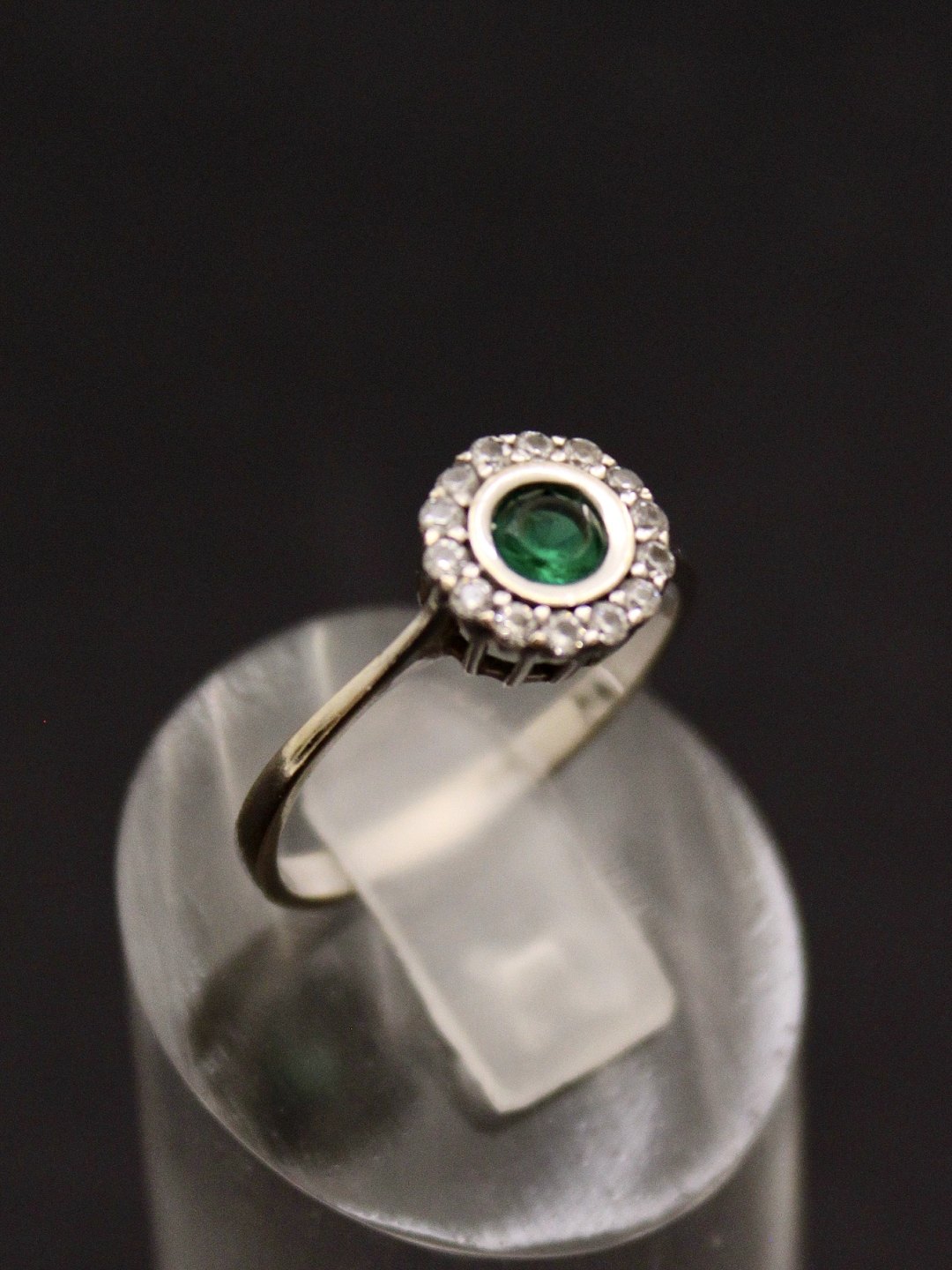 8 karat hvidguld ring størrelse 53 med grøn sten omgivet af klare stene emne nr. 537215