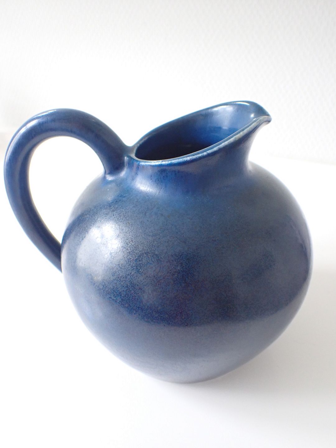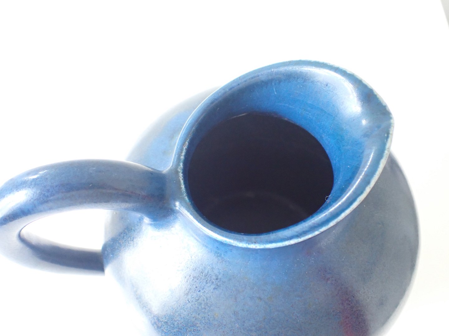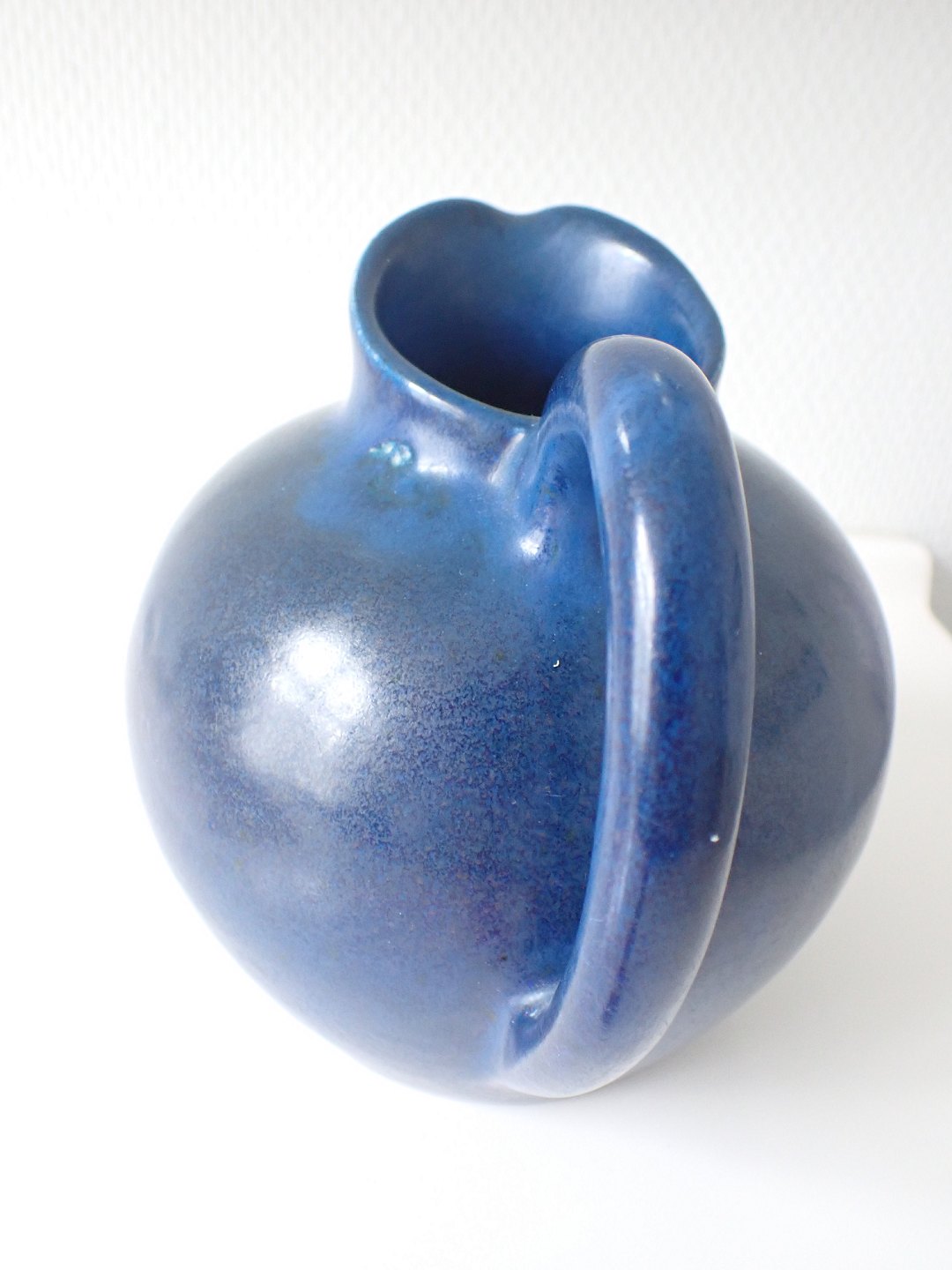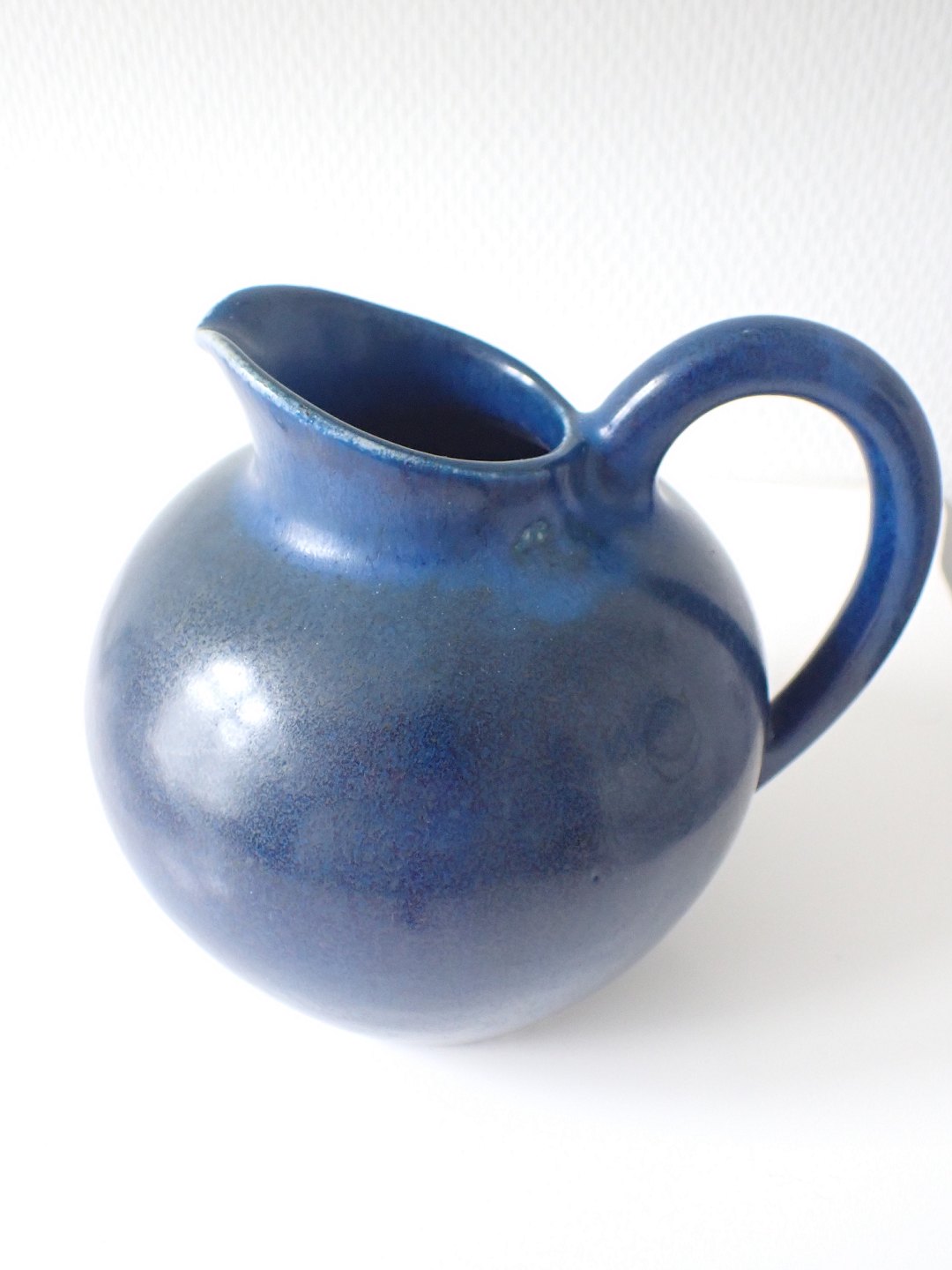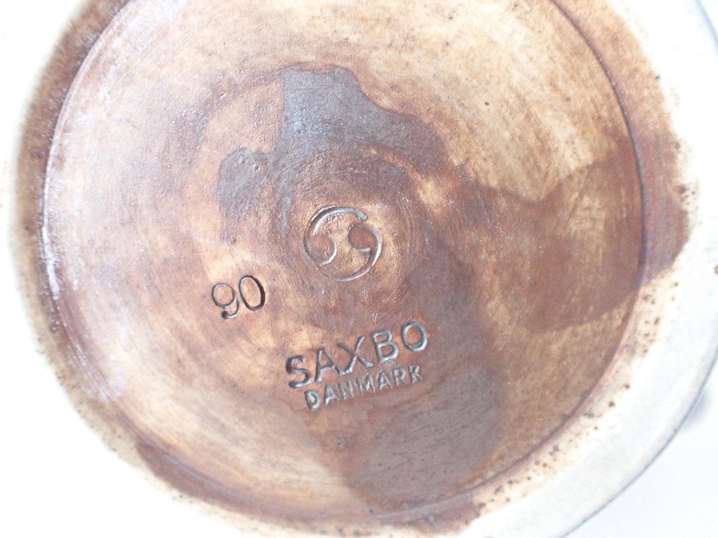 Saxbo (1938 - 1951) - buttet stentøjskande med blå harepelsglasur. Stemplet SAXBO, Danmark, # 90. Højde: 16 cm. I fin stand med lidt urævnhed i glasuren et sted på halsen.
