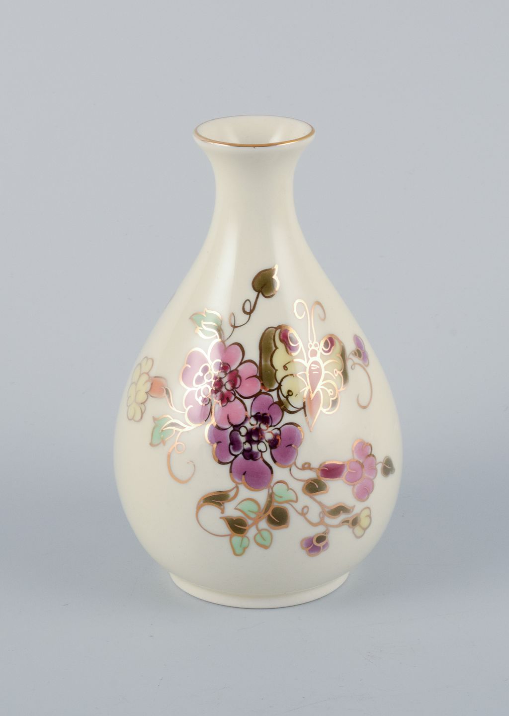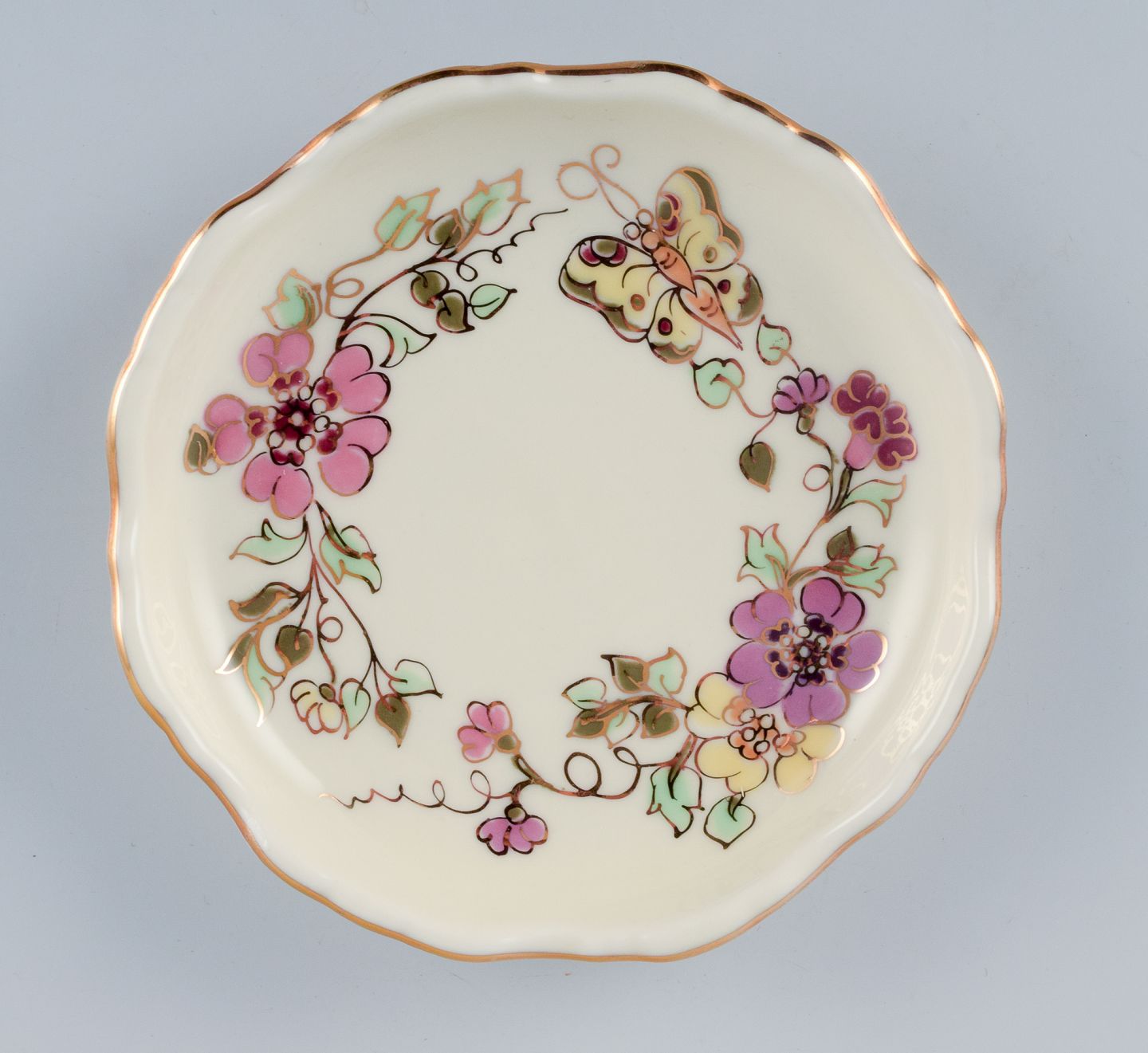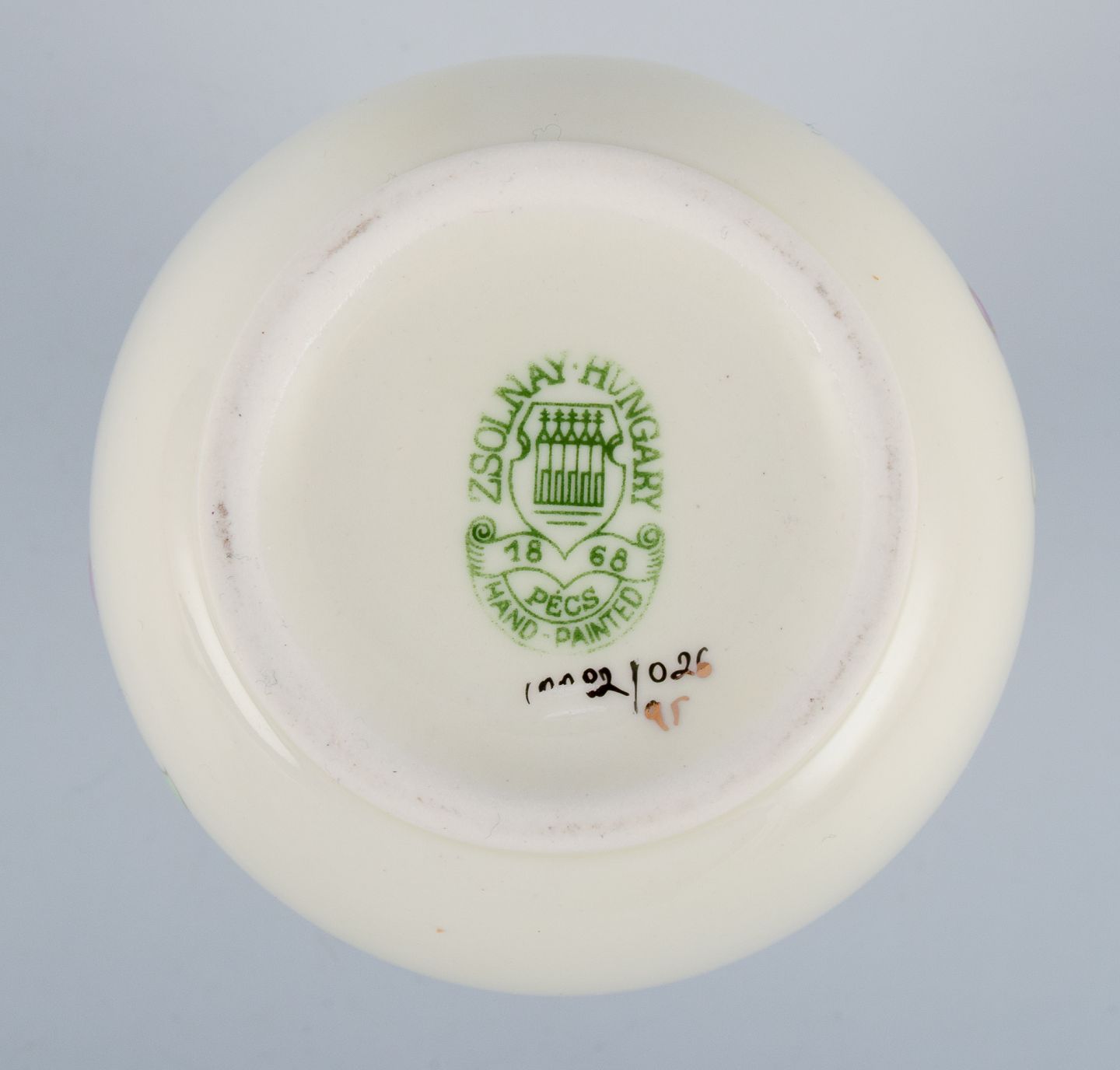 Zsolnay, Hungary, four-piece porcelain set consisting of three vases and a small dish. Hand-painted with flower motifs and insects on a cream-colored background.