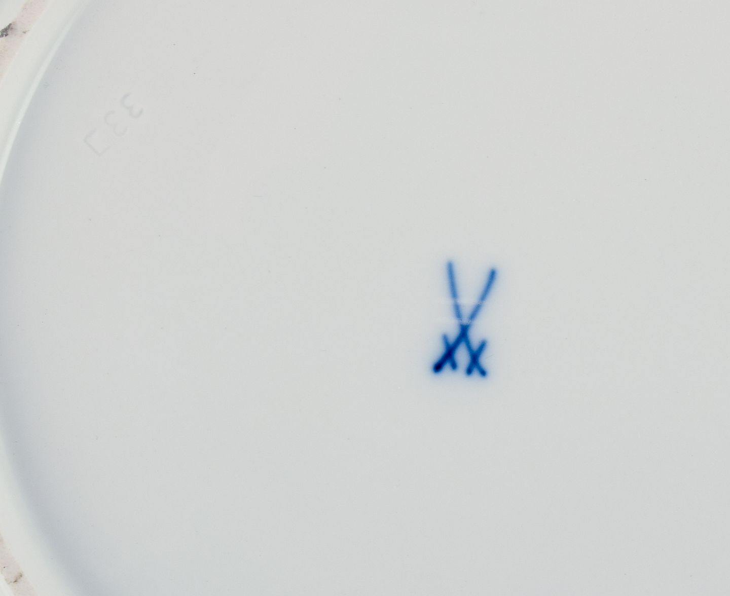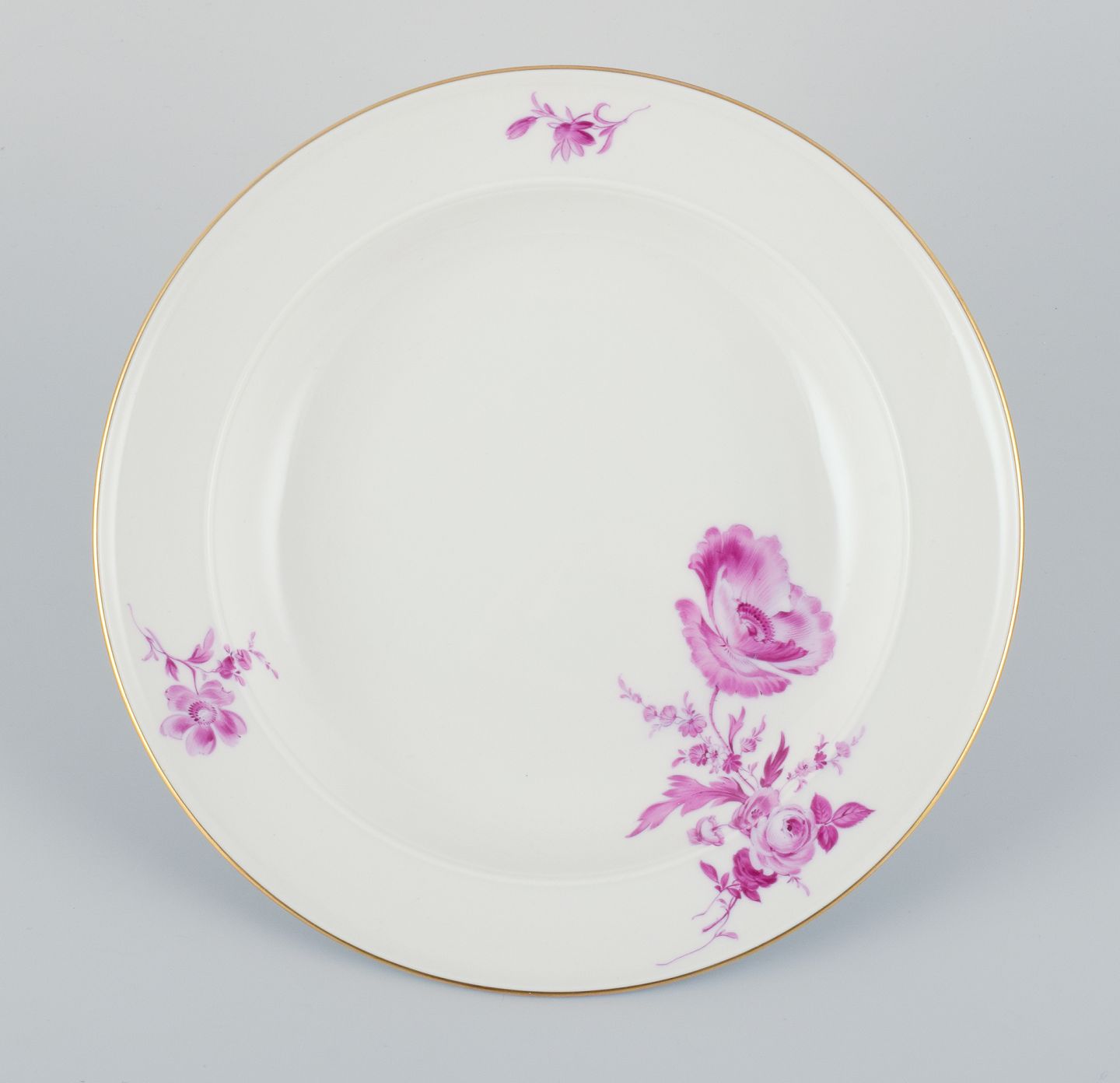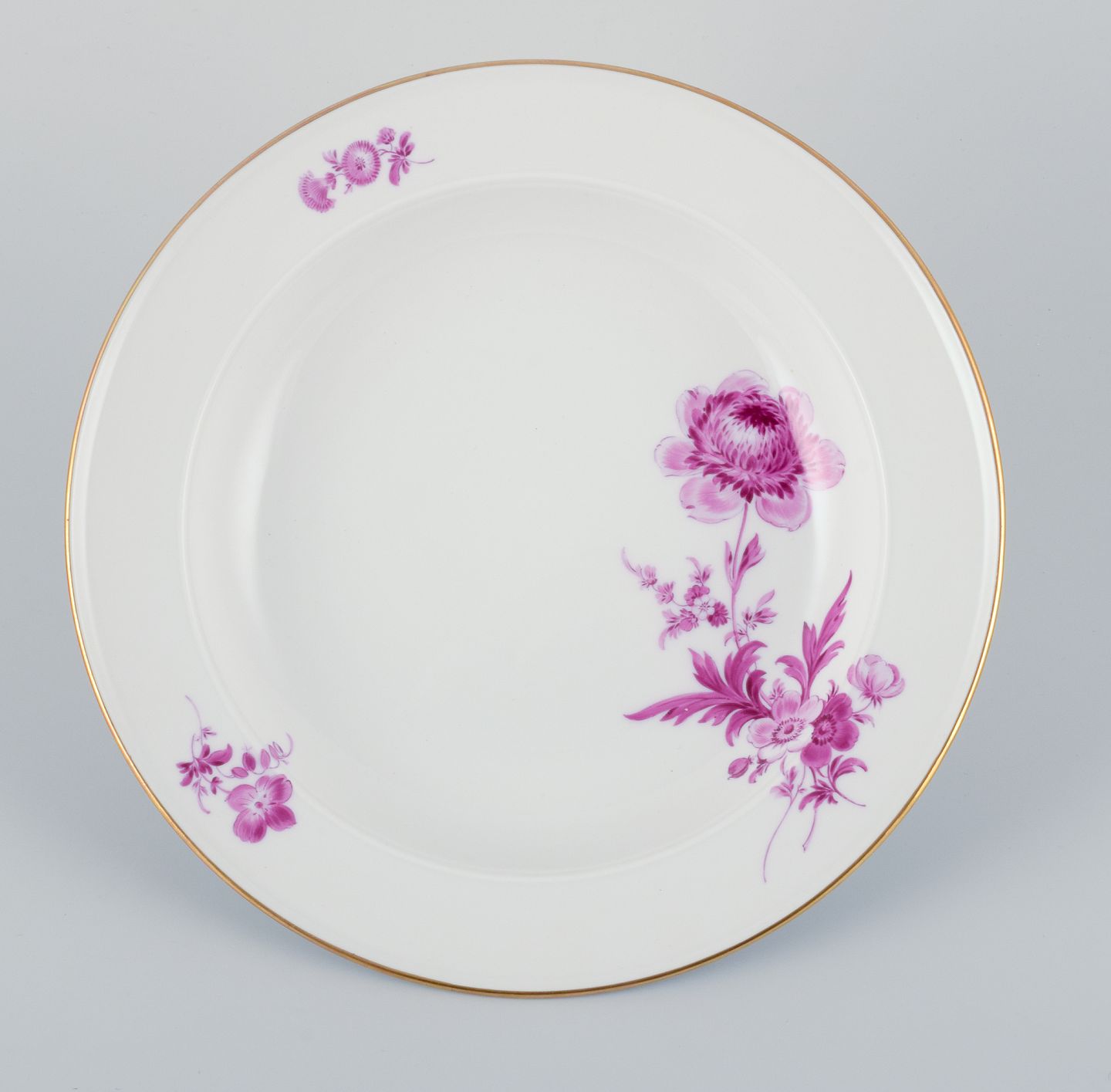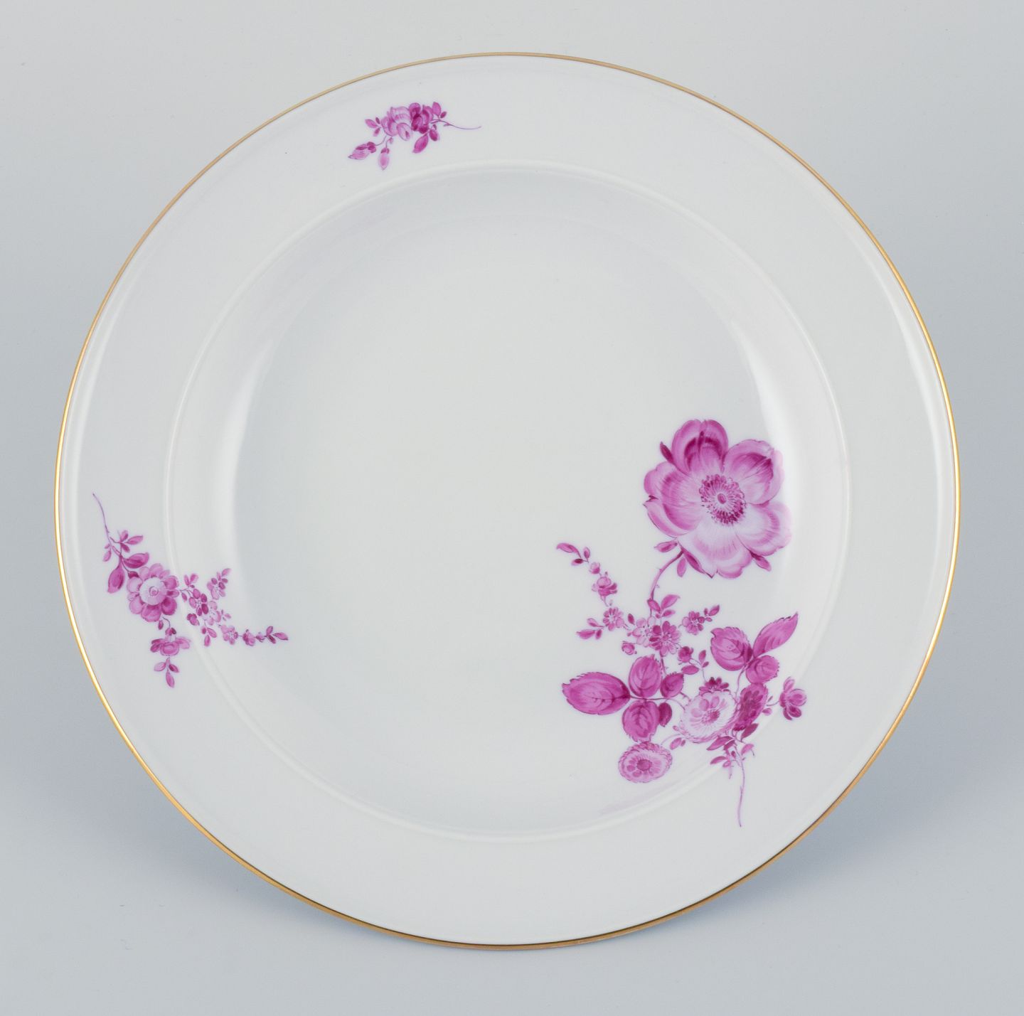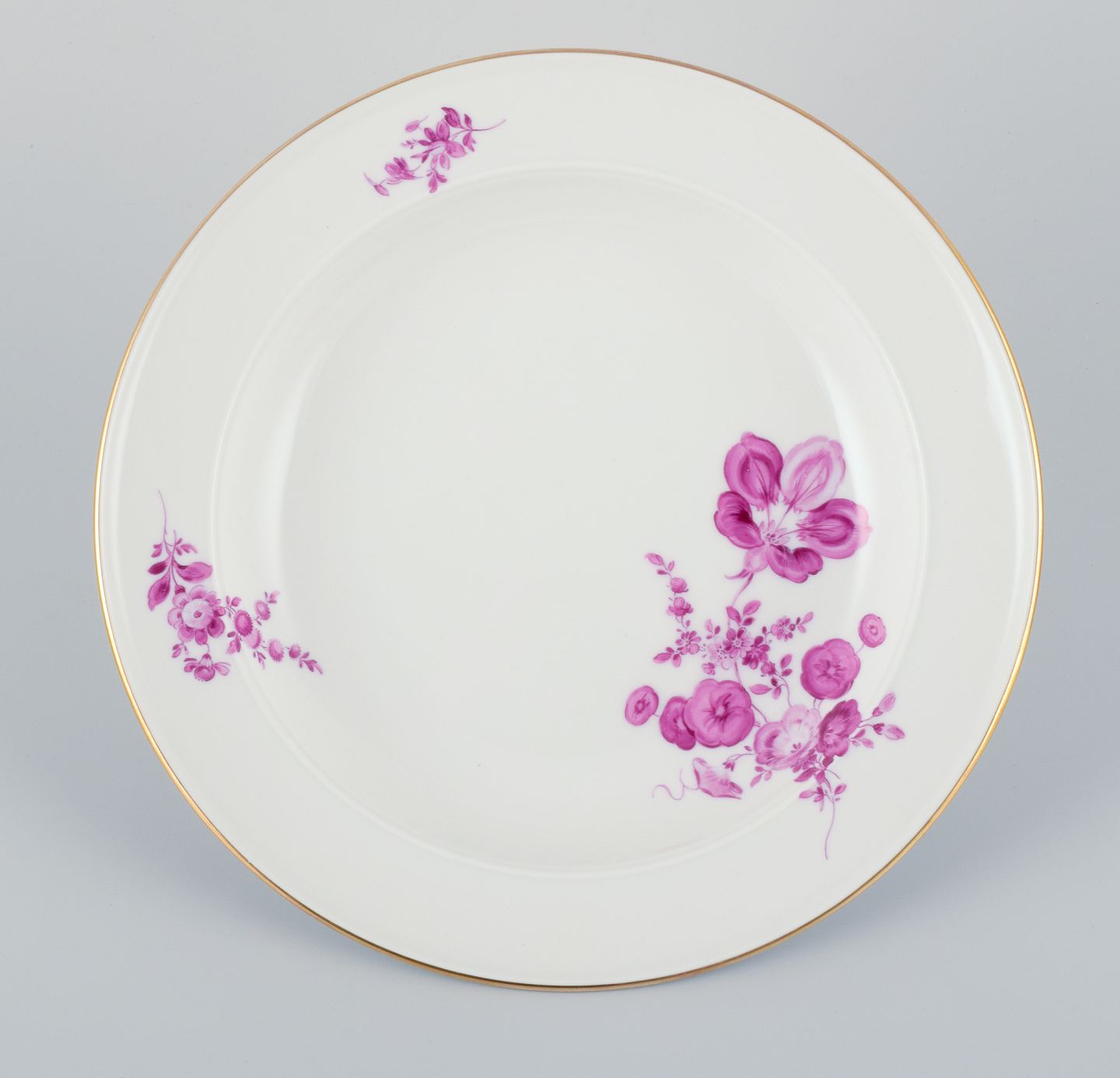 Meissen, et sæt på seks dybe porcelænstallerkner håndmalet med blomstermotiver i purpur. Gulddekoration på kant.