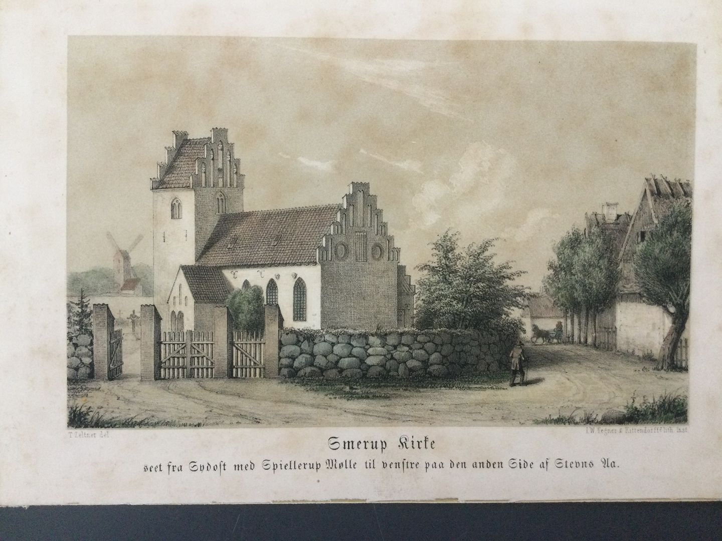 Litografi af Smerup Kirke på Stevns ca. 1850.