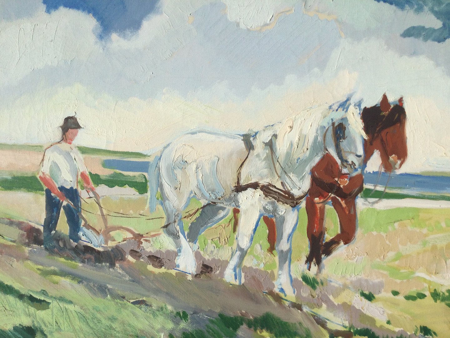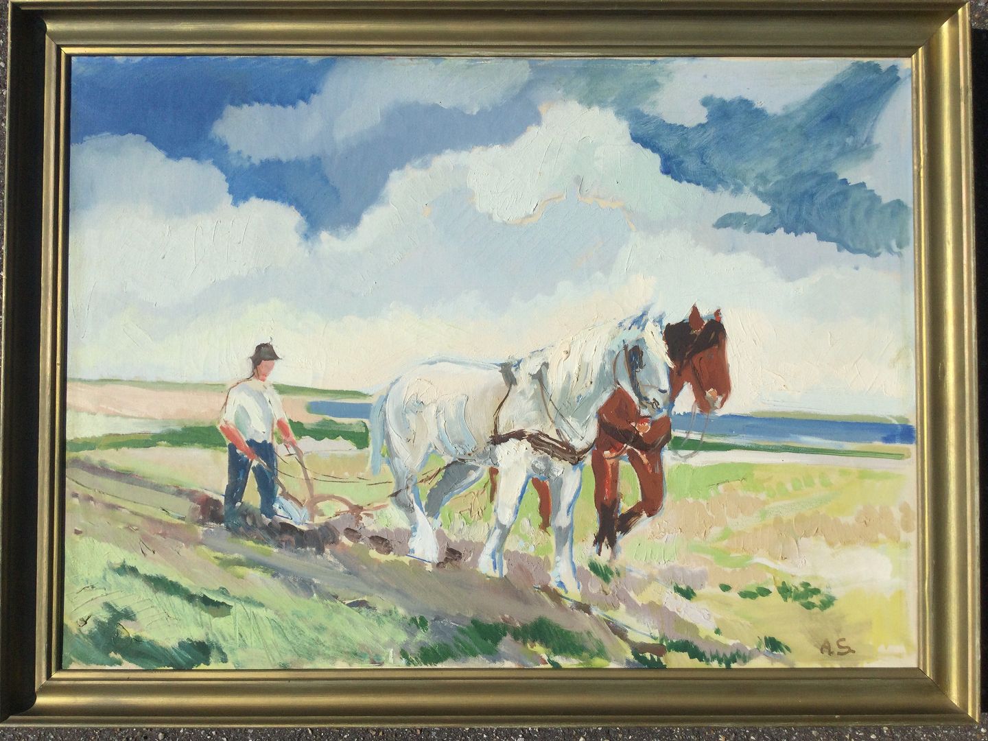 Maleri af Aage Strand - Landmand der pløjer marken med heste.