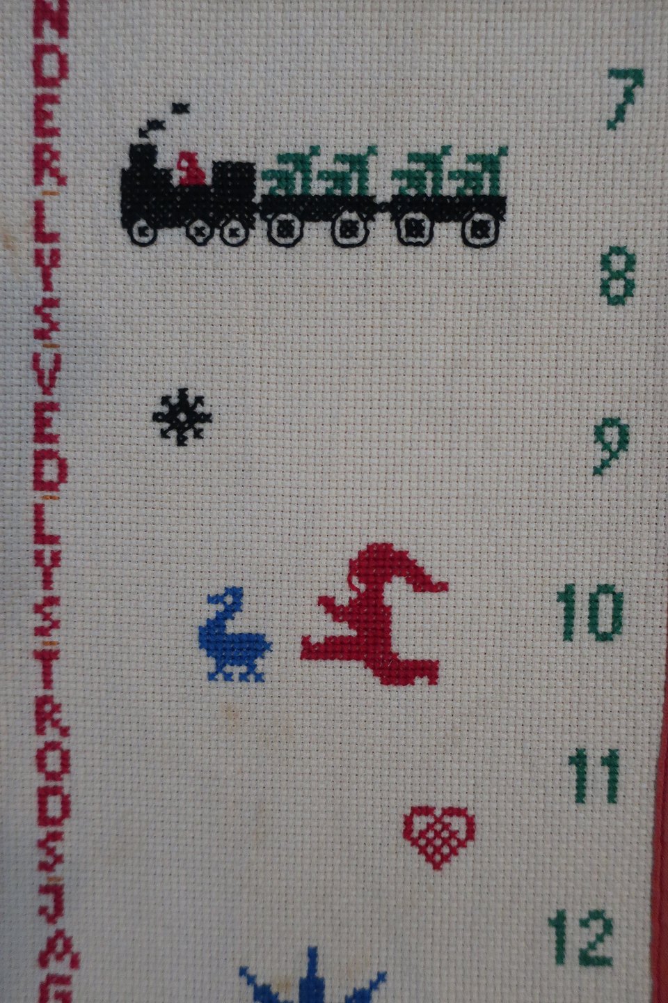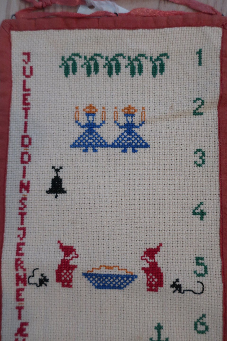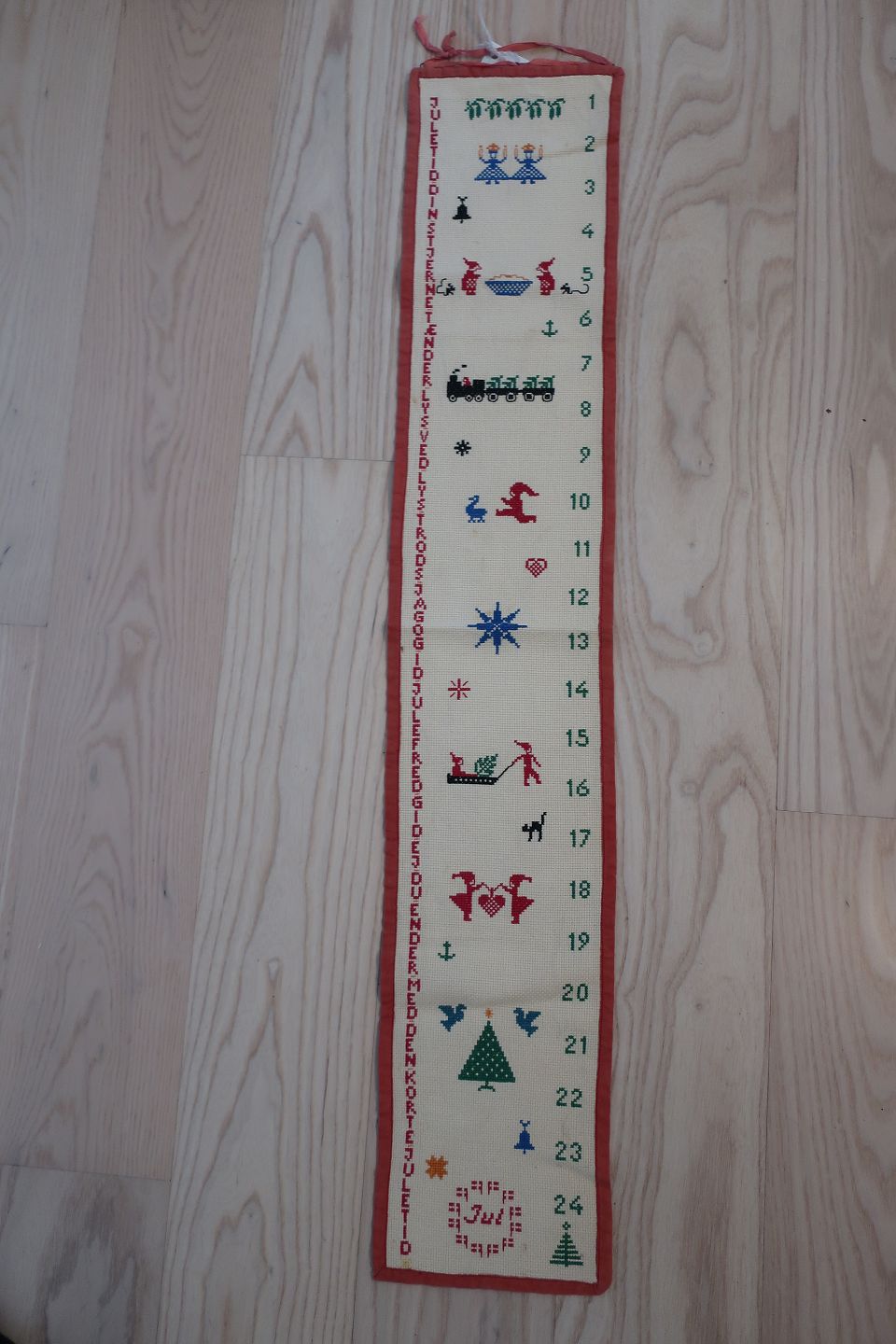 Smuk, gammel, håndbroderet pakkekalender med ringe til at binde pakkerne fast i