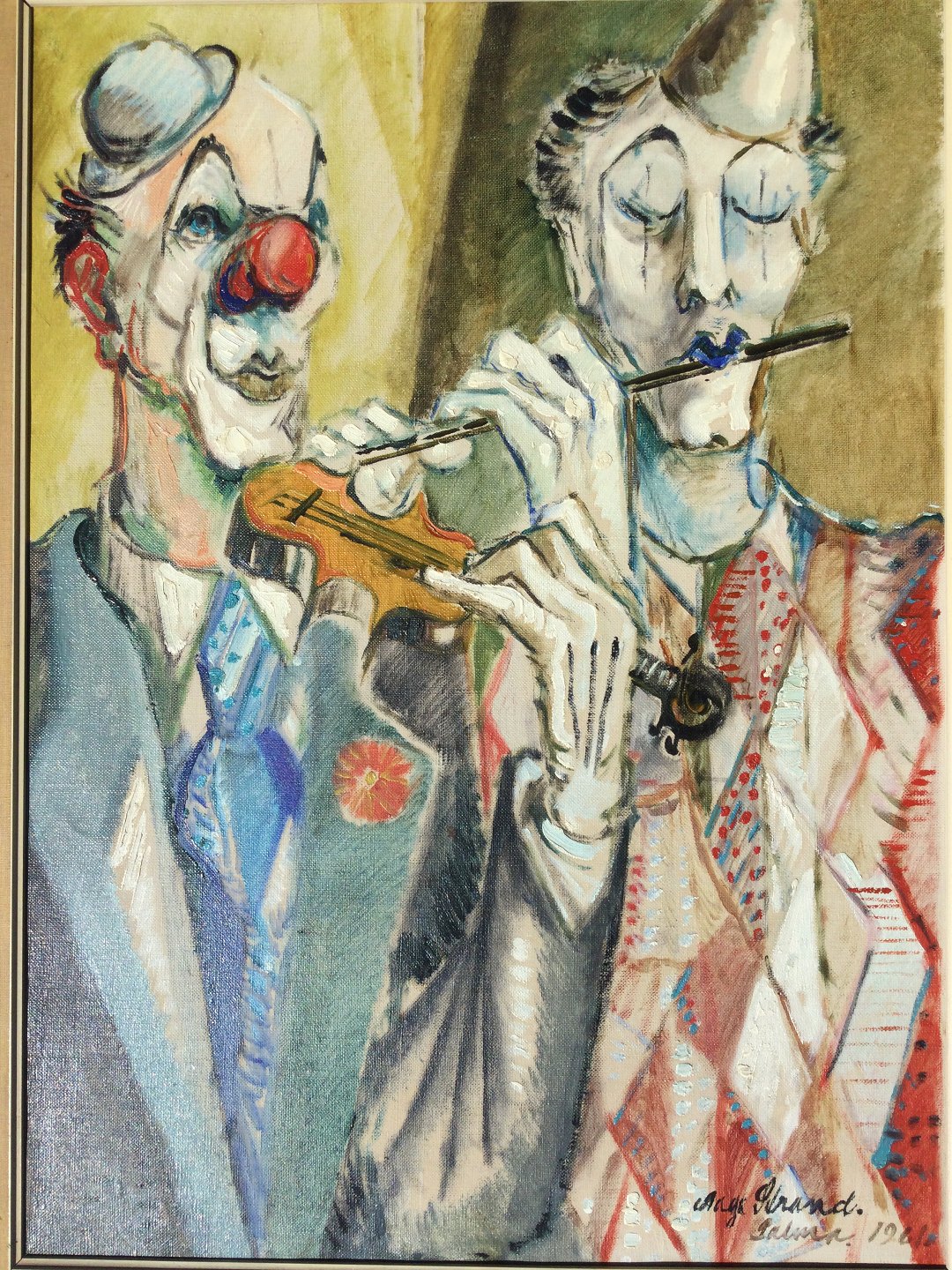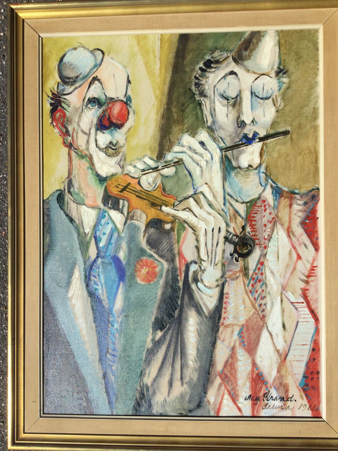 Maleri af Aage Strand - 2 musicerende klovne Palma 1961.