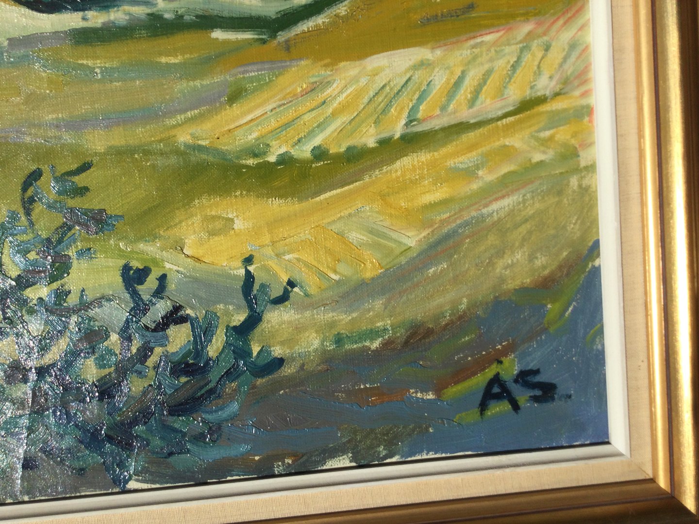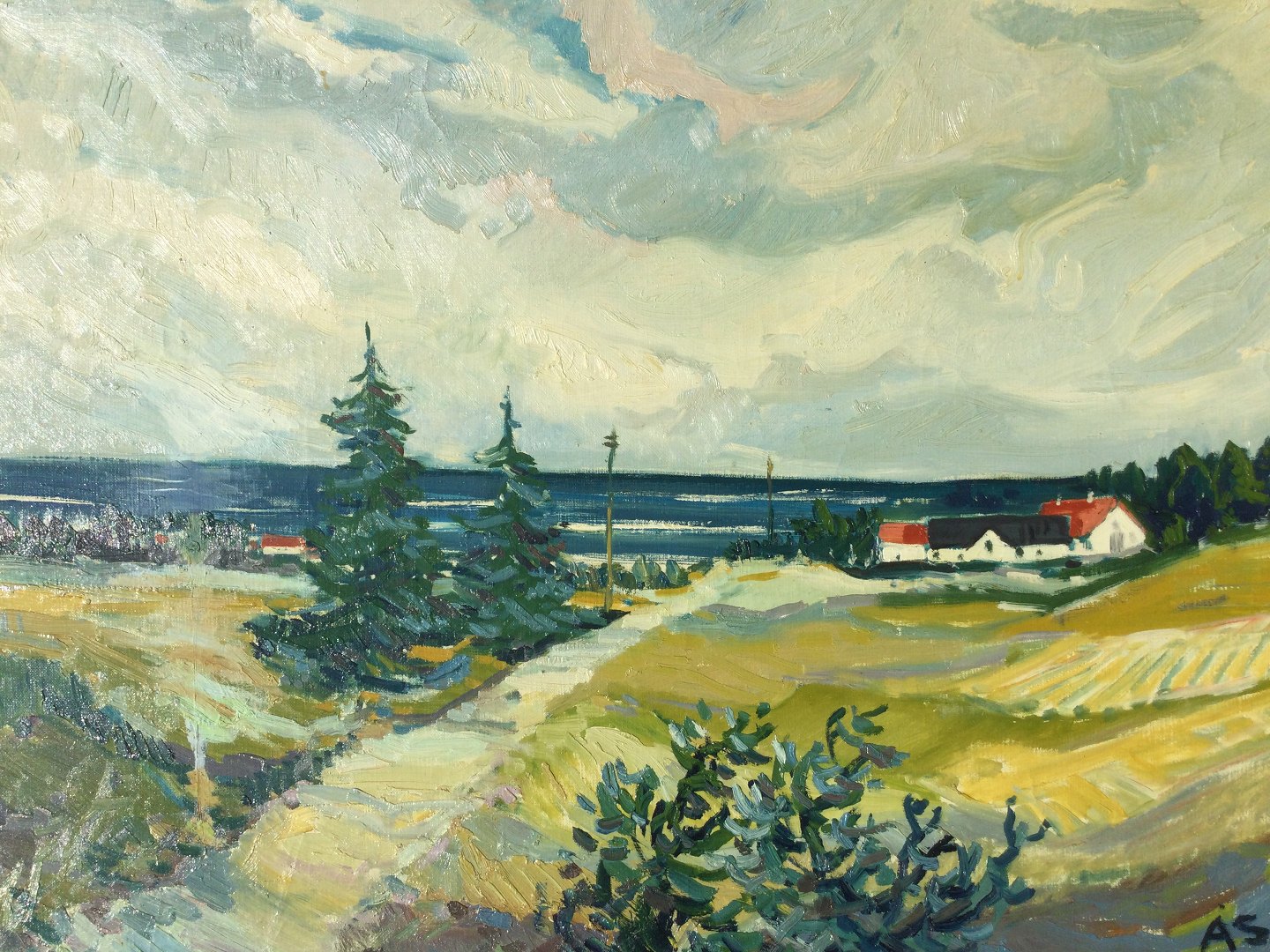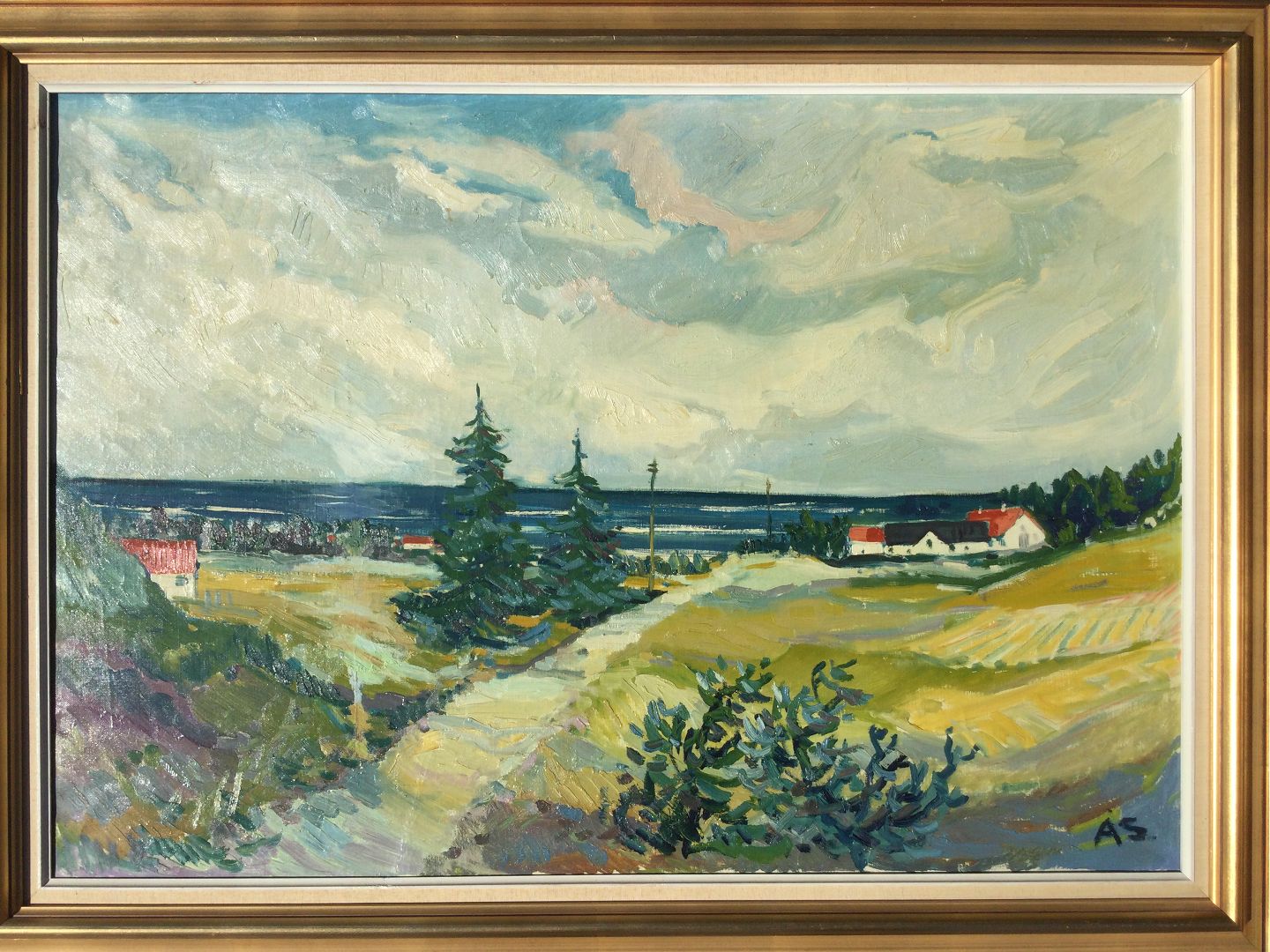 Maleri af Aage Strand - Klitlandskab med gårde og graner.