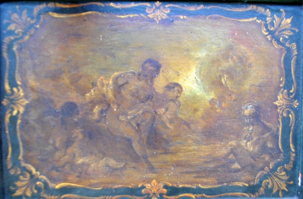 Antik bemalet træ bakke, 19. årh. Håndmalet motiv med scene efter F. Boucher. Kanten dekoreret med blomster og rococo mønster. 38 x 52 cm.