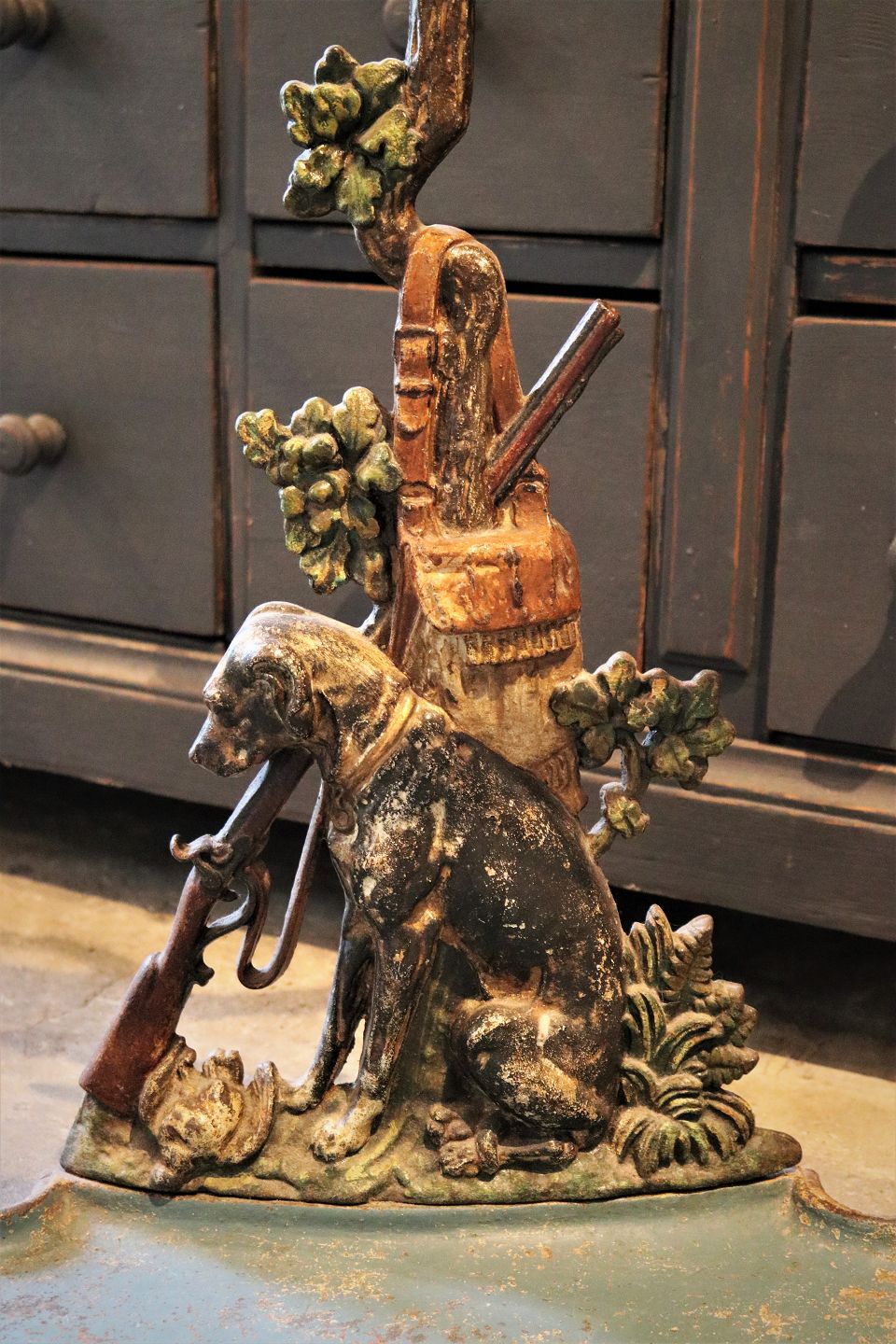 Gammelt 1800 tals paraply stativ i støbejern med jagt motiv